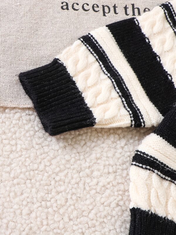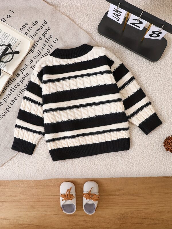 اجعلي شتاء طفلك مميزاً بأناقة ودفء لا يضاهى! نقدم لكِ السويتر المخطط الأسود والأبيض، المصمم خصيصاً ليمنح صغيرك راحة لا حدود لها ومظهراً كلاسيكياً جذاباً يلفت الأنظار. مثالي للأيام الباردة، هذا السويتر يجمع بين الجودة الفائقة والتصميم الخالد ليكون إضافة أساسية لخزانة ملابس طفلك.