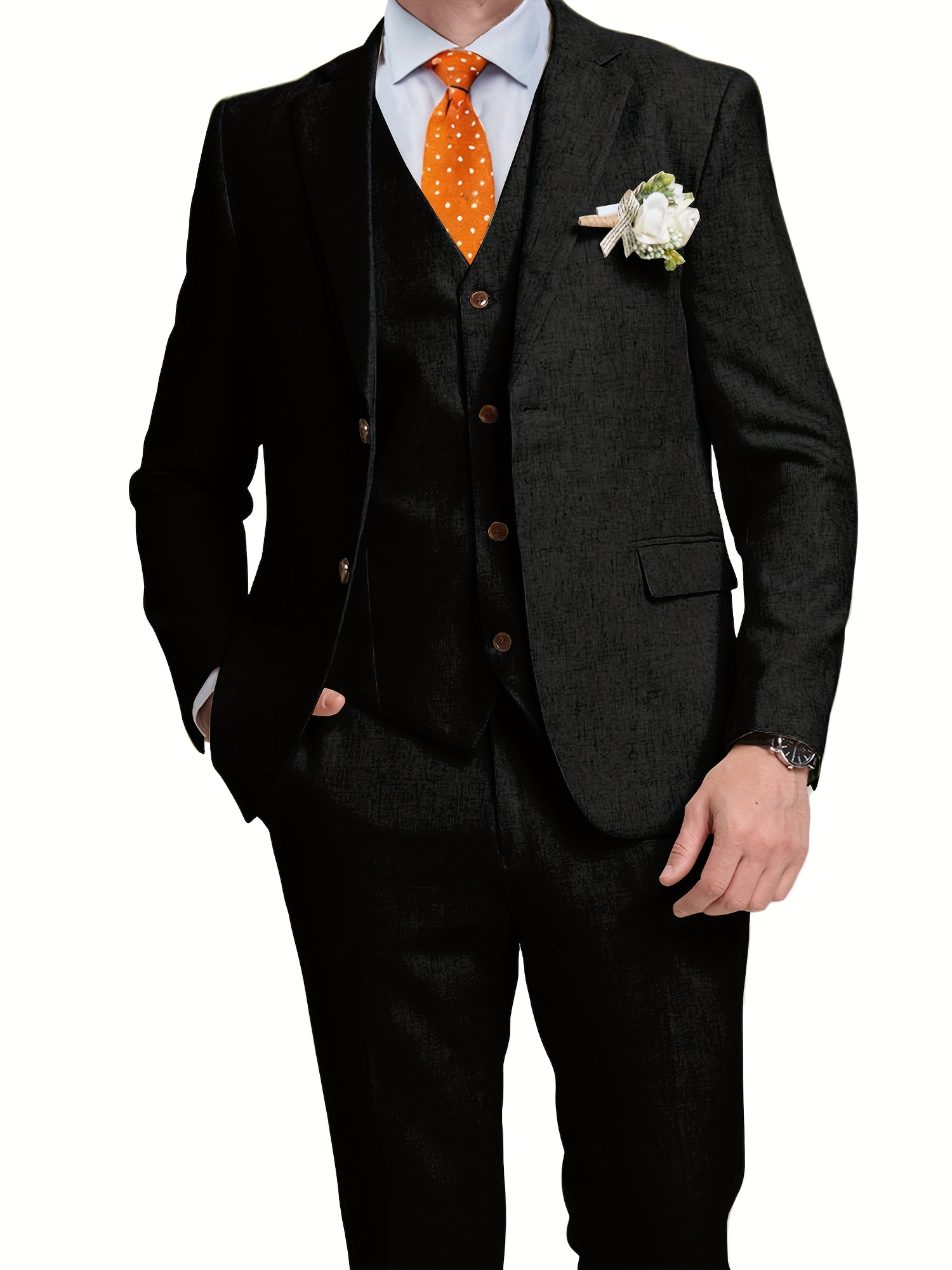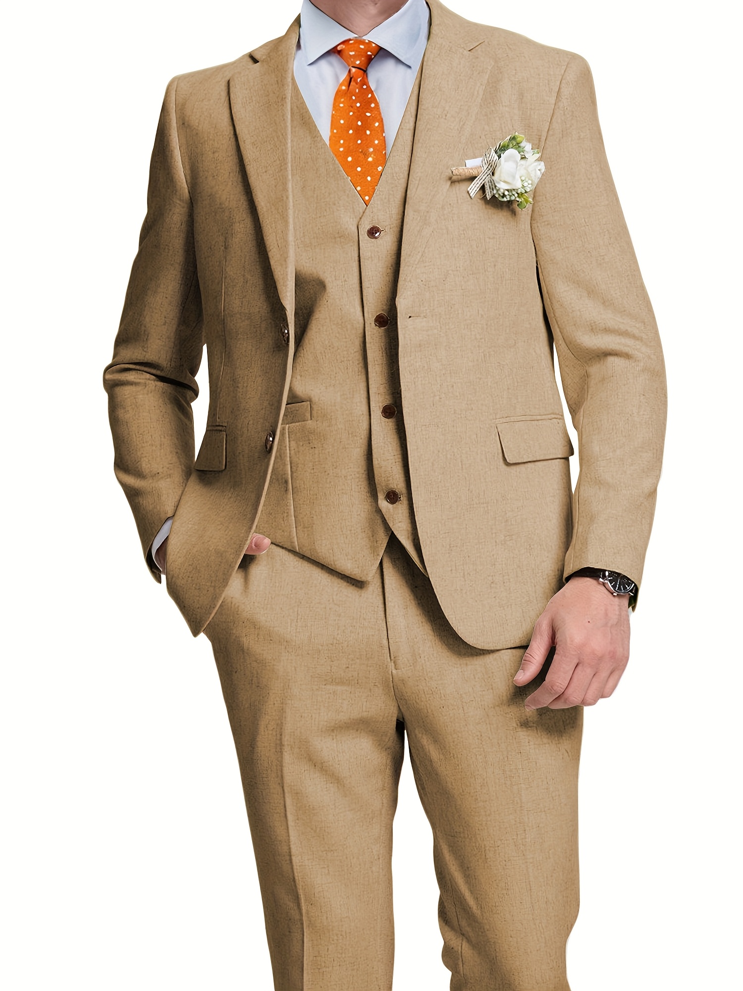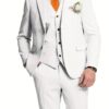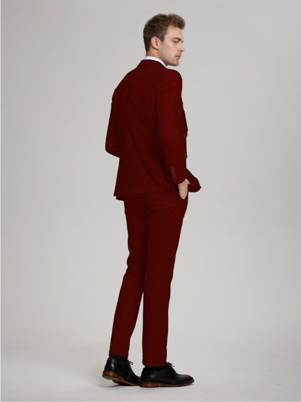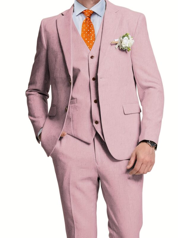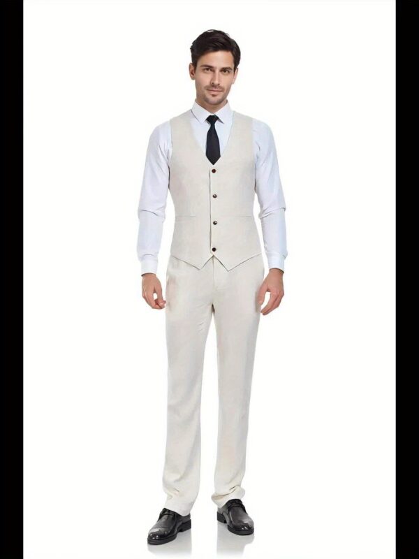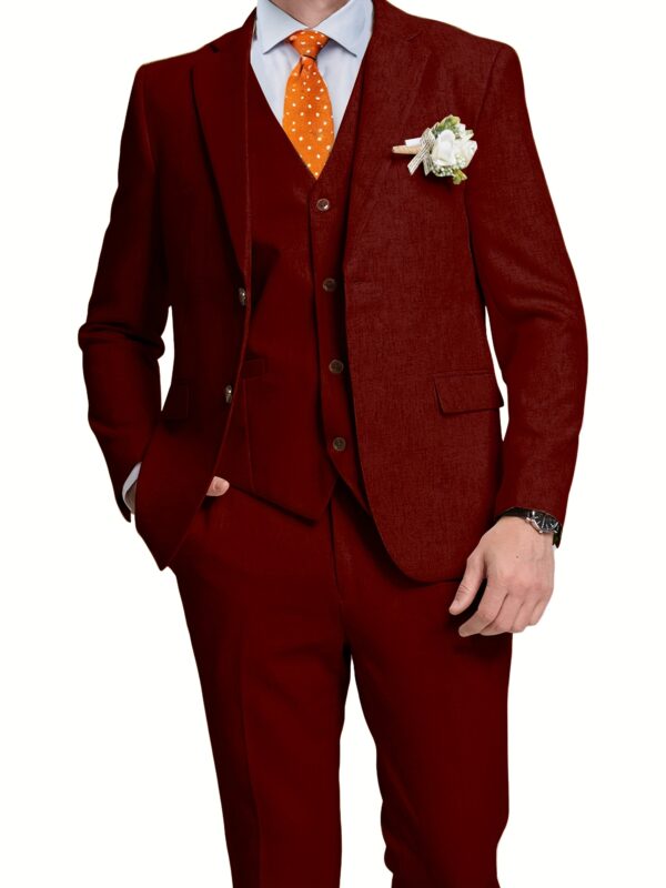 - تصميم ثلاثي القطع متكامل: يتضمن الطقم سترة أنيقة، سترة صدرية (فيست) كلاسيكية، وبنطالًا بقصة عصرية، مما يمنحك خيارات متعددة للتنسيق وإطلالات مختلفة تناسب كل حدث، من الرسمي إلى الأنيق غير الرسمي.