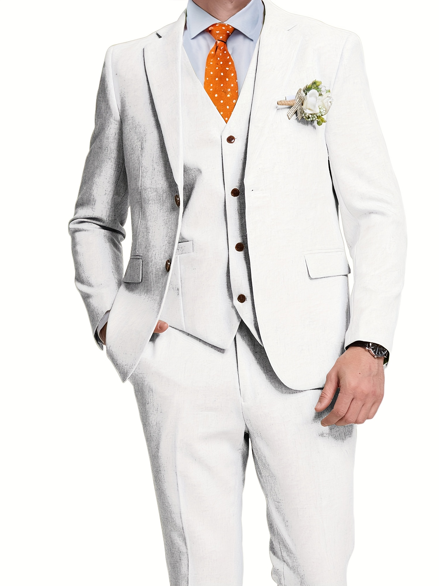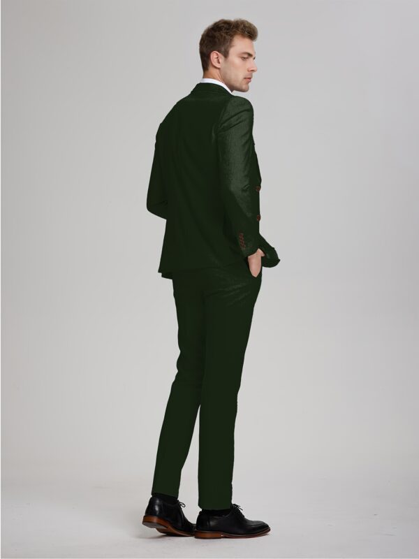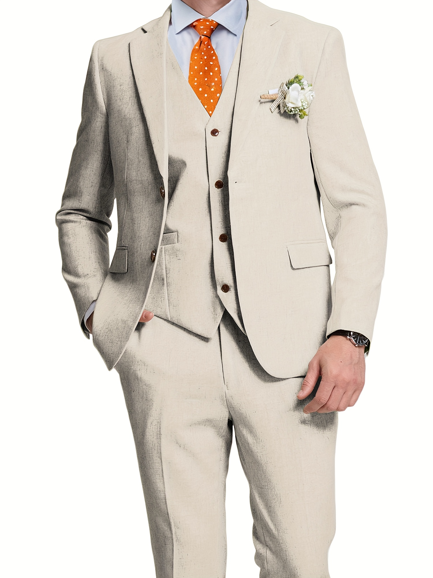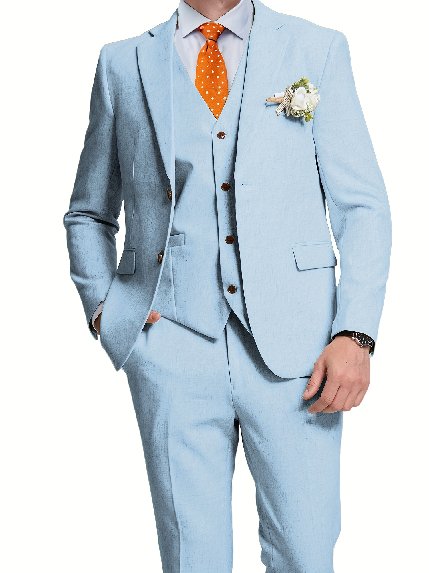 - تصميم ثلاثي القطع متكامل: يتضمن الطقم سترة أنيقة، سترة صدرية (فيست) كلاسيكية، وبنطالًا بقصة عصرية، مما يمنحك خيارات متعددة للتنسيق وإطلالات مختلفة تناسب كل حدث، من الرسمي إلى الأنيق غير الرسمي.