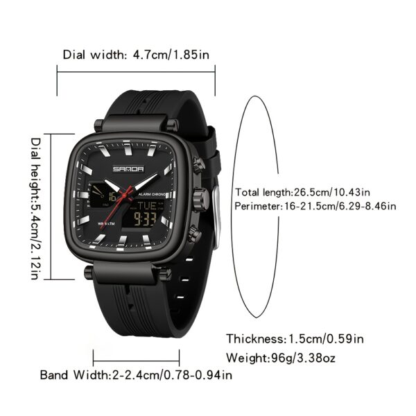 اكتشف مزيجًا فريدًا من الأناقة العصرية والأداء العملي مع ساعة SANDA الرجالية ذات التصميم المربع الأنيق. صُممت لتكون أكثر من مجرد أداة لمعرفة الوقت، بل رفيقًا موثوقًا يعكس ذوقك الرفيع ويواكب إيقاع حياتك النشط. سواء كنت في اجتماع عمل، أو تستمتع بنزهة غير رسمية، أو تمارس رياضتك المفضلة، فإن هذه الساعة هي الإضافة المثالية لإطلالتك، والهدية الأمثل لمن تحب.