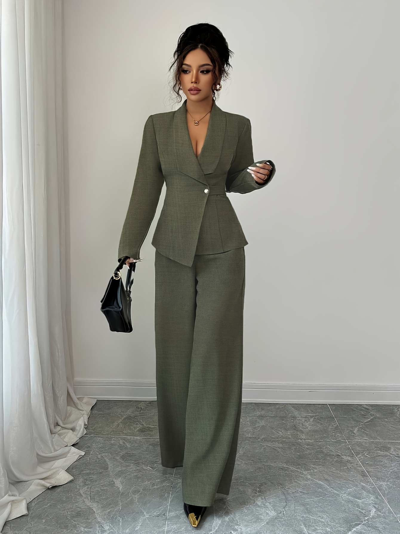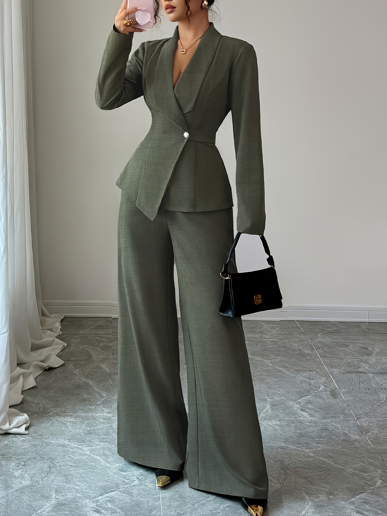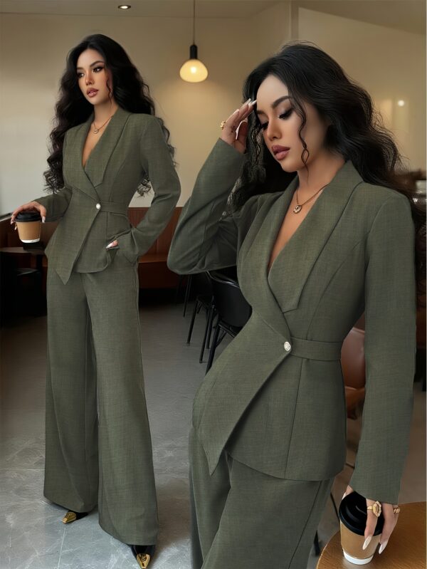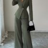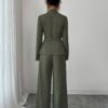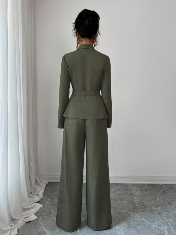 • تصميم فريد وجذاب: يتميز الجاكيت بتصميم ياقة V أنيق وأكمام طويلة، مع حزام مميز وأزرار تضفي لمسة من الرقي والفخامة. يتناسق معه بنطلون بقصة مستقيمة وأرجل واسعة يضفي عليكِ طولًا ورشاقة.