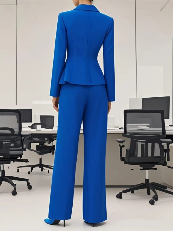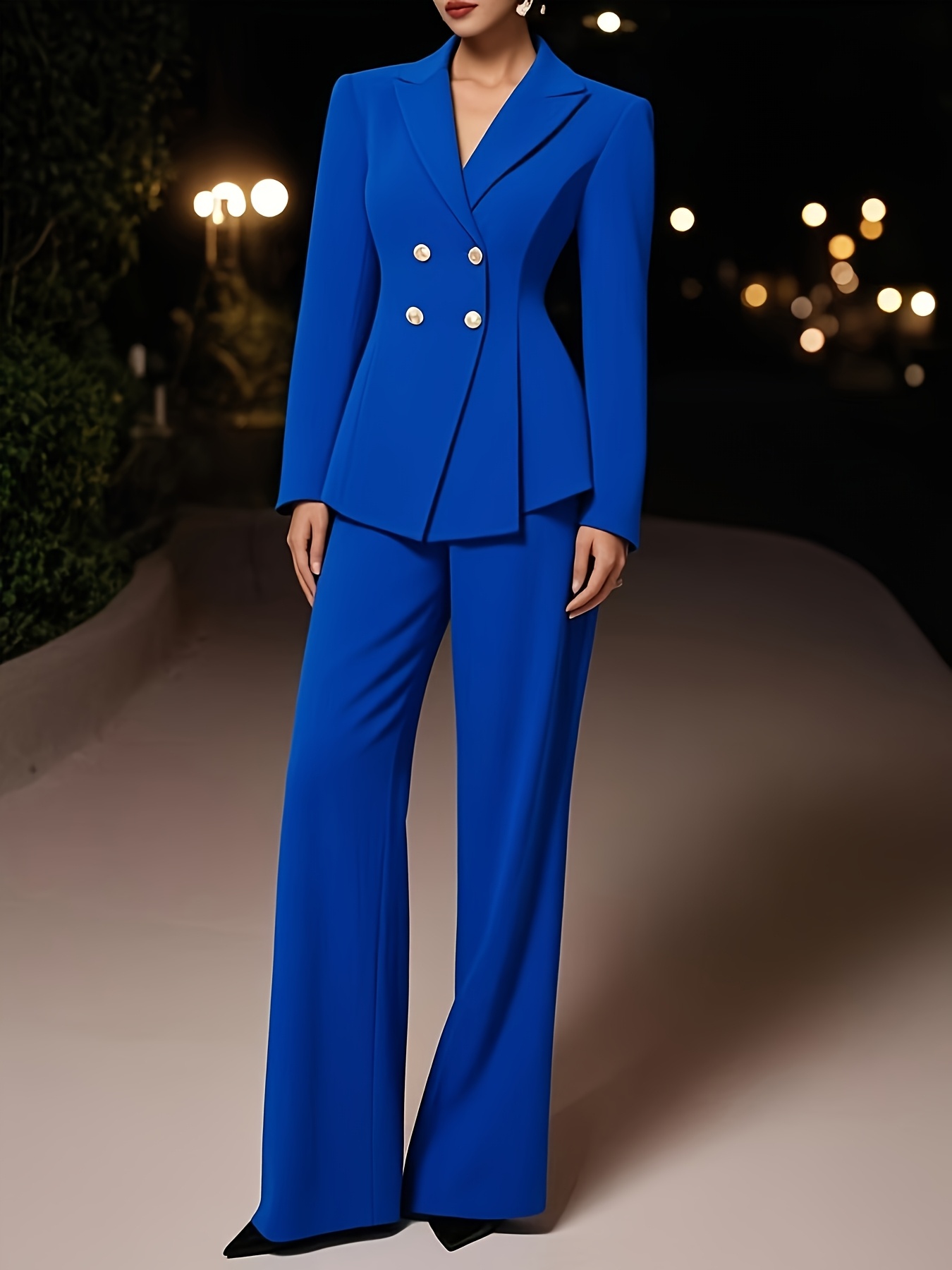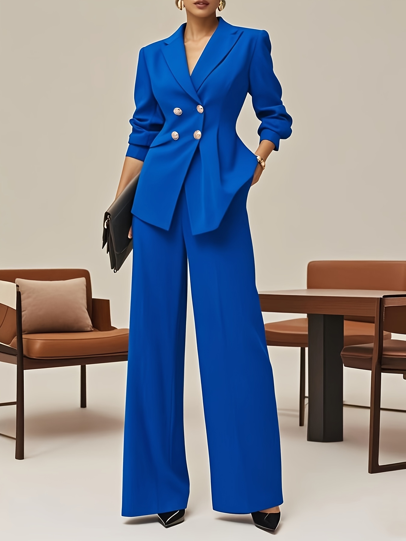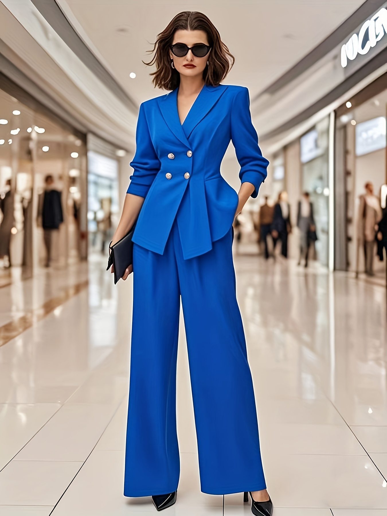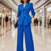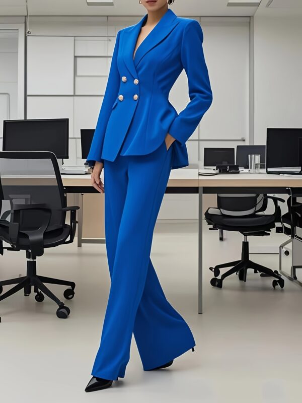 - تفاصيل أنيقة: يتميز بتصميم ياقة مطوية (لابل) وأكمام طويلة، مع إغلاق أمامي مزدوج الصدر يضفي لمسة كلاسيكية فاخرة ومميزة.