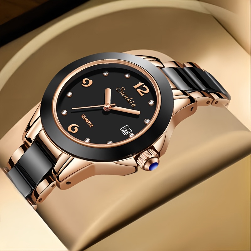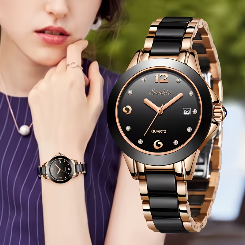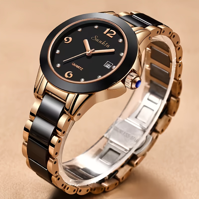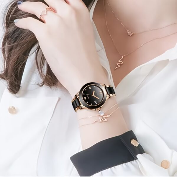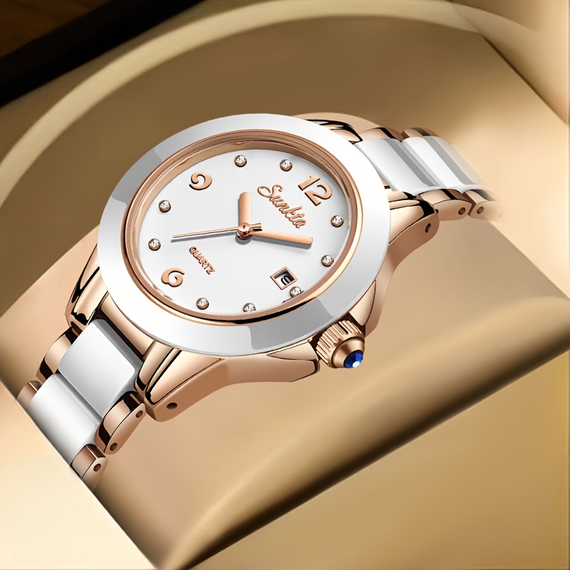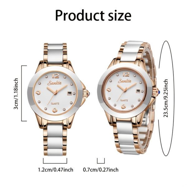 - مواد عالية الجودة: هيكل متين مصنوع من سبائك الزنك المقاومة، مع سوار من الخزف (البورسلين) الفاخر يضمن الراحة الفائقة والمتانة الطويلة، بالإضافة إلى مظهر فريد لا يُضاهى.