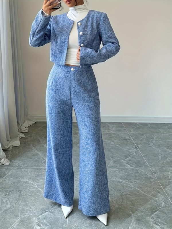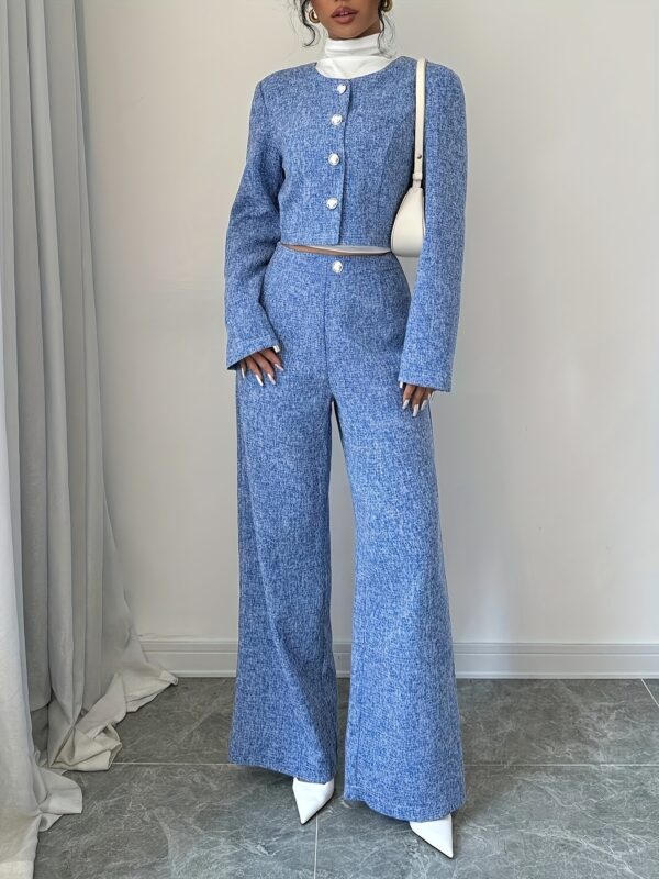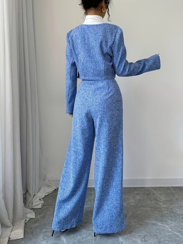 - تصميم يفيض بالرقي: يتميز الجاكيت بقصة أنيقة بزر واحد وياقة دائرية كلاسيكية، تكملها سراويل واسعة الساق تمنحك حركة مريحة وإطلالة أنيقة وعصرية. اللون الموحد يجعله قطعة أساسية سهلة التنسيق.