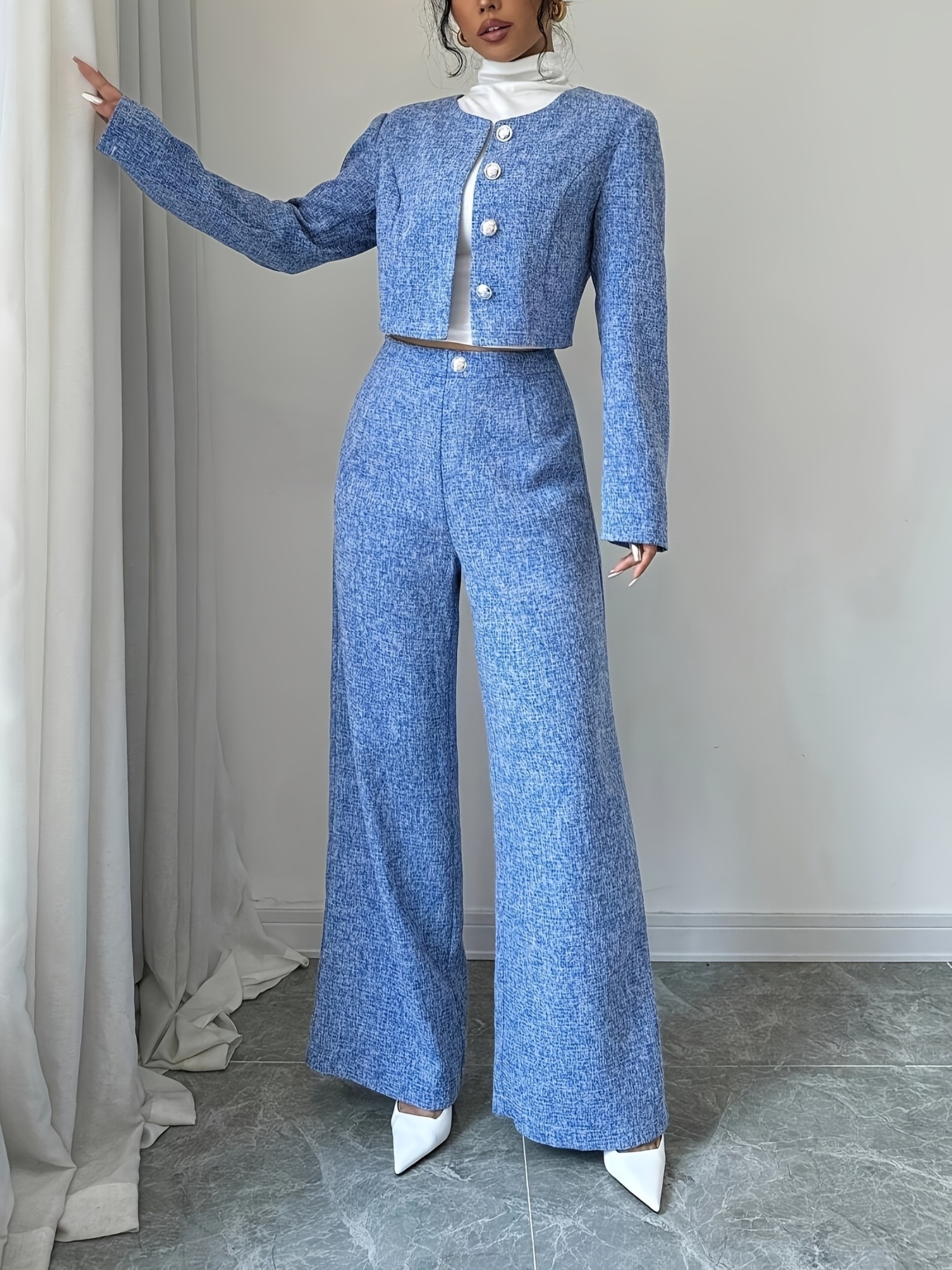- تصميم يفيض بالرقي: يتميز الجاكيت بقصة أنيقة بزر واحد وياقة دائرية كلاسيكية، تكملها سراويل واسعة الساق تمنحك حركة مريحة وإطلالة أنيقة وعصرية. اللون الموحد يجعله قطعة أساسية سهلة التنسيق.