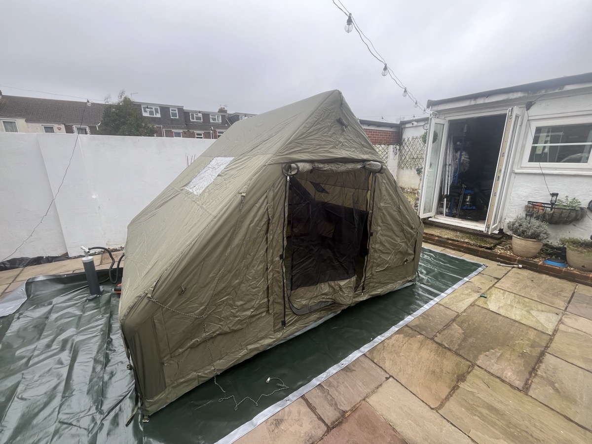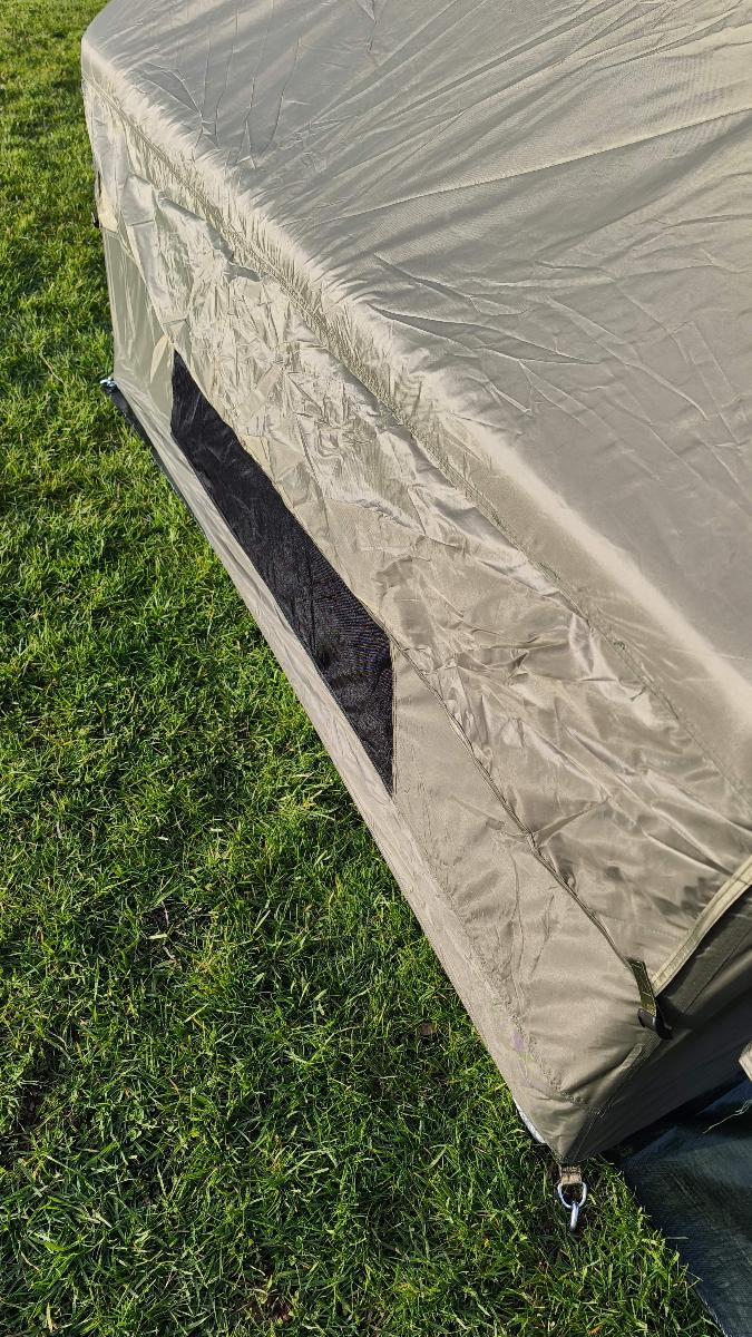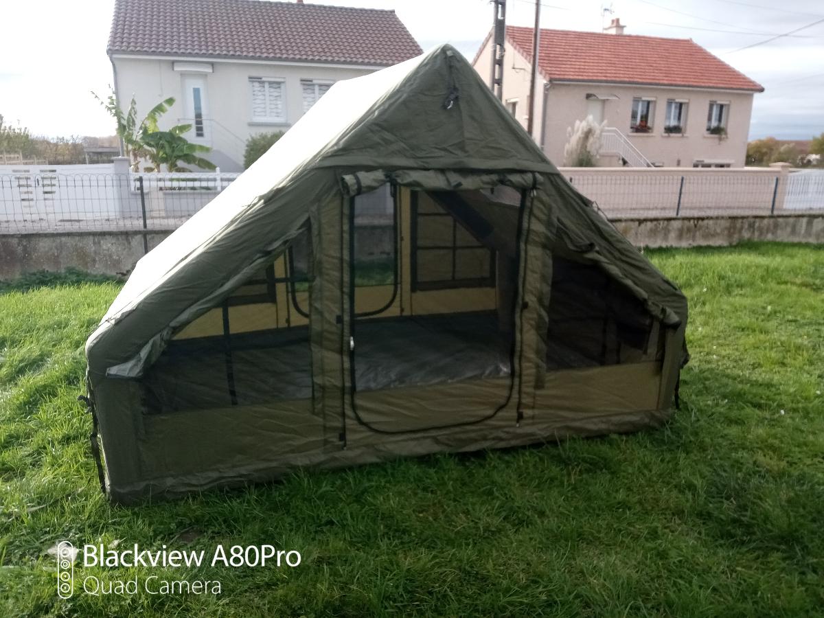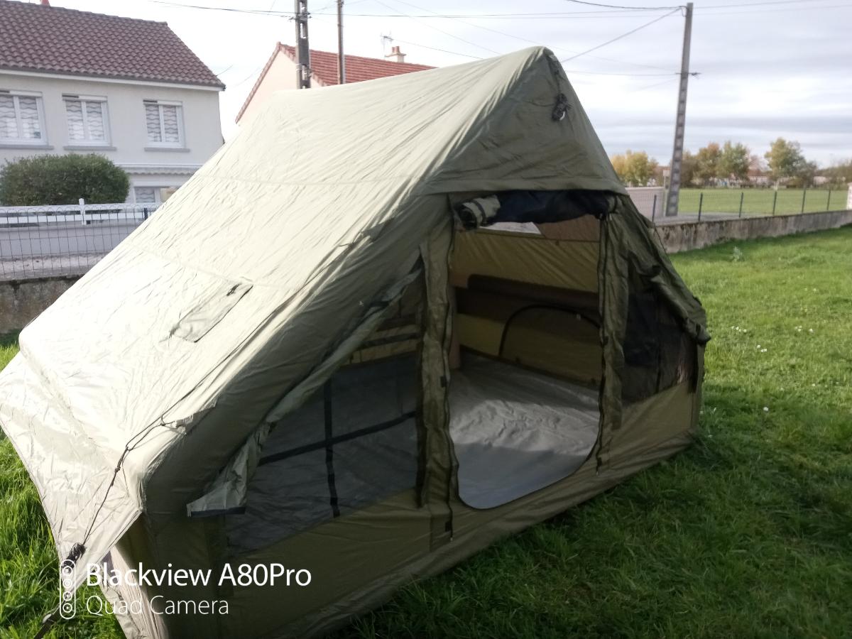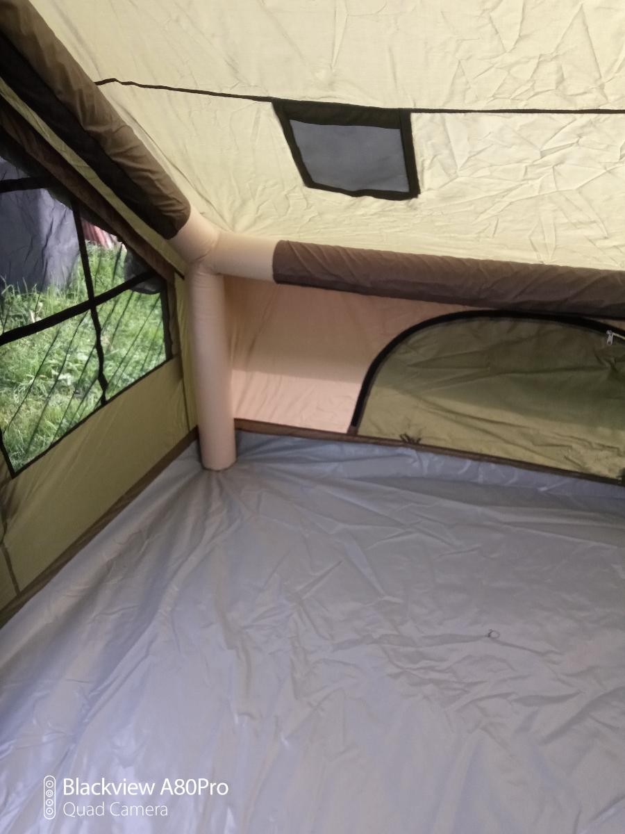 I have used the tent once now and I am very satisfied. I pumped it up 10 times with the pump and it stands upright. It has plenty of light and air circulation. Two large stretchers plus a wood stove can fit inside. I would definitely wrap the stove's chimney with fire-resistant material, as shown in the video, just to be safe. I would like to test more products from this manufacturer.