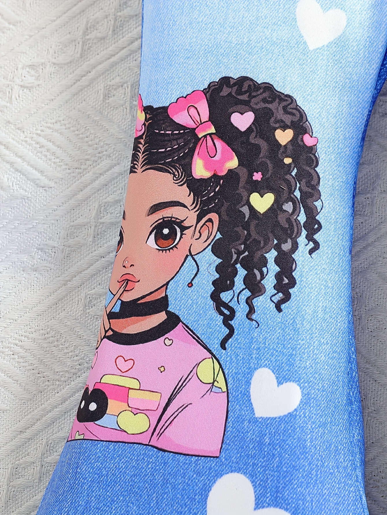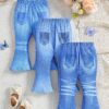 • تصميم فريد وعصري: يتميز الطقم بطبعة “جينز كاذب” أنيقة وتصميم كرتوني جذاب، مع قصة بنطال جرس عصرية تضفي لمسة من التميز والأناقة على إطلالة صغيرتك.