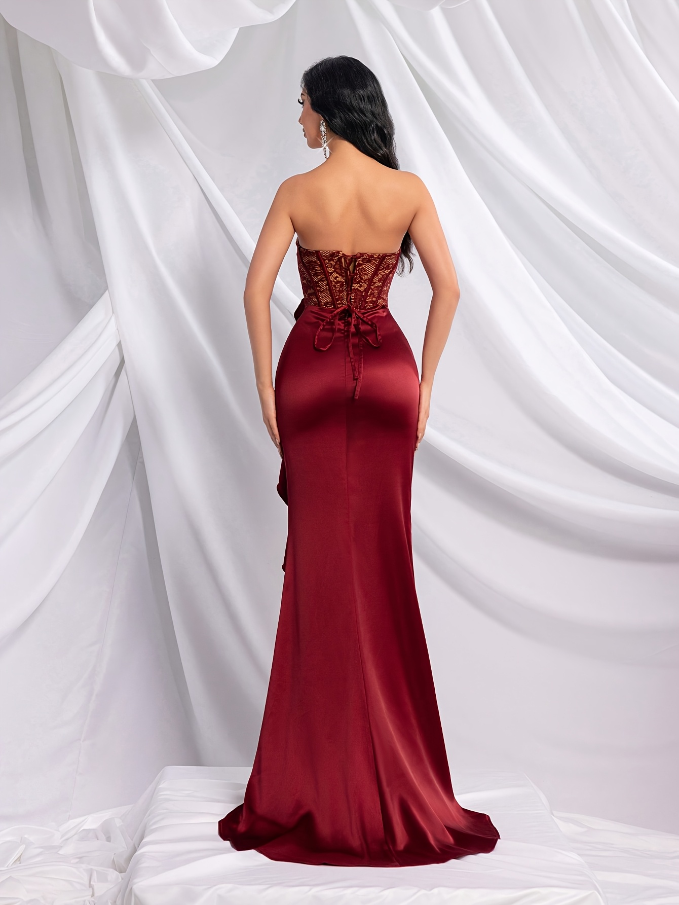 • تصميم فريد: يتميز بقصة التوب الأنبوبي (بدون حمالات) التي تبرز جمال الكتفين، مع قصة ضيقة ومُحكمة تُظهر رشاقة القوام بشكل أنيق ومُبهر.