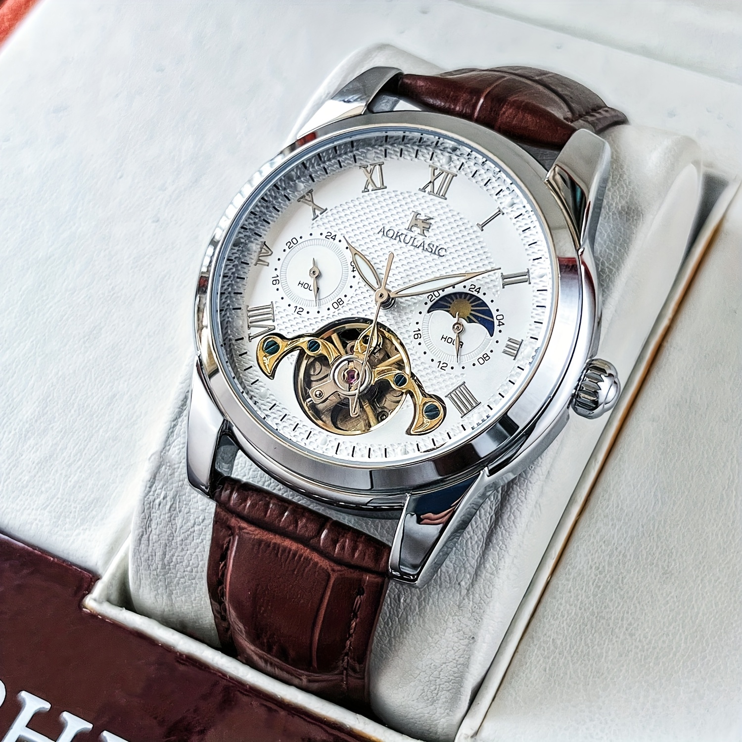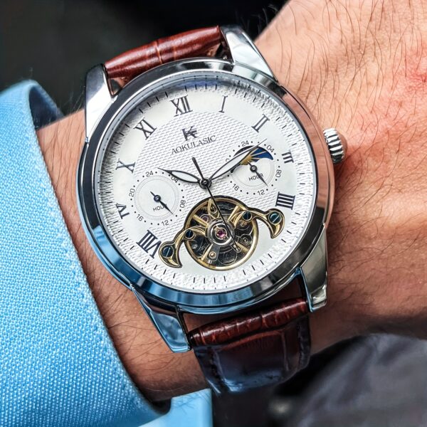 - ميكانيكية أوتوماتيكية راقية: وداعاً للبطاريات؛ تعتمد هذه الساعة الميكانيكية الأوتوماتيكية بالكامل على حركة معصمك لتزويدها بالطاقة، مما يجسد أرقى فنون صناعة الساعات التقليدية بدقة متناهية.
