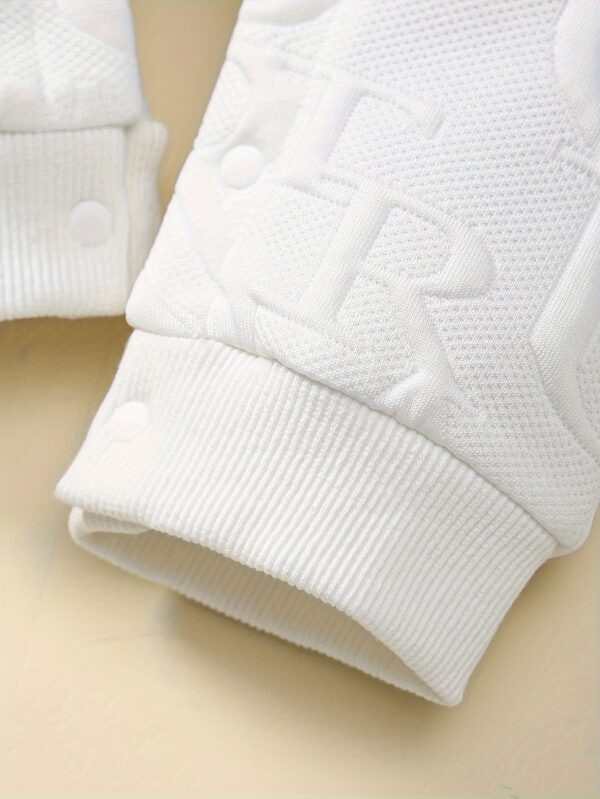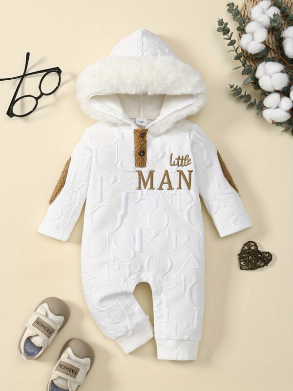 - تصميم عصري وجذاب: يتميز بطبعة حروف ‘الرجل الصغير’ العصرية والمرحة، بالإضافة إلى تفاصيل التطريز (patchwork) والجاكار التي تضفي لمسة فريدة ومميزة على مظهر طفلك.