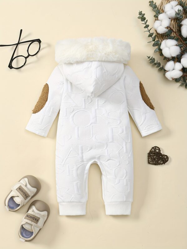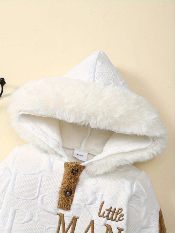 - تفاصيل دافئة ومميزة: يتميز بأكمام طويلة مزودة بغطاء رأس (هودي) وياقة من الفرو الدافئ لدفء إضافي، مع تفاصيل أزرار وتطريز (patched) تزيد من جاذبيته.