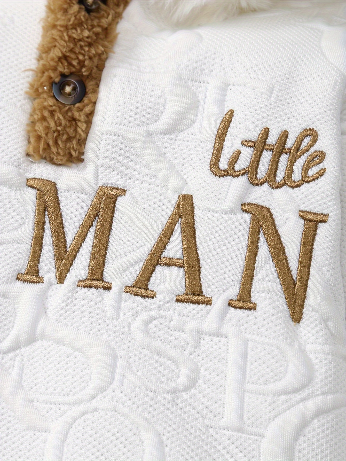 - تصميم عصري وجذاب: يتميز بطبعة حروف ‘الرجل الصغير’ العصرية والمرحة، بالإضافة إلى تفاصيل التطريز (patchwork) والجاكار التي تضفي لمسة فريدة ومميزة على مظهر طفلك.
