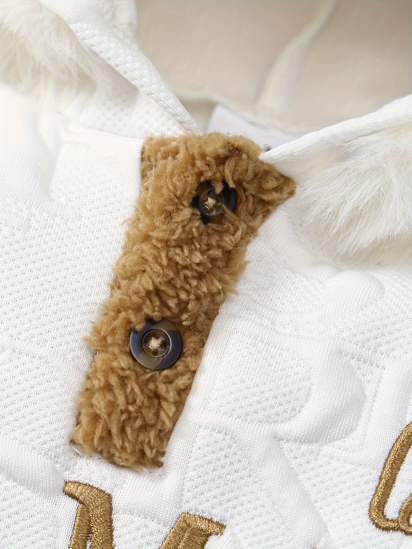 - تفاصيل دافئة ومميزة: يتميز بأكمام طويلة مزودة بغطاء رأس (هودي) وياقة من الفرو الدافئ لدفء إضافي، مع تفاصيل أزرار وتطريز (patched) تزيد من جاذبيته.