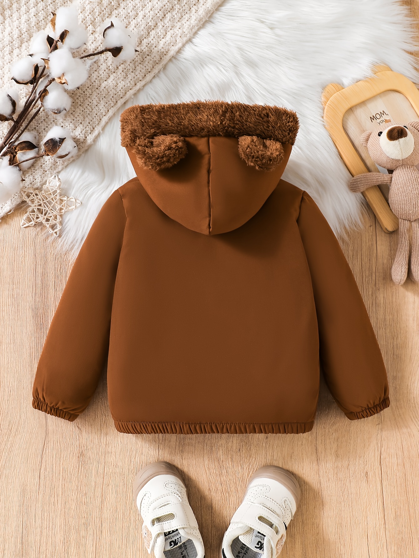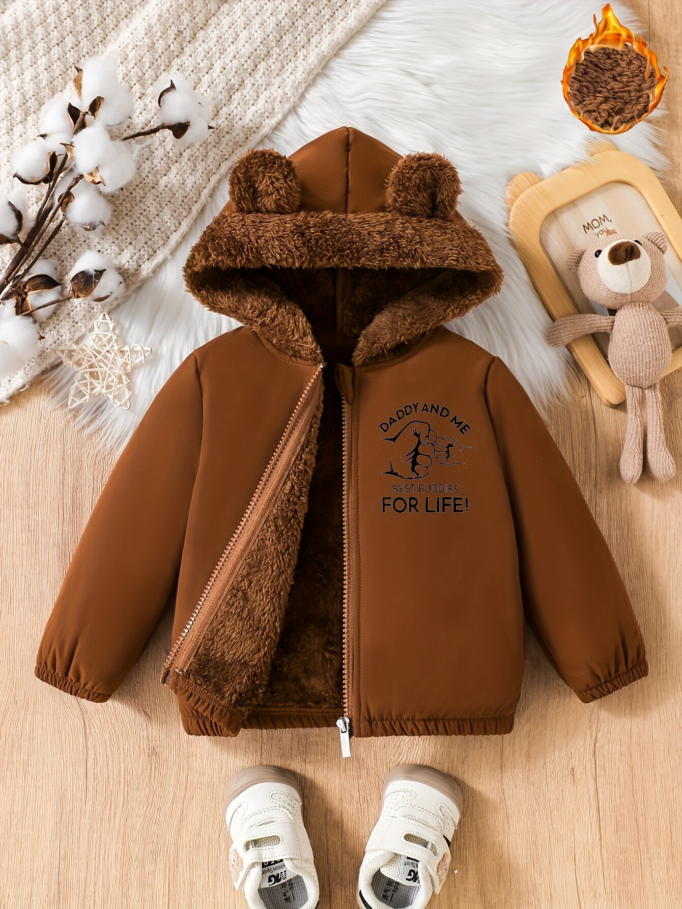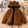 - تصميم فريد وجذاب: يتميز بغطاء رأس ساحر على شكل أذني دب لطيفتين يضفي على طفلك مظهراً مرحاً ومحبباً. تكتمل الأناقة بتفاصيل حروف مميزة تمنح الجاكيت لمسة عصرية.