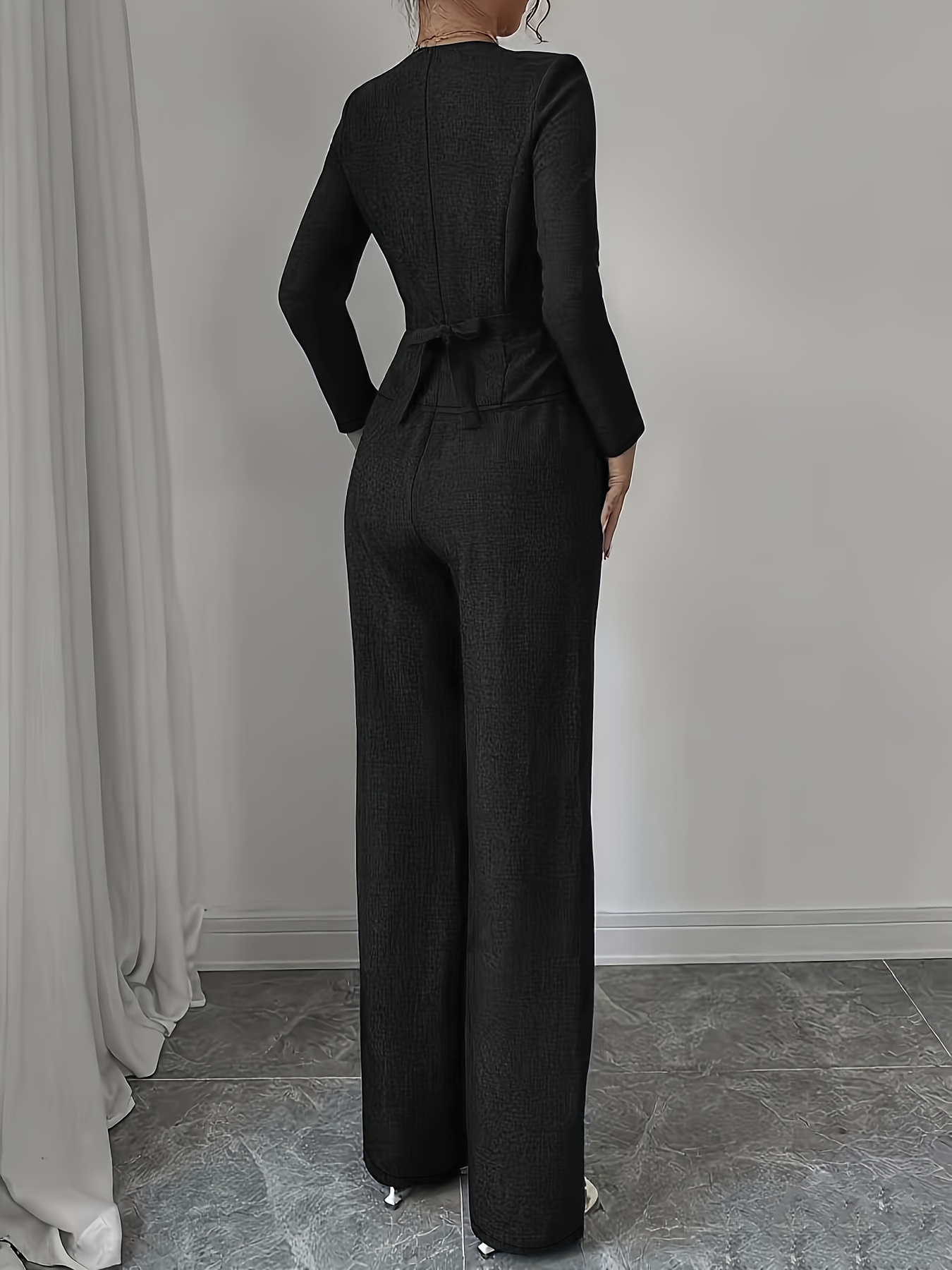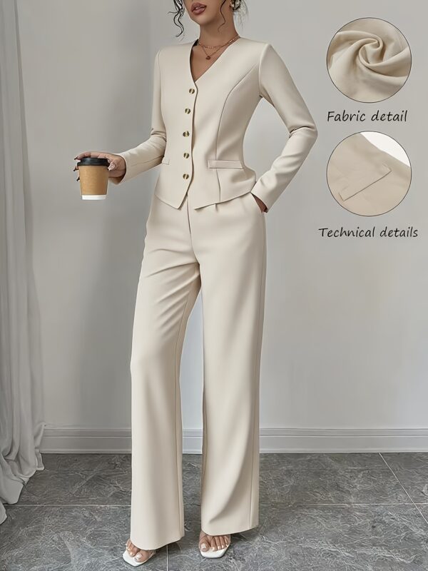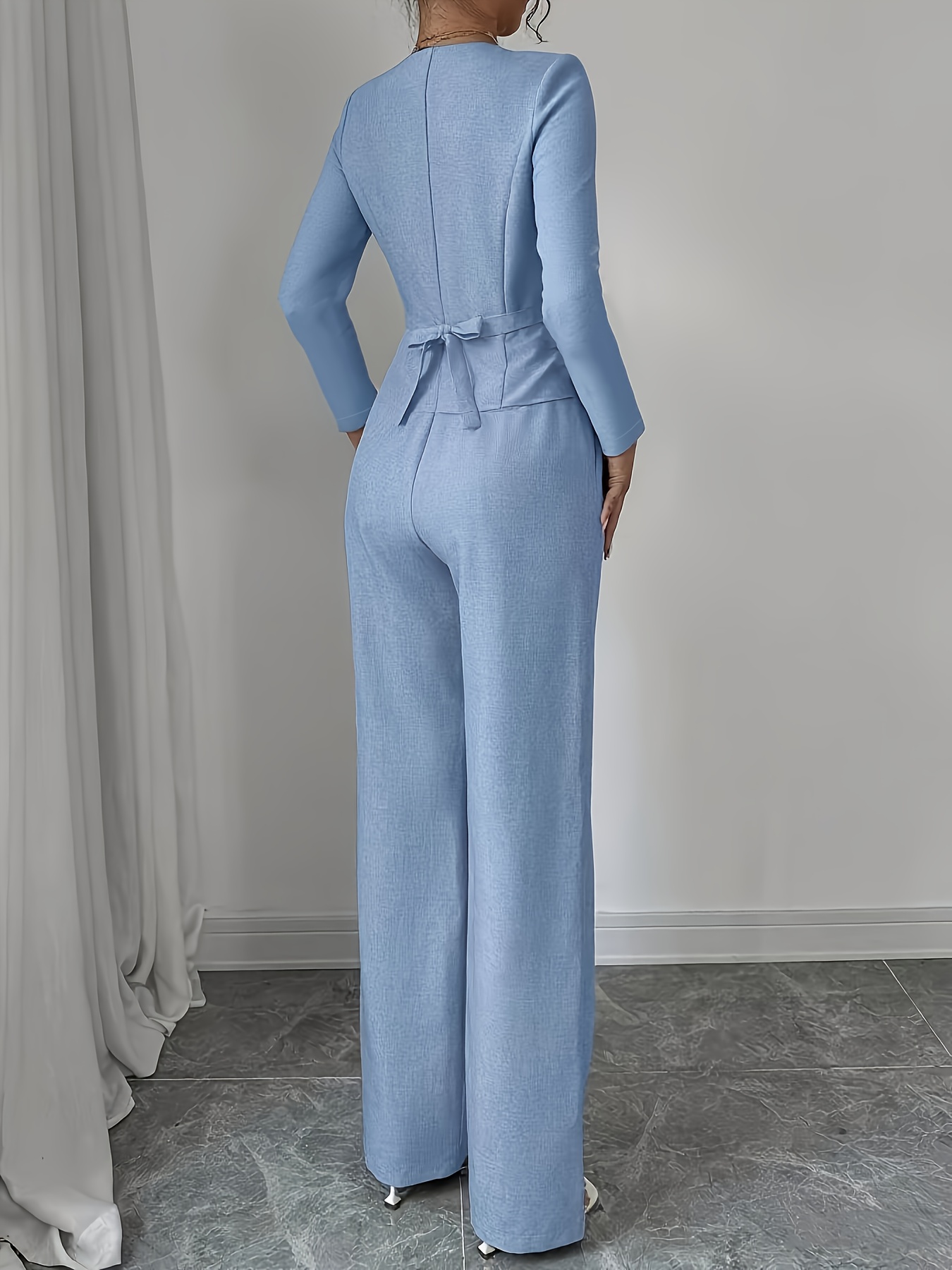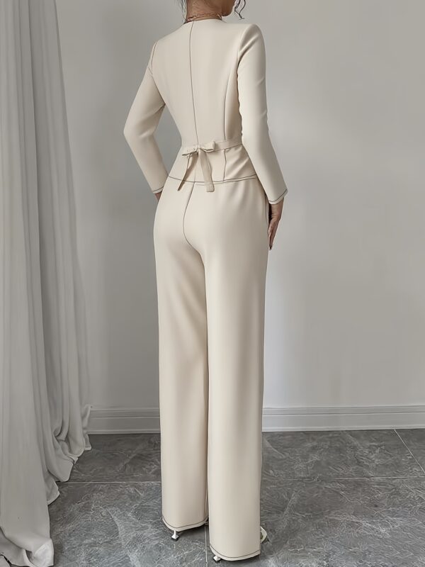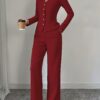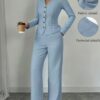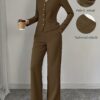 اكتشفي قمة الأناقة والراحة مع طقم البليزر والبنطلون النسائي هذا. مصمم ليناسب إطلالاتك الرسمية والكاجوال على حد سواء، يجمع هذا الطقم الرائع بين التصميم العصري واللمسات الكلاسيكية ليمنحك مظهراً جذاباً وواثقاً في كل الأوقات. يتميز البليزر بياقة V أنيقة وأكمام طويلة، مع تفاصيل أزرار جذابة وحزام خصر لتعزيز أناقتك، بينما يأتي البنطلون بقصة مستقيمة لمظهر رشيق ومريح. وتضيف الجيوب ذات الغطاء لمسة عملية وعصرية لا غنى عنها.