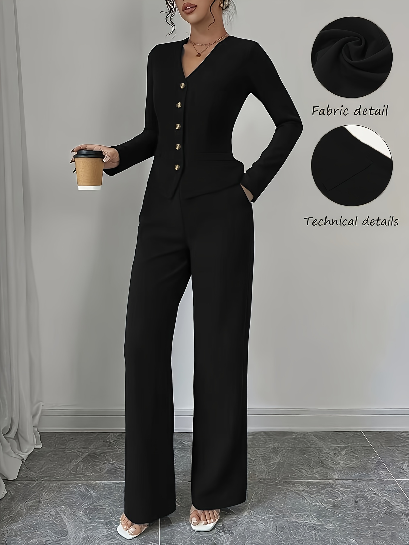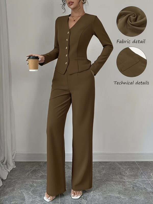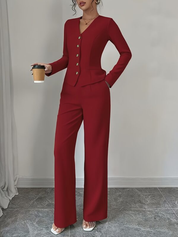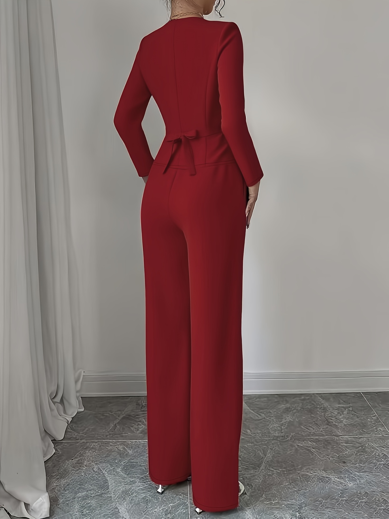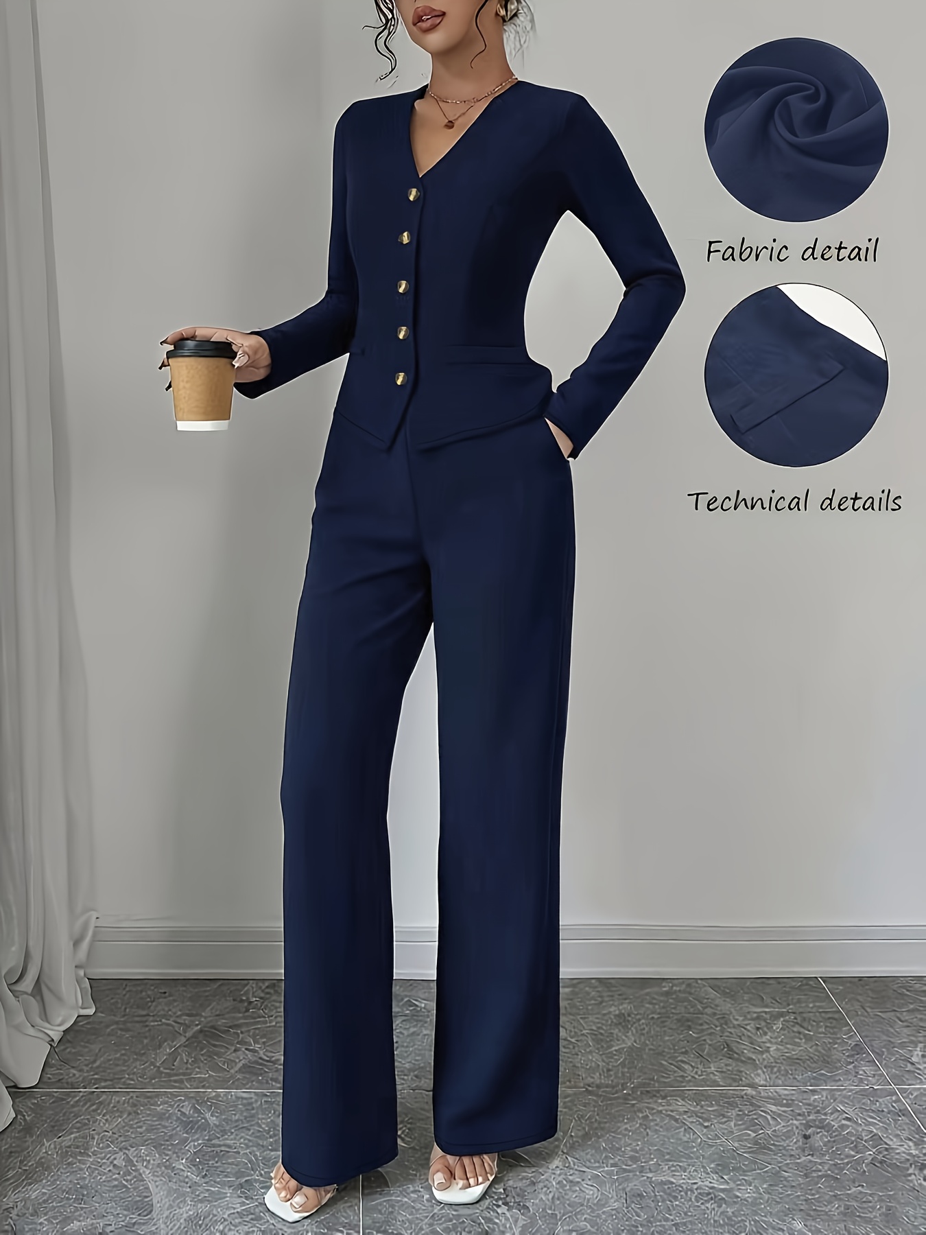 اكتشفي قمة الأناقة والراحة مع طقم البليزر والبنطلون النسائي هذا. مصمم ليناسب إطلالاتك الرسمية والكاجوال على حد سواء، يجمع هذا الطقم الرائع بين التصميم العصري واللمسات الكلاسيكية ليمنحك مظهراً جذاباً وواثقاً في كل الأوقات. يتميز البليزر بياقة V أنيقة وأكمام طويلة، مع تفاصيل أزرار جذابة وحزام خصر لتعزيز أناقتك، بينما يأتي البنطلون بقصة مستقيمة لمظهر رشيق ومريح. وتضيف الجيوب ذات الغطاء لمسة عملية وعصرية لا غنى عنها.