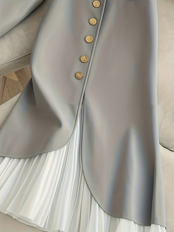 • تصميم فريد وجذاب: تتميز بقصة A-Line الأنيقة وحافة مكشكشة تضيف لمسة أنثوية ساحرة. يكملها تصميم الأزرار الأمامية ولمسة الألوان المتداخلة (Color Block) لمظهر عصري ومميز.
