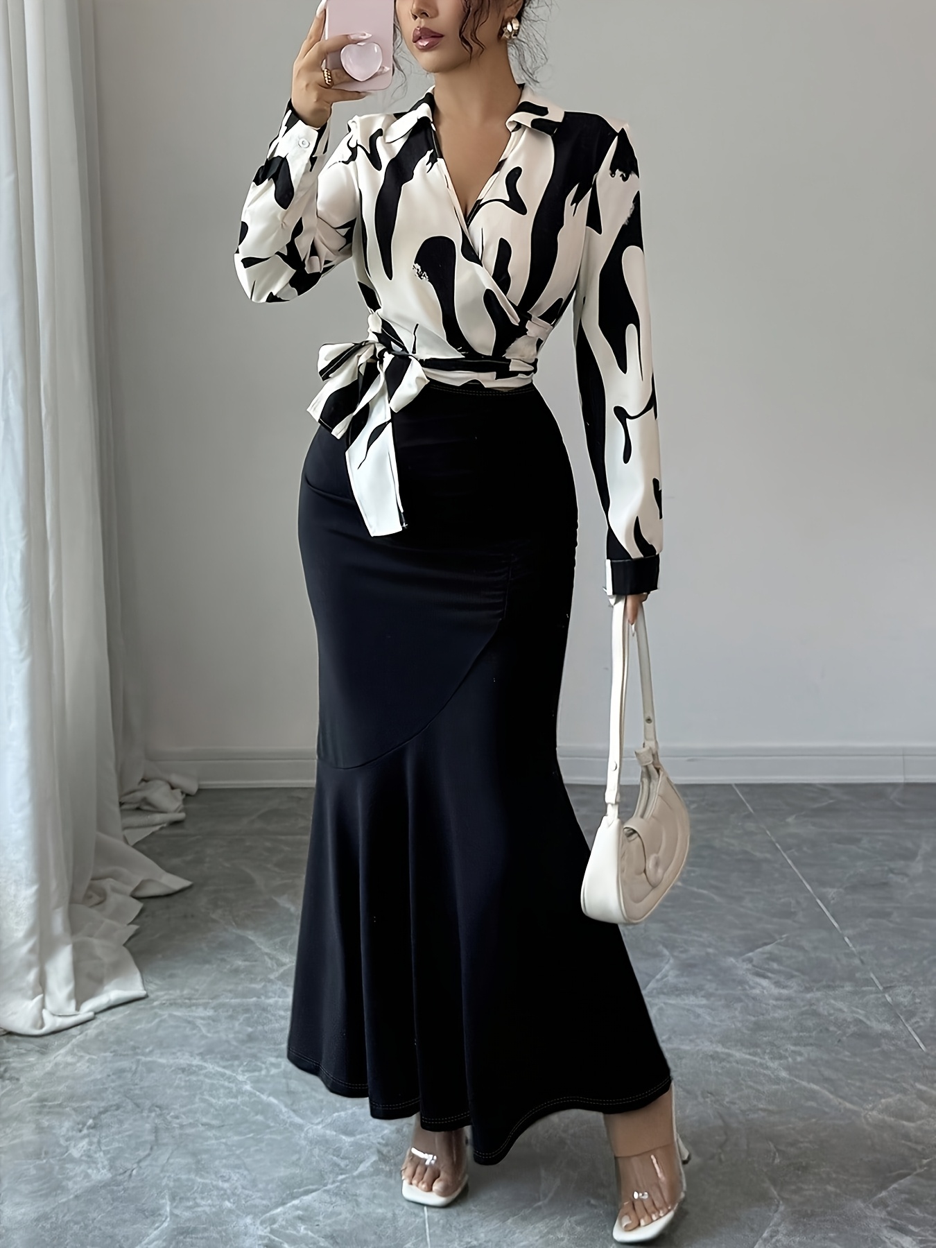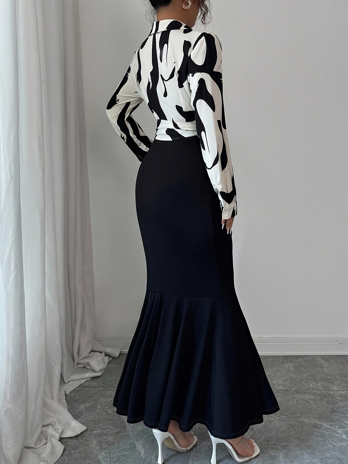 - تنورة «ذيل السمكة» جذابة: تتميز التنورة بقصة «ذيل السمكة» العصرية مع تفاصيل كسرات أنيقة، تُبرز جمال القوام وتضفي حركة ساحرة مع كل خطوة.