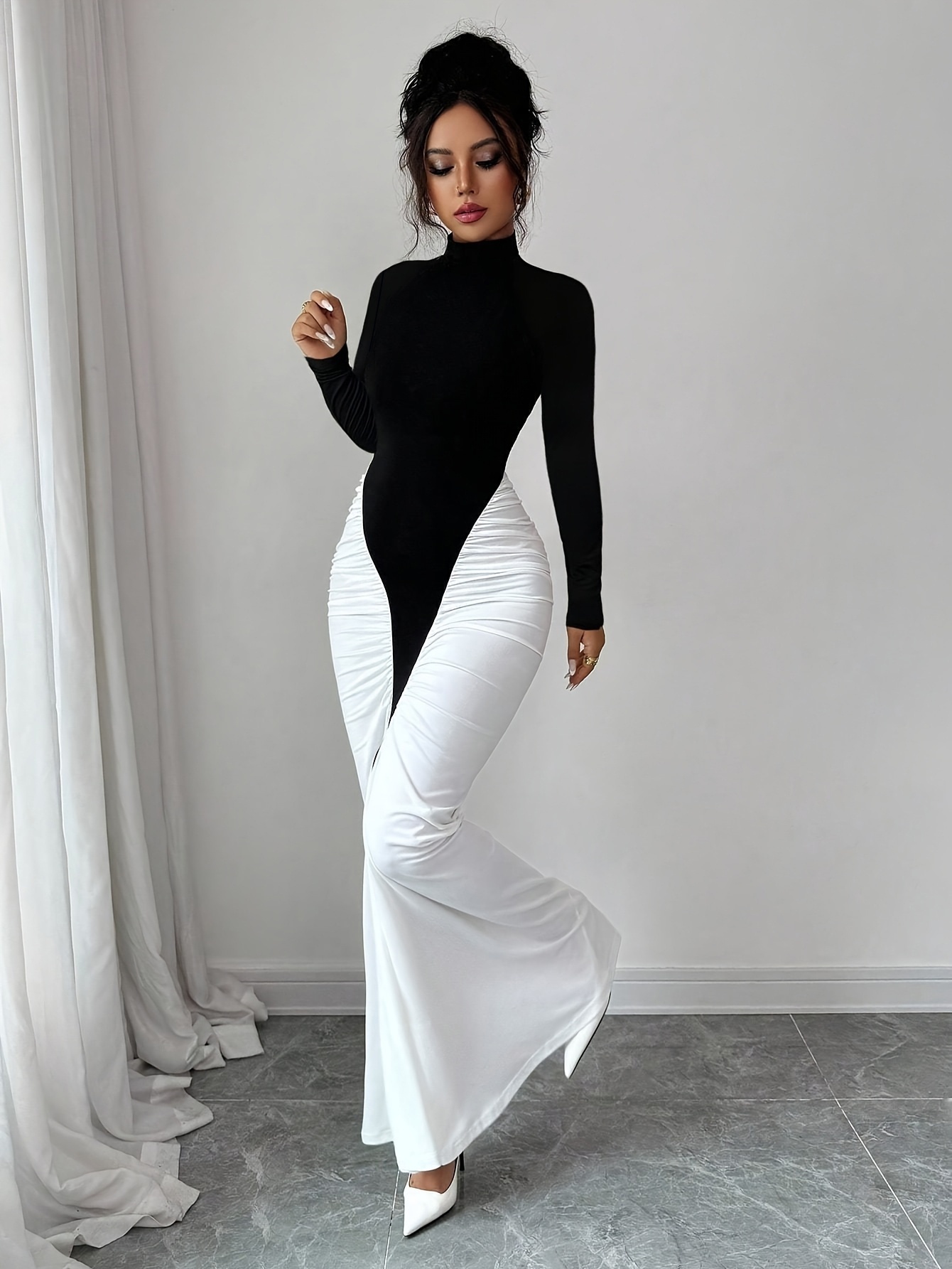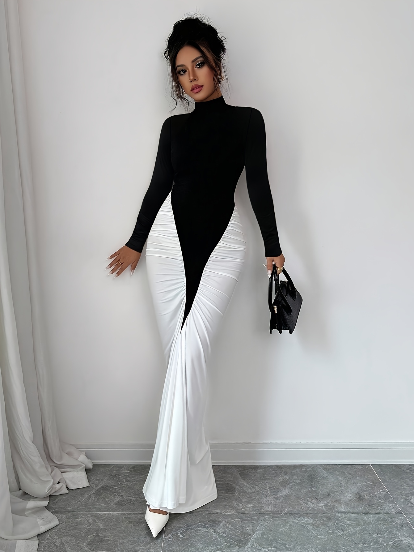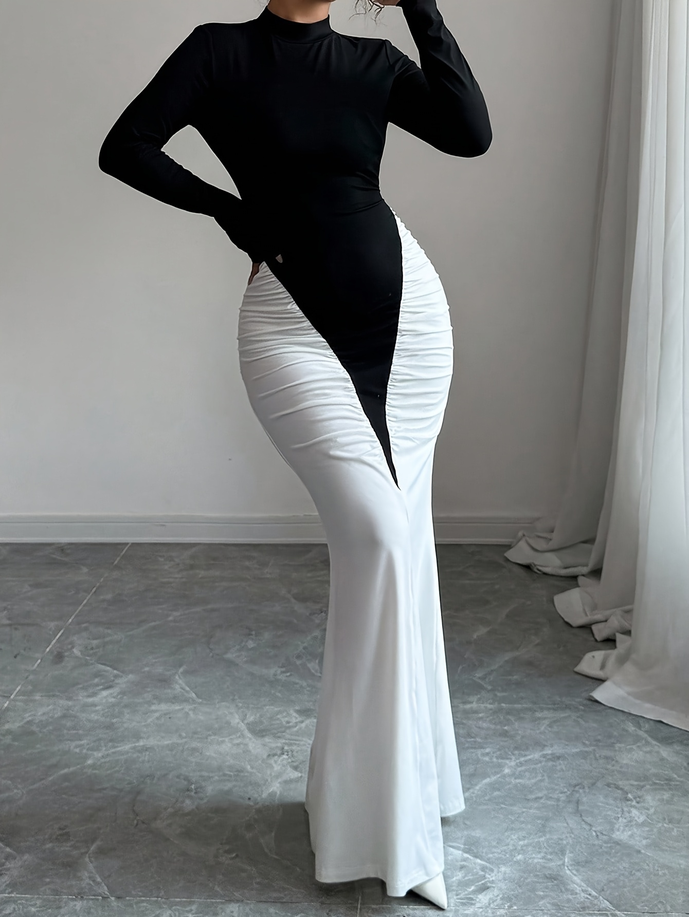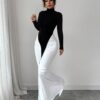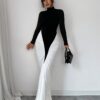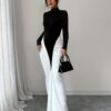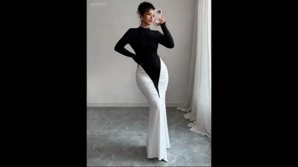 - تصميم متباين ساحر: يتميز هذا الفستان بقصة قلم رصاص أنيقة متباينة باللونين الأسود والأبيض، مع ياقة عالية وأكمام طويلة تضفي لمسة من الرقي والفخامة. تبرز التفاصيل الهيكلية واللمسات الزرية جمال التصميم، مما يجعله خيارًا مثاليًا للمرأة العصرية التي تبحث عن الأناقة الراقية.