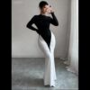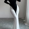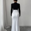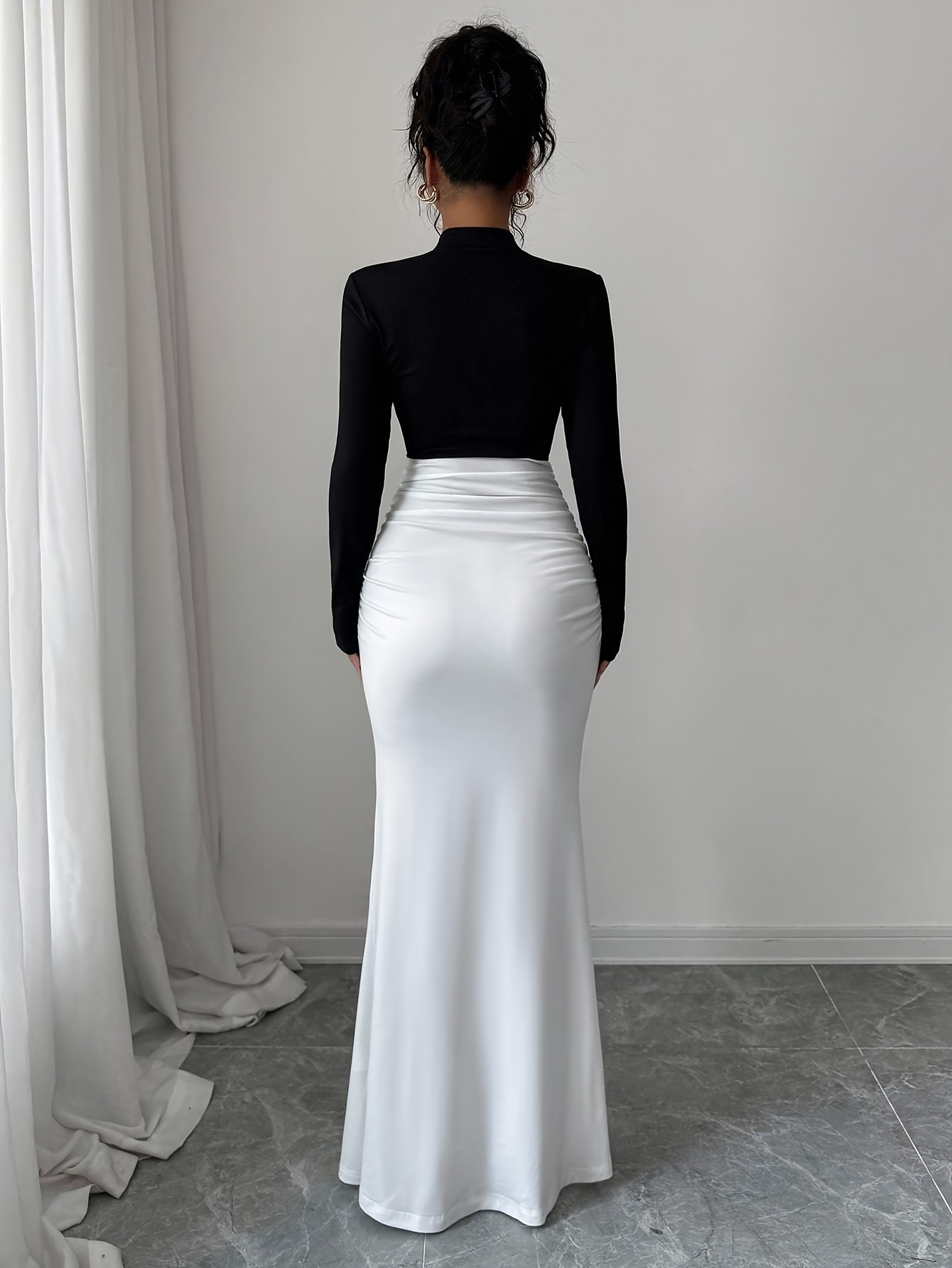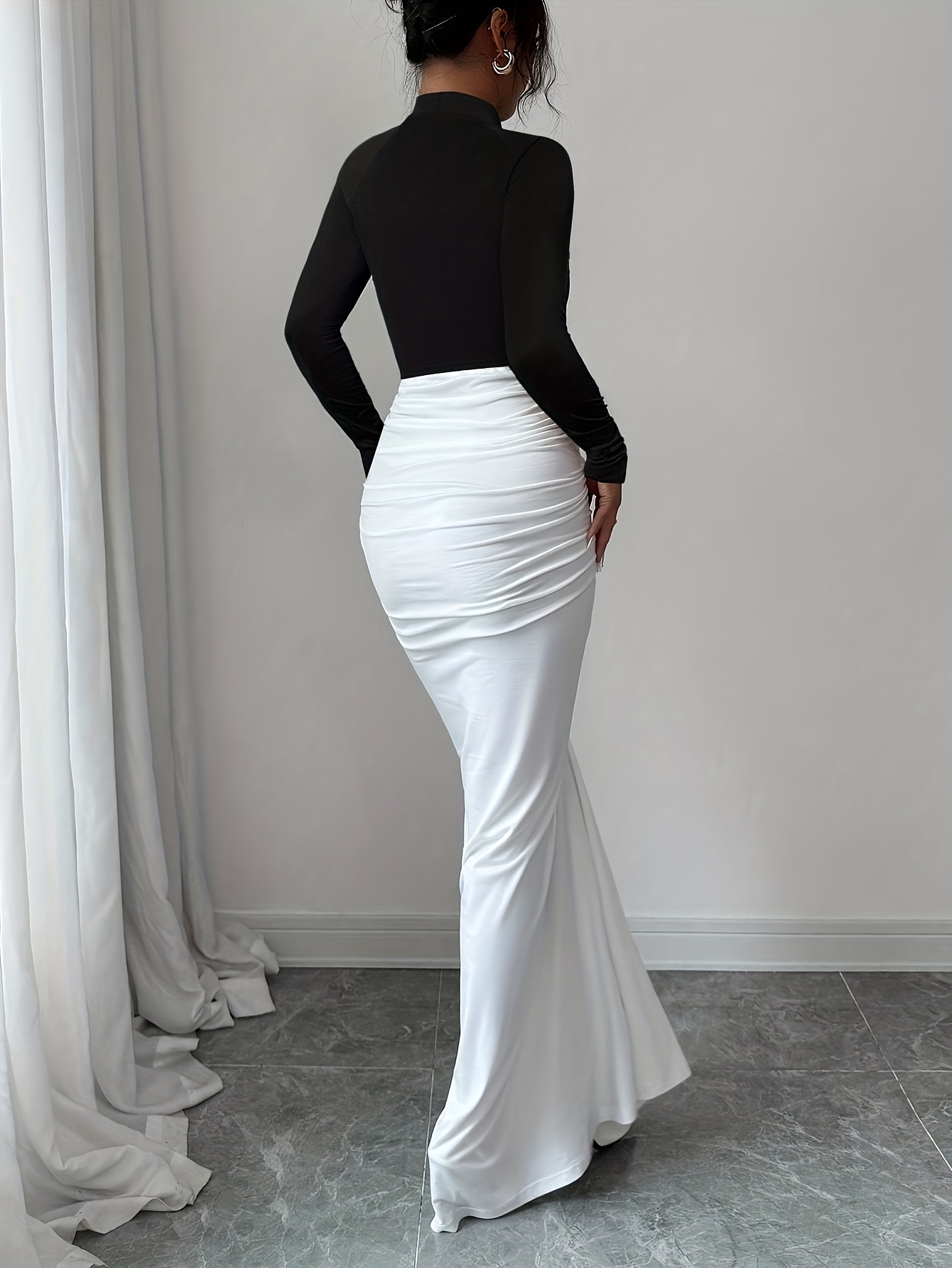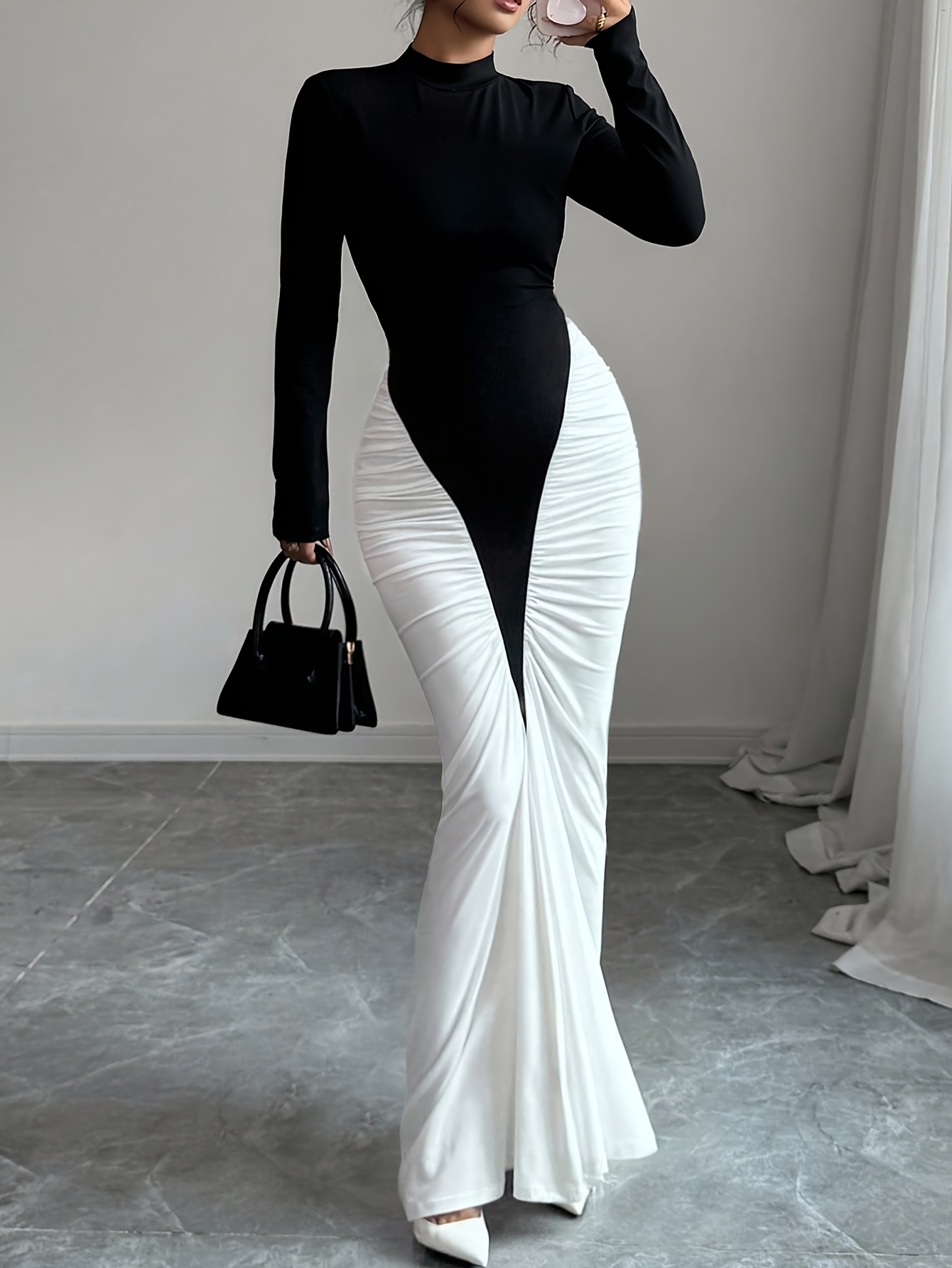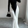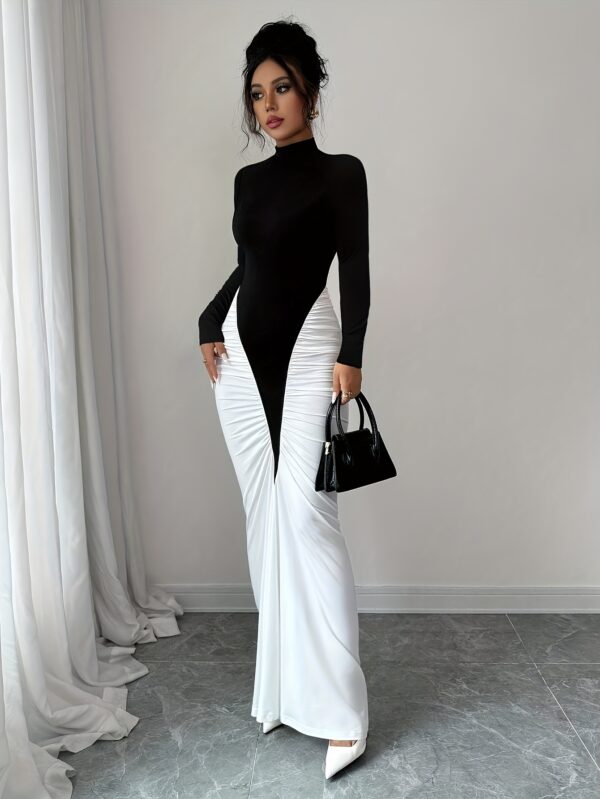 - تصميم متباين ساحر: يتميز هذا الفستان بقصة قلم رصاص أنيقة متباينة باللونين الأسود والأبيض، مع ياقة عالية وأكمام طويلة تضفي لمسة من الرقي والفخامة. تبرز التفاصيل الهيكلية واللمسات الزرية جمال التصميم، مما يجعله خيارًا مثاليًا للمرأة العصرية التي تبحث عن الأناقة الراقية.