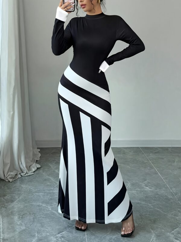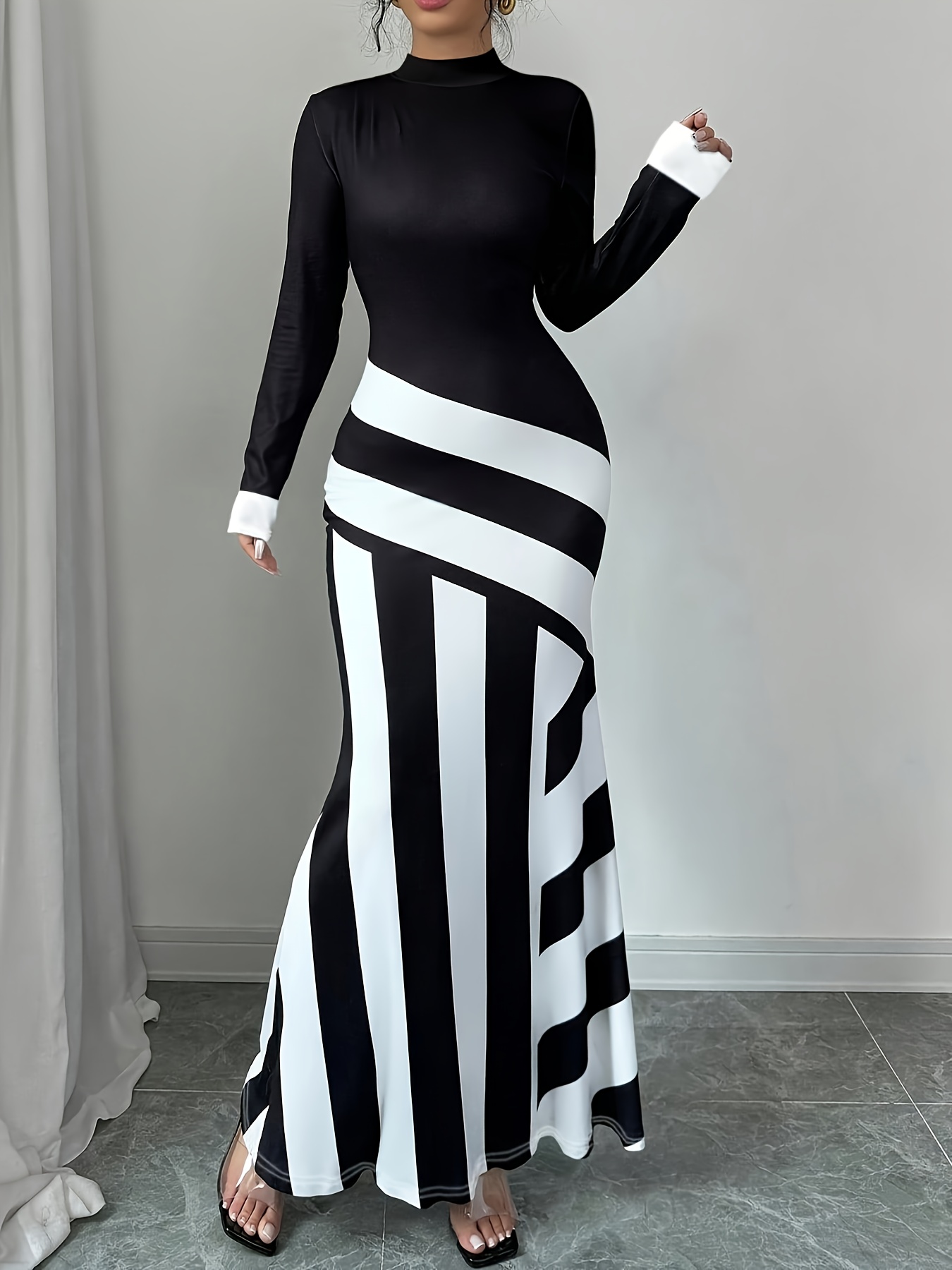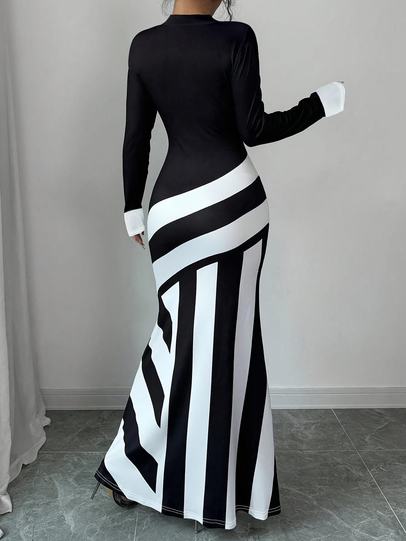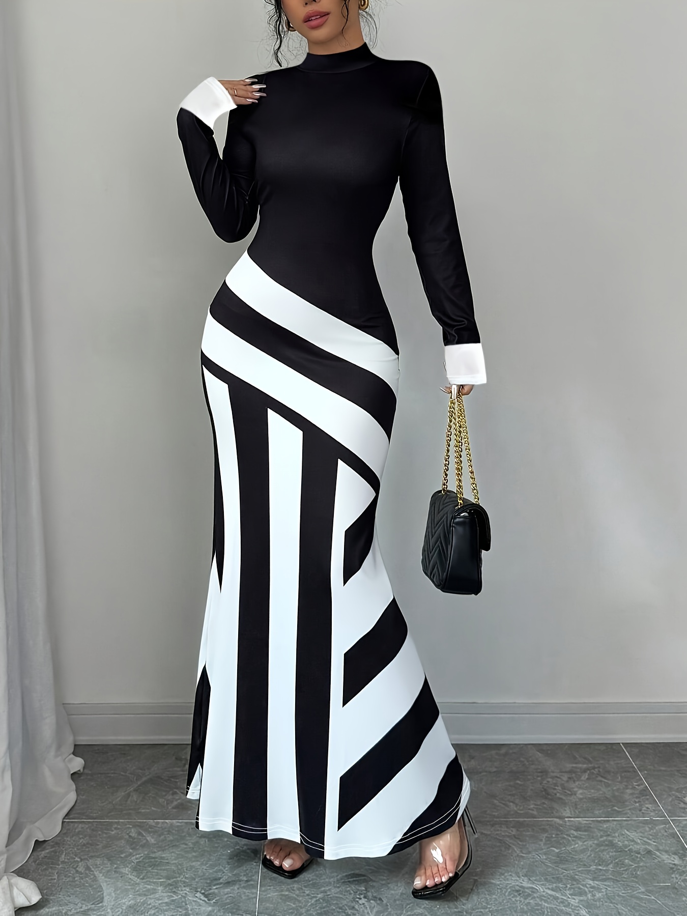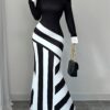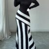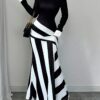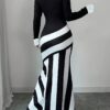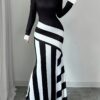 فستان حورية البحر الساحر: أناقة هندسية بالأسود والأبيض بقصة ضيقة لمناسباتكِ الخاصة