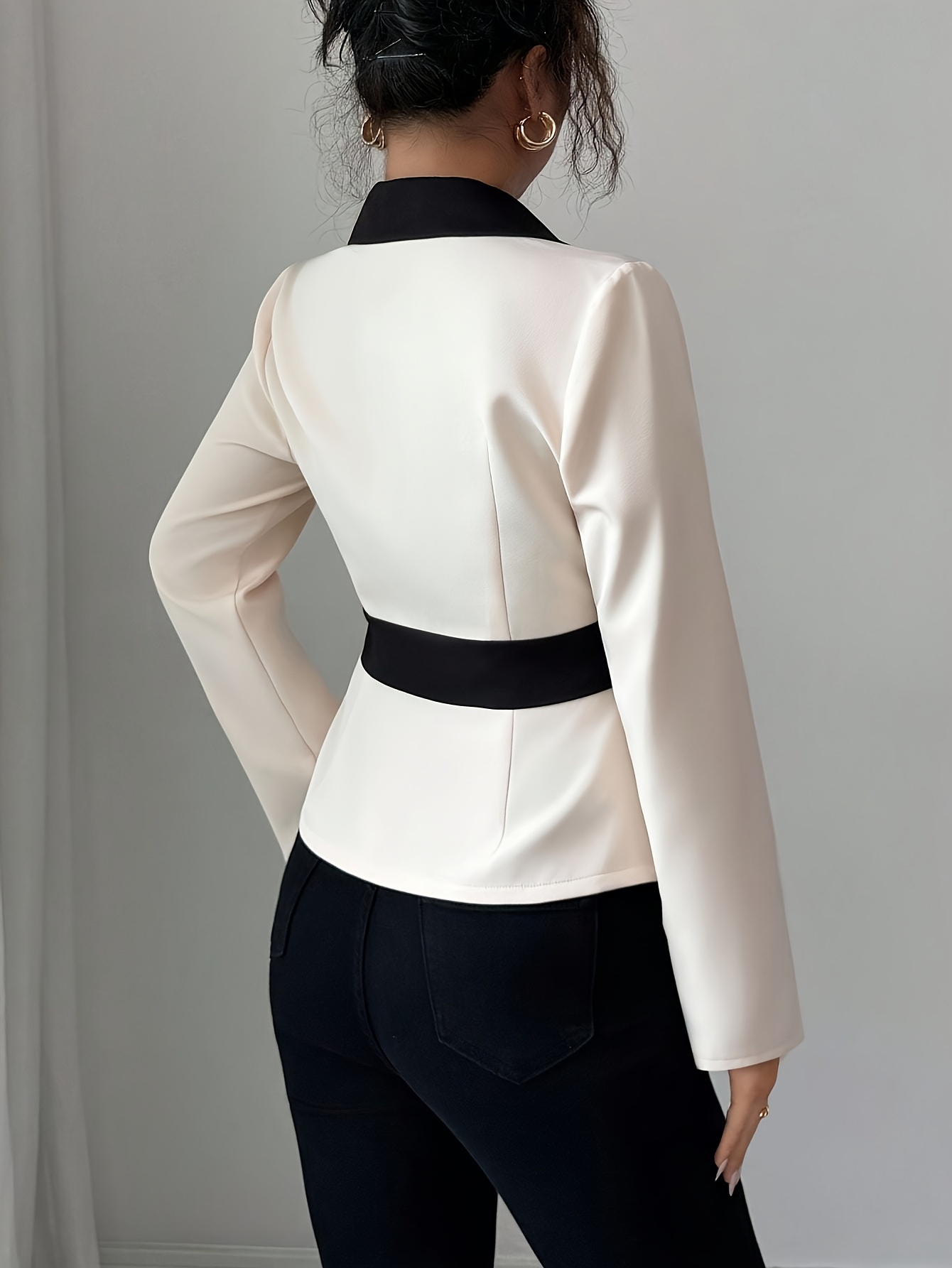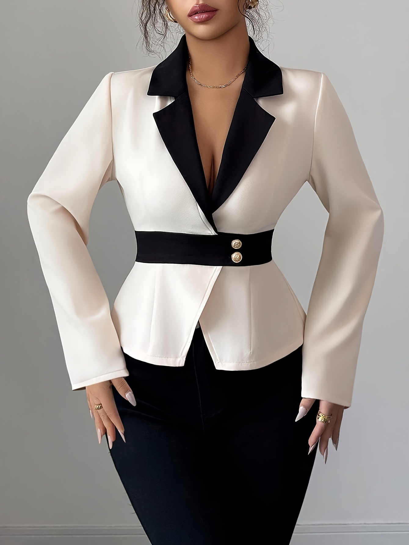 - تفاصيل كلاسيكية راقية: يزدان بأزرار أنيقة وياقة مصممة بعناية، بالإضافة إلى الأكمام الطويلة التي تكمل إطلالتك الاحترافية والراقية.