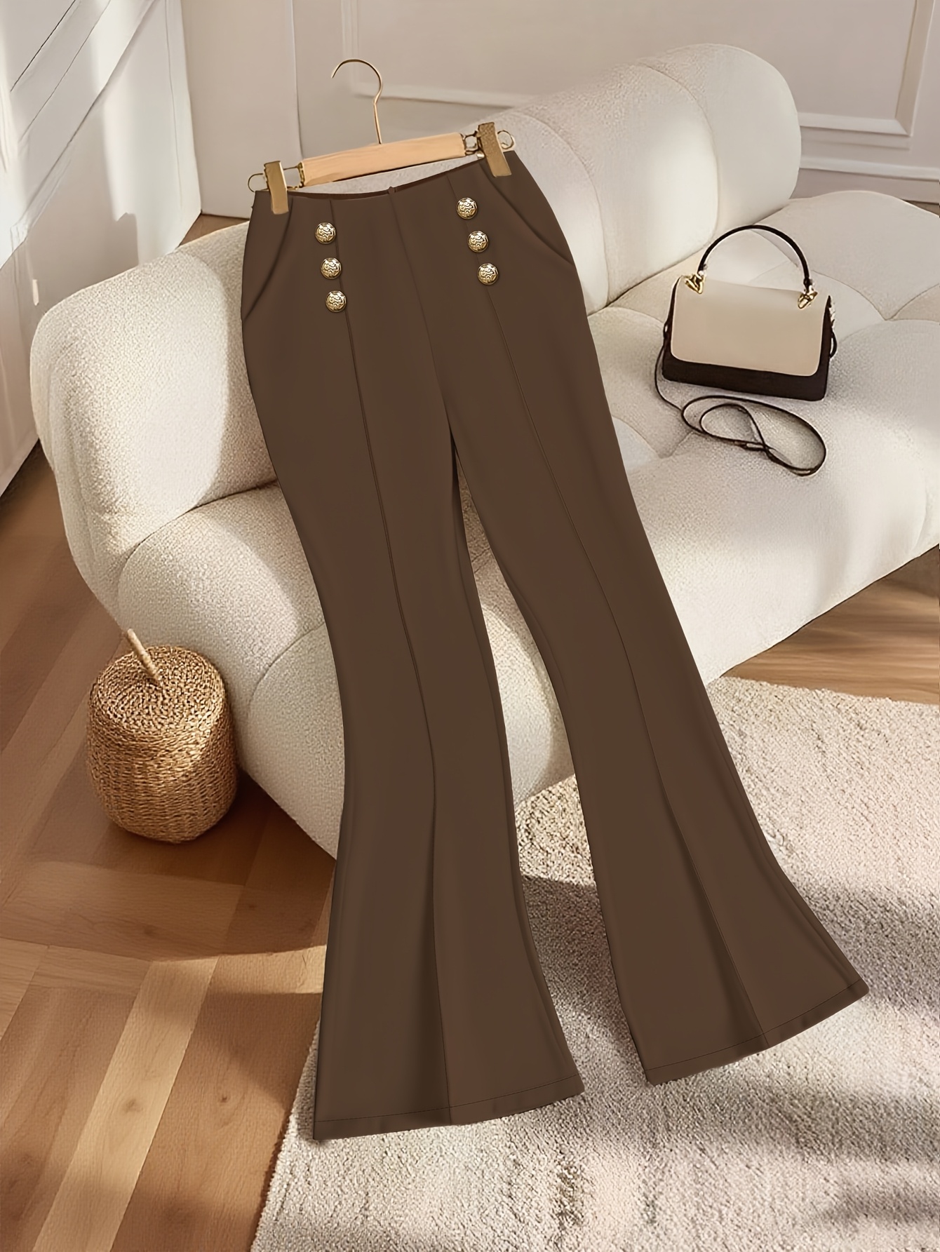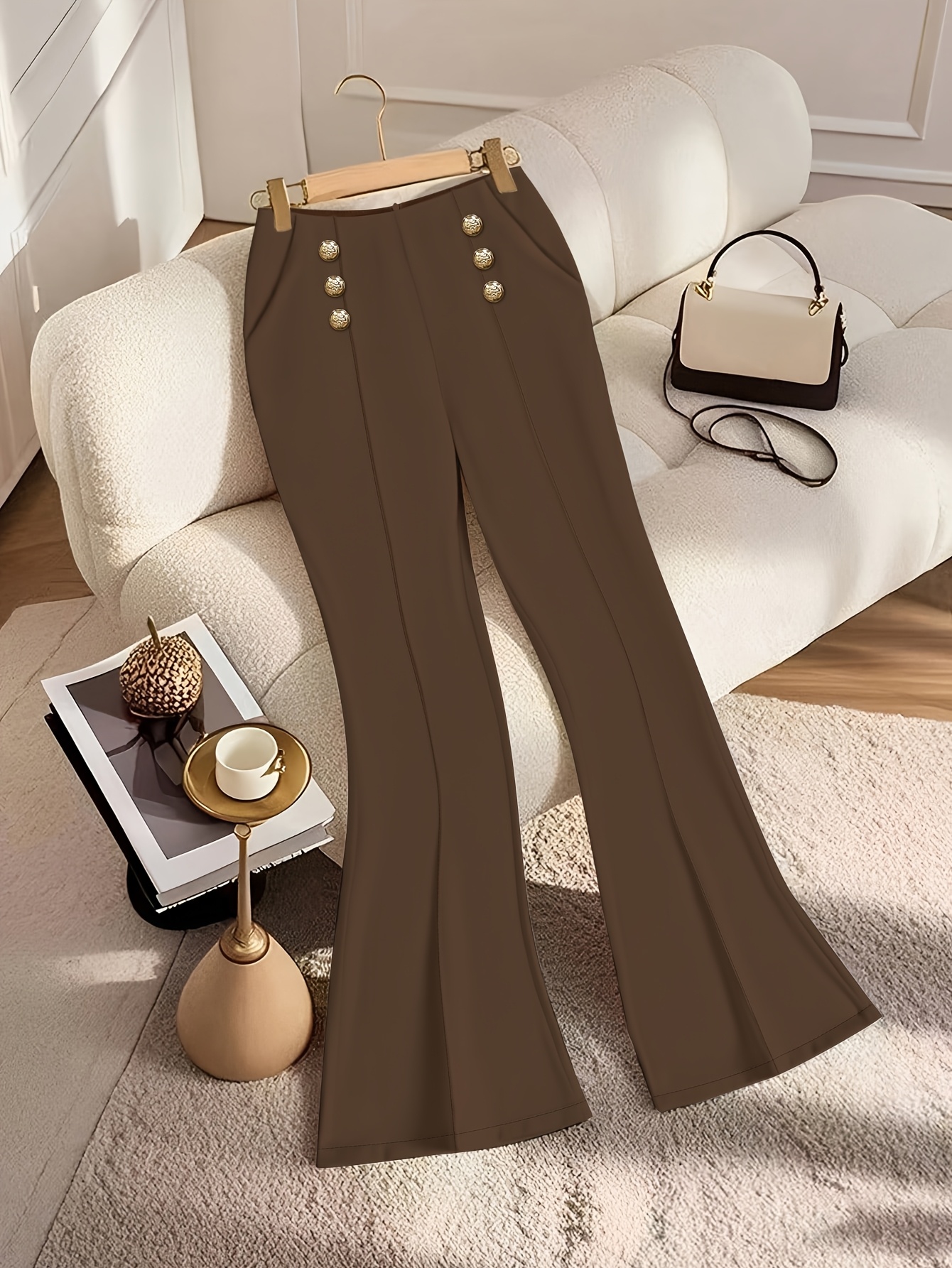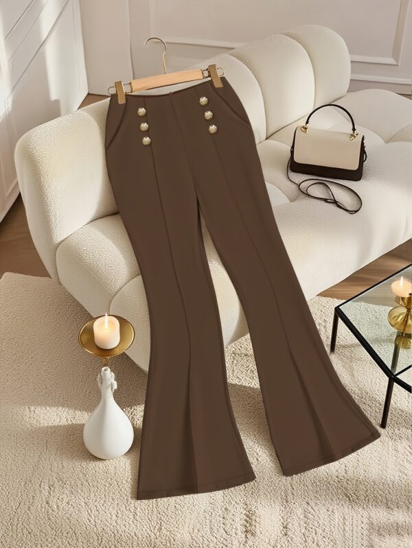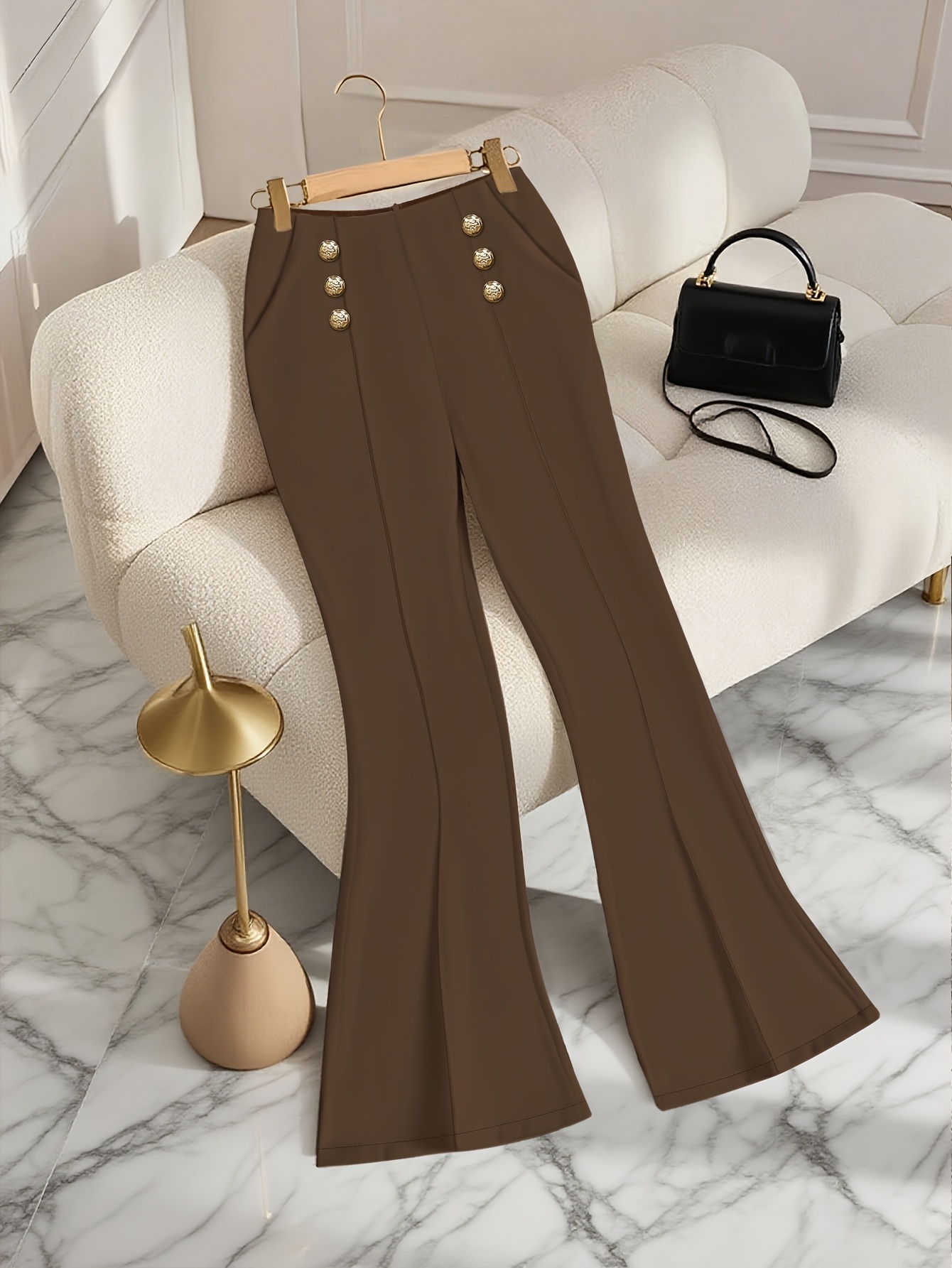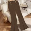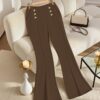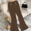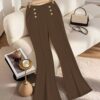 بنطلون نسائي بني أنيق بقصة واسعة وأزرار ذهبية – تصميم بخصر عالٍ لإطلالة خريفية وشتوية متألقة