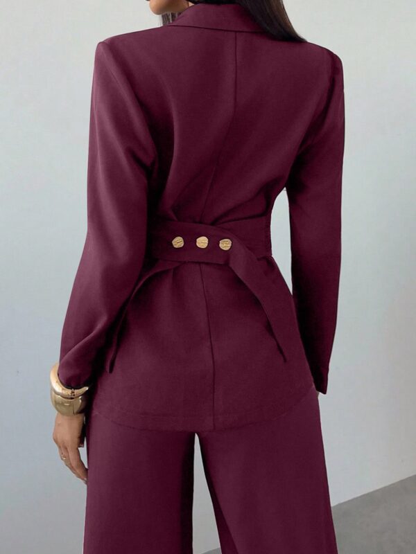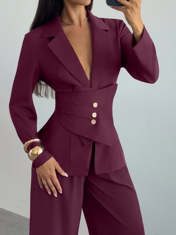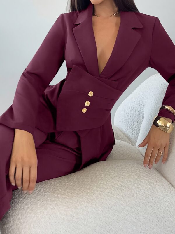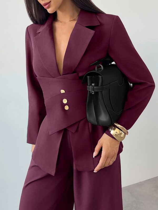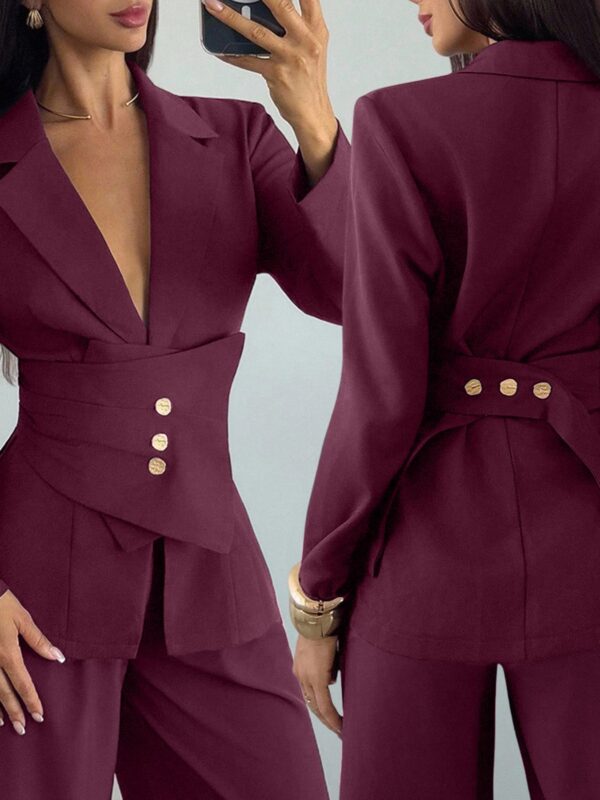 - تصميم أنيق ومحترف: يتميز بتصميم أحادي الصدر مع أزرار أنيقة، وأكمام طويلة كلاسيكية. يضفي قصّته المهيكلة ومحيطه الذي يبرز الخصر (X-contour) لمسة أنثوية راقية ومظهرًا احترافيًا لا تشوبه شائبة، ليمنحكِ إطلالة جذابة ومحددة.