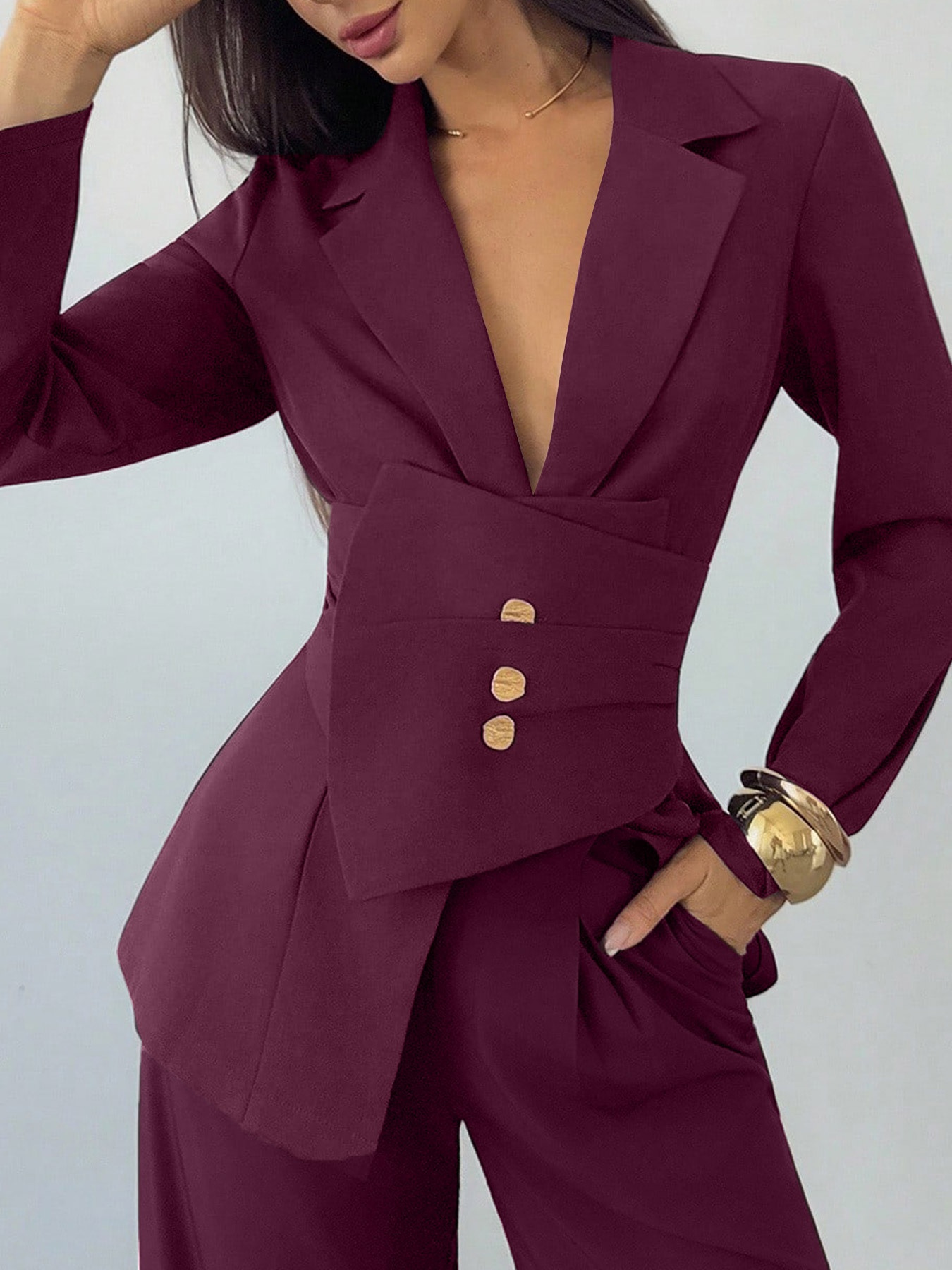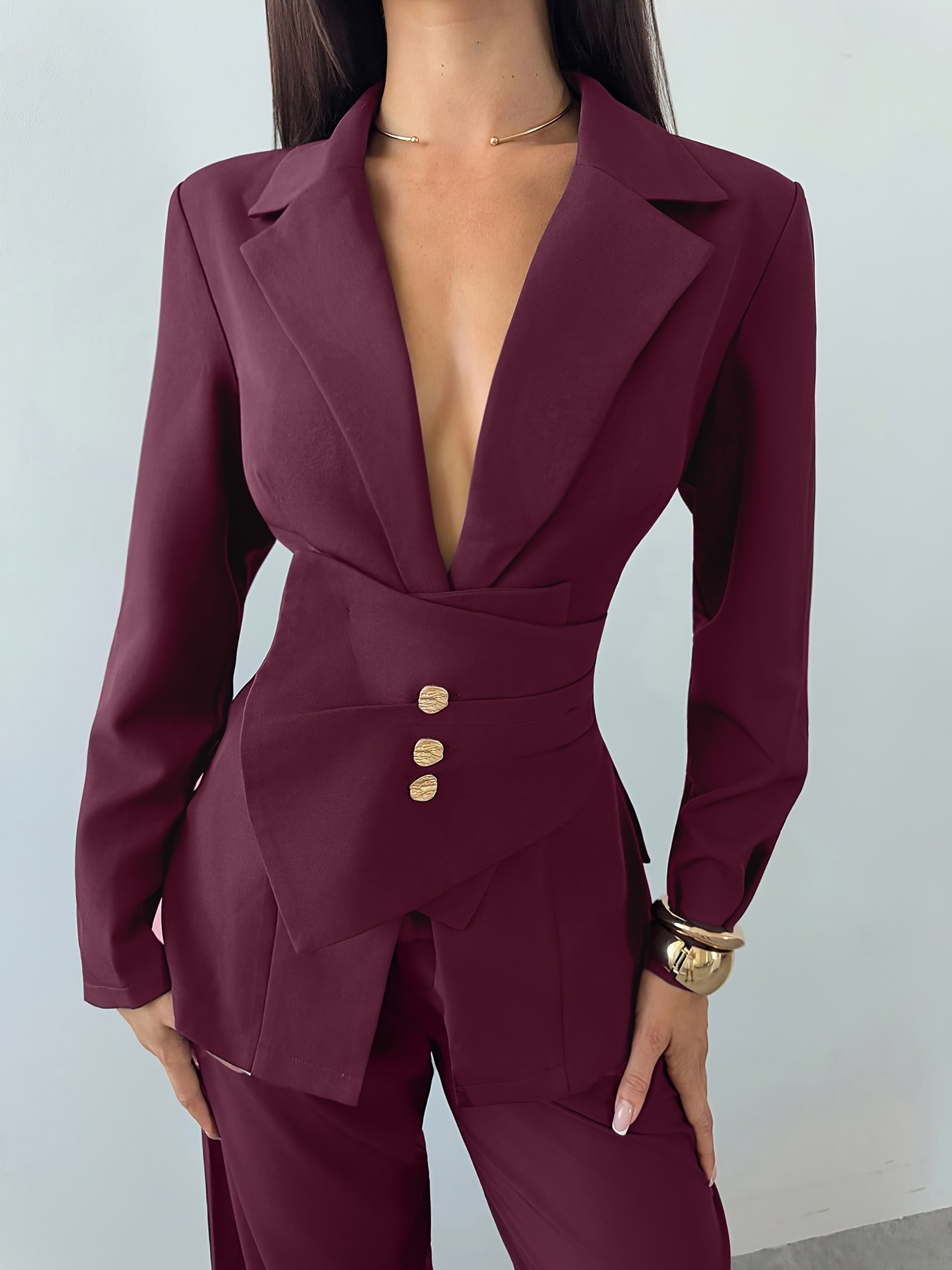 - تصميم أنيق ومحترف: يتميز بتصميم أحادي الصدر مع أزرار أنيقة، وأكمام طويلة كلاسيكية. يضفي قصّته المهيكلة ومحيطه الذي يبرز الخصر (X-contour) لمسة أنثوية راقية ومظهرًا احترافيًا لا تشوبه شائبة، ليمنحكِ إطلالة جذابة ومحددة.