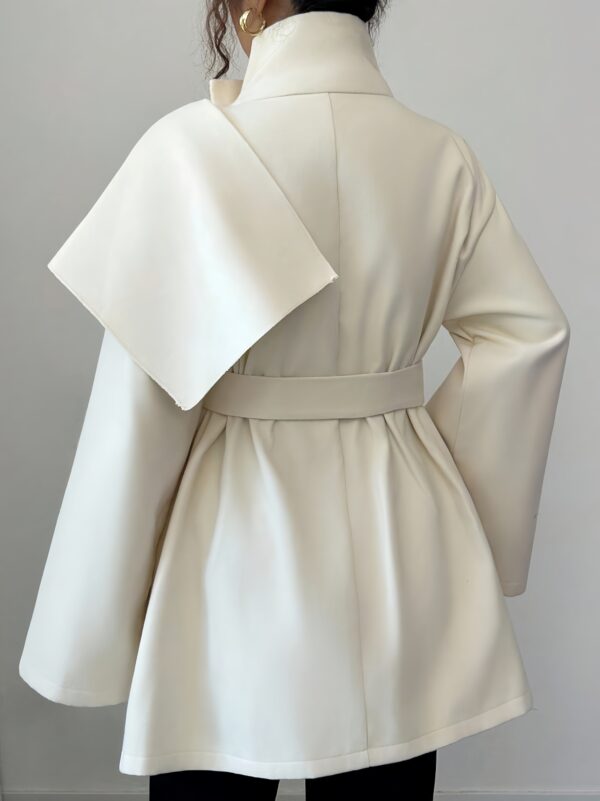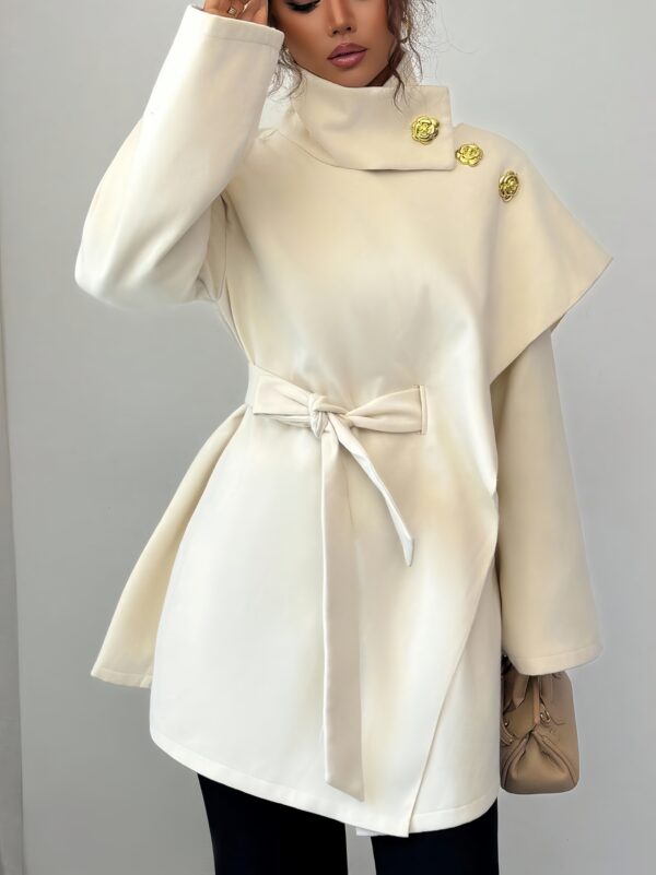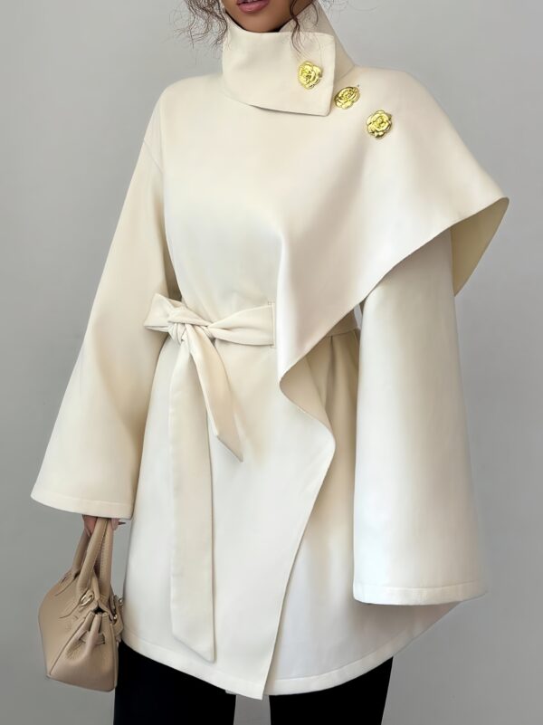- تصميم كلاسيكي متفرد: يتميز هذا المعطف بقصة الكاب الأنيقة والطول المتوسط (ميدي)، مع ياقة عالية تضفي لمسة من الرقي، مما يجعله مثاليًا لعاشقات الموضة الكلاسيكية.