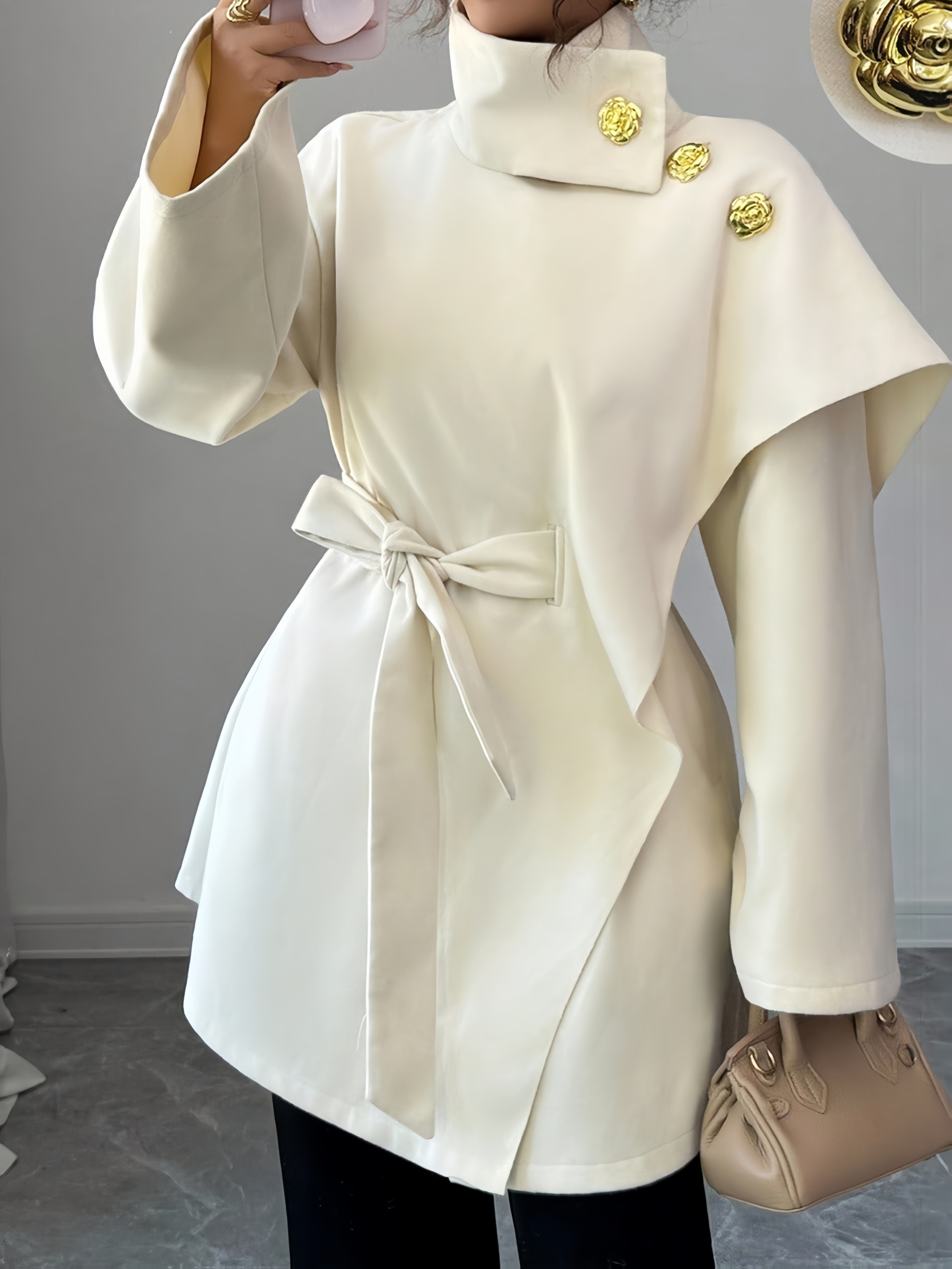 - تصميم كلاسيكي متفرد: يتميز هذا المعطف بقصة الكاب الأنيقة والطول المتوسط (ميدي)، مع ياقة عالية تضفي لمسة من الرقي، مما يجعله مثاليًا لعاشقات الموضة الكلاسيكية.