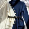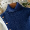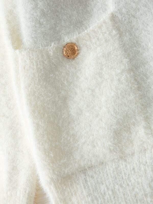 - ياقة لابل كلاسيكية أنيقة: تبرز الكنزة بياقة لابل مصممة بعناية، تمنحها طابعاً كلاسيكياً راقياً ولمسة من الفخامة، مثالية لإطلالات العمل أو اللقاءات المسائية.