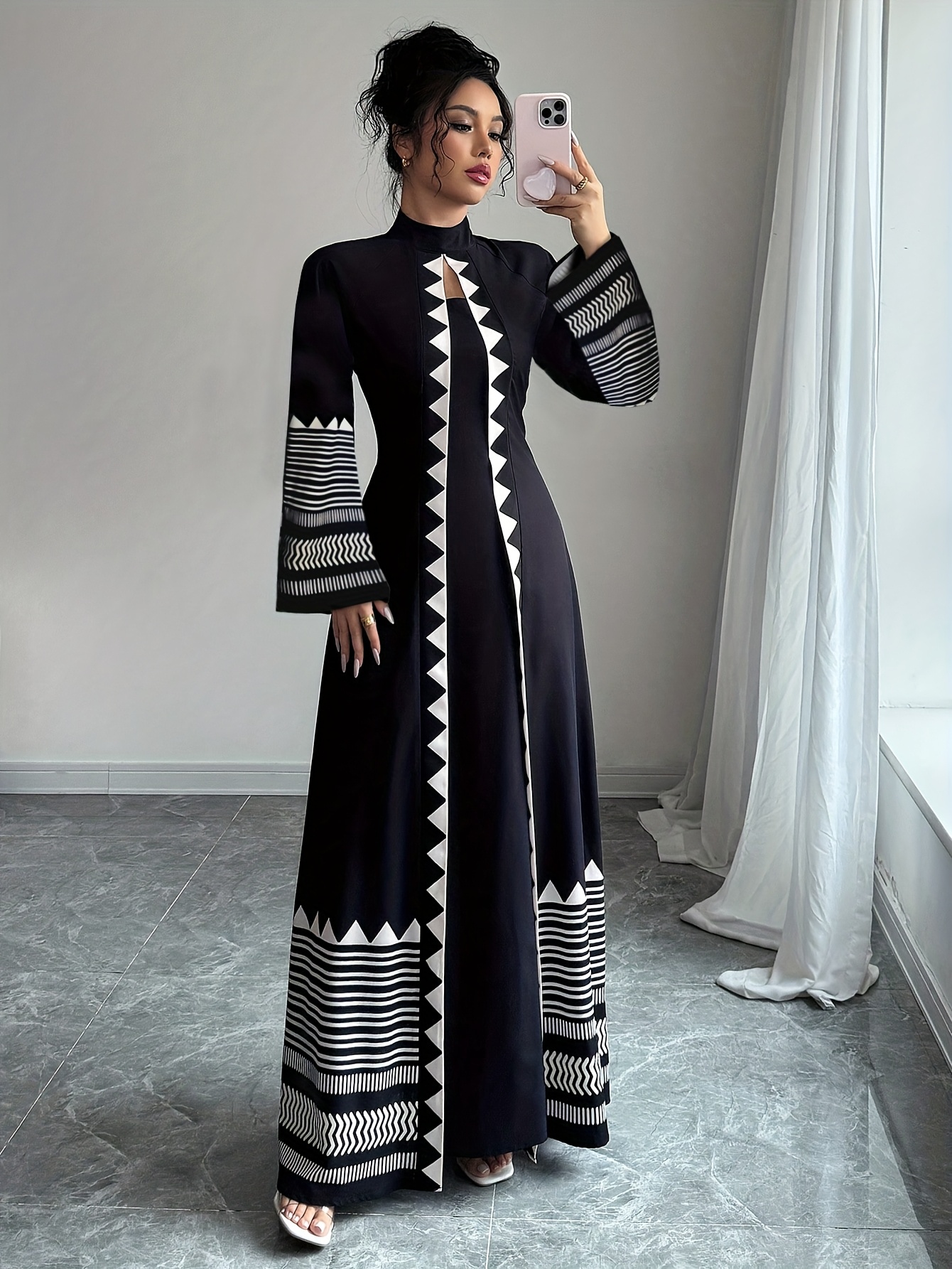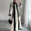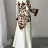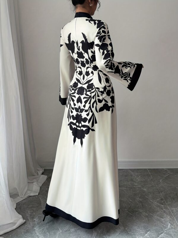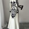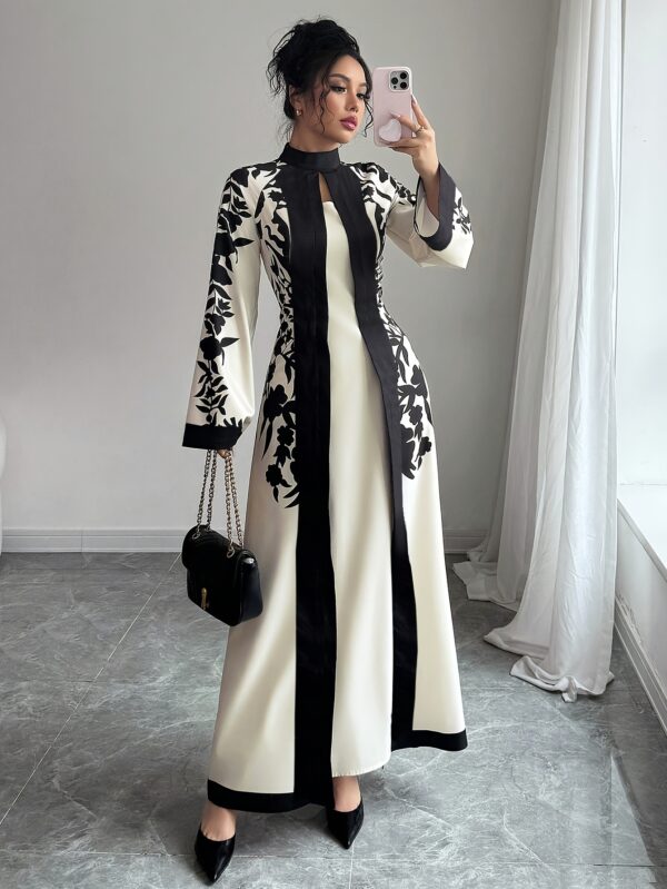 • تصميم زهري ساحر: يأتيك هذا الفستان بنقشة زهور أنيقة باللونين الأبيض والأسود، تضفي لمسة من الرقي والجاذبية، وتجعلك محط الأنظار أينما ذهبتِ.