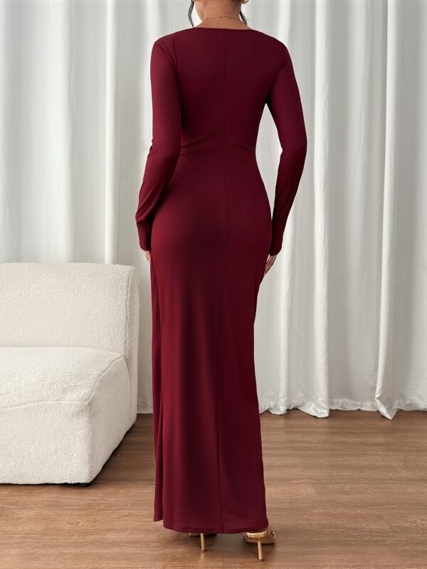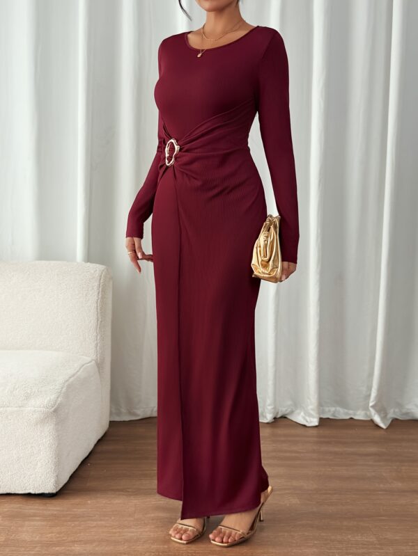 - لون آسر وتصميم أنيق: يأتي بلون أحمر برغندي/داكن فاخر يضفي عليكِ هالة من الرقي والجاذبية، مع تصميم انسيابي بقصة ضيقة تبرز جمال قوامك، مثالي للسهرات والمناسبات الرسمية.