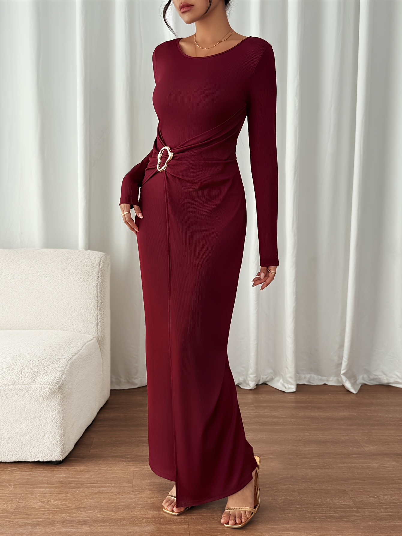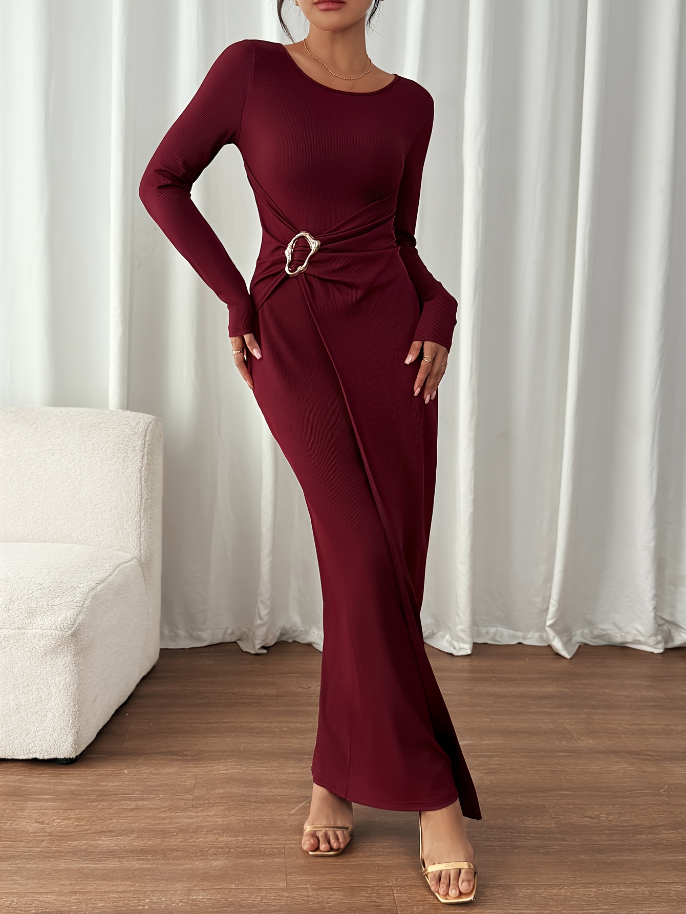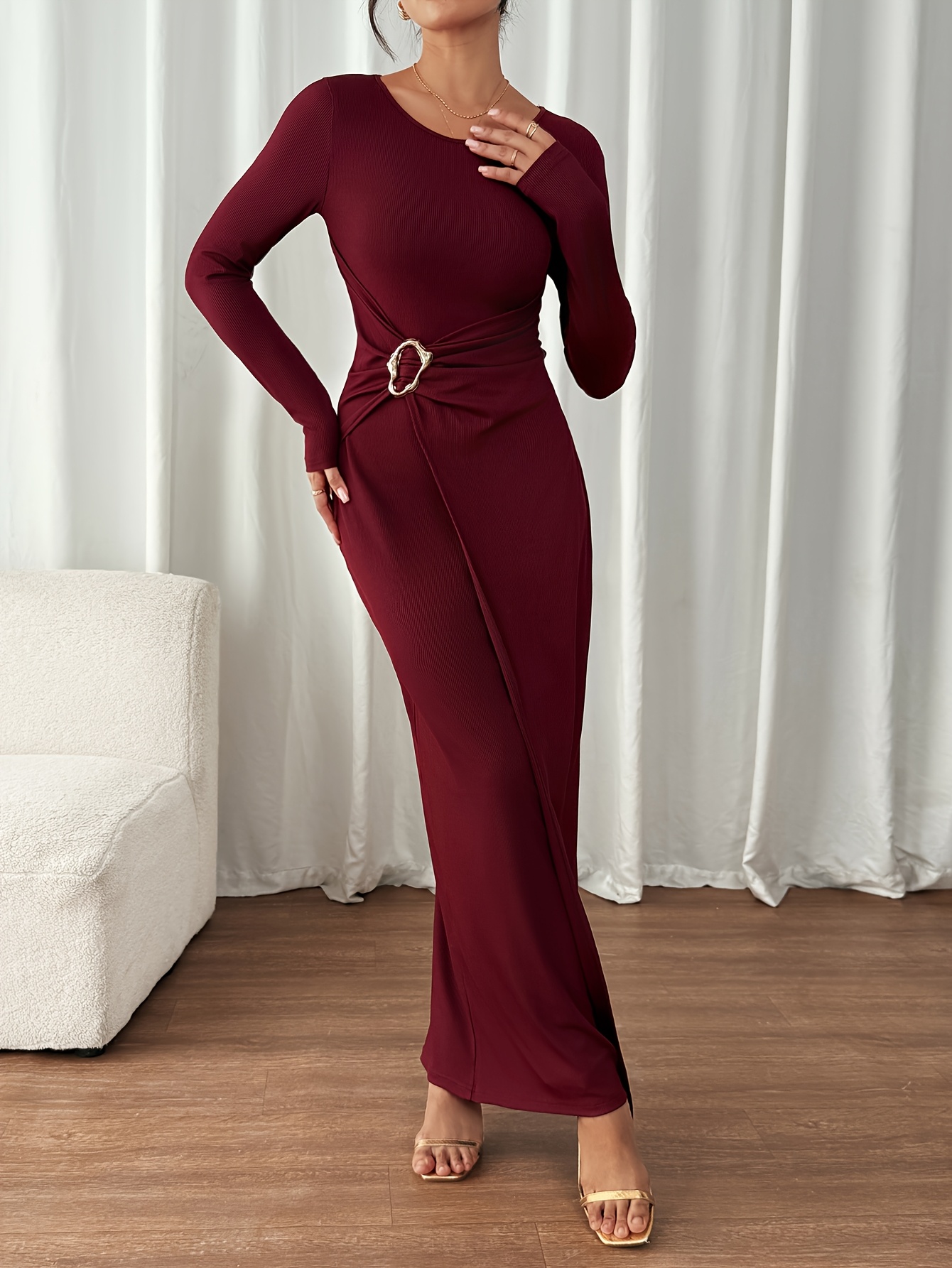 - لون آسر وتصميم أنيق: يأتي بلون أحمر برغندي/داكن فاخر يضفي عليكِ هالة من الرقي والجاذبية، مع تصميم انسيابي بقصة ضيقة تبرز جمال قوامك، مثالي للسهرات والمناسبات الرسمية.