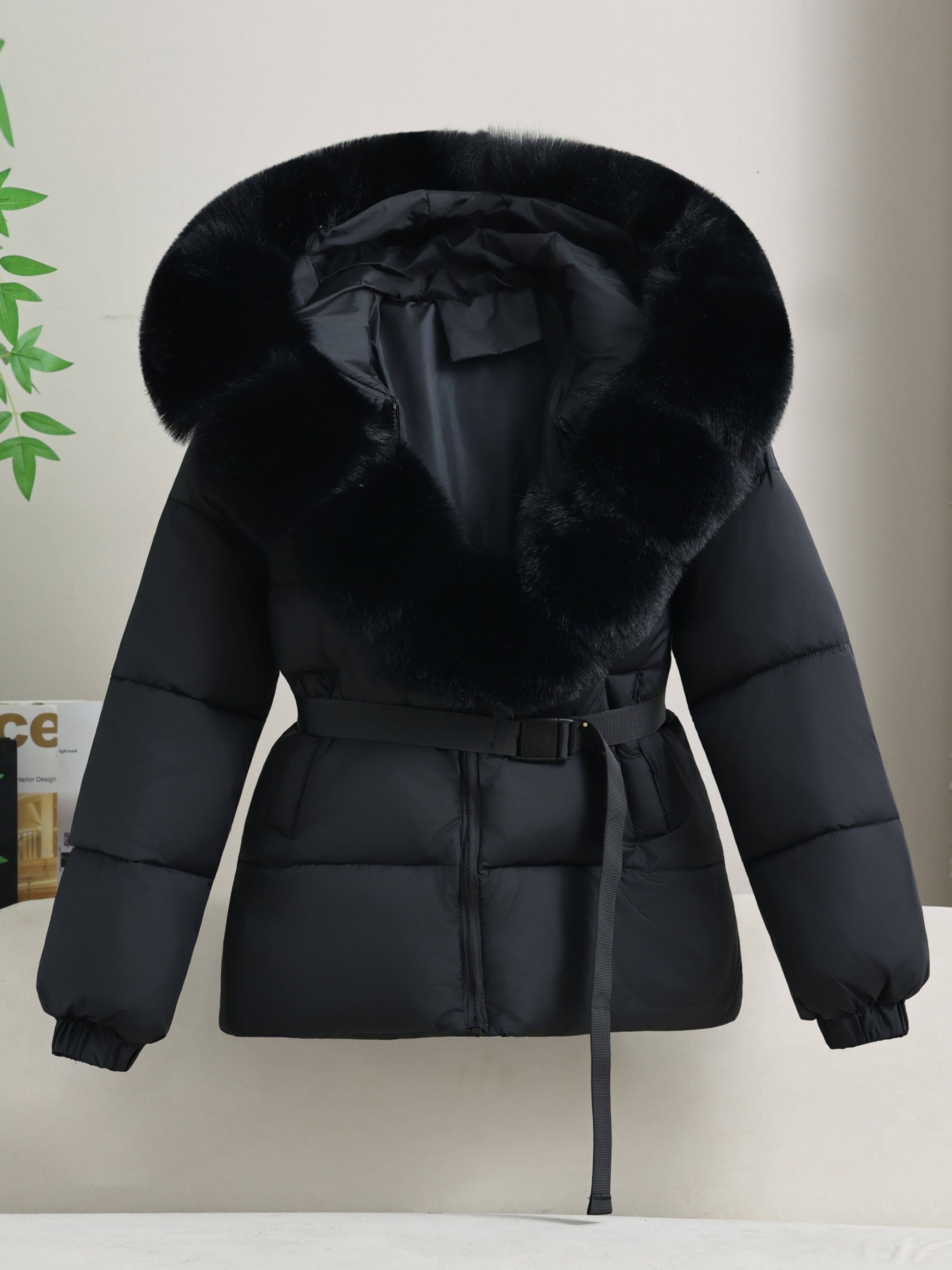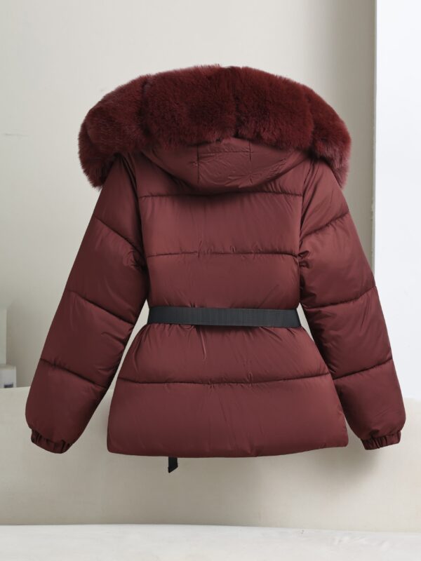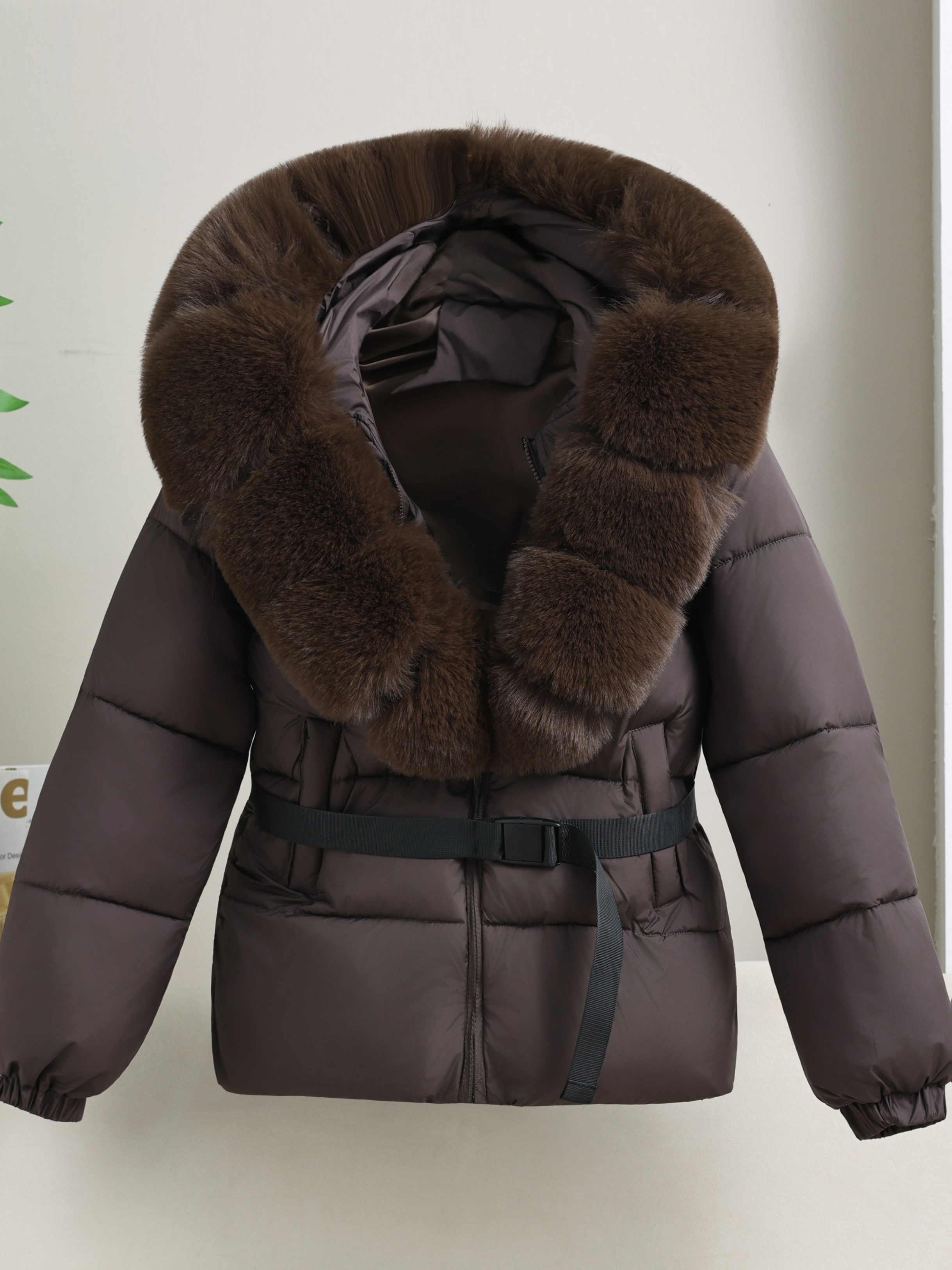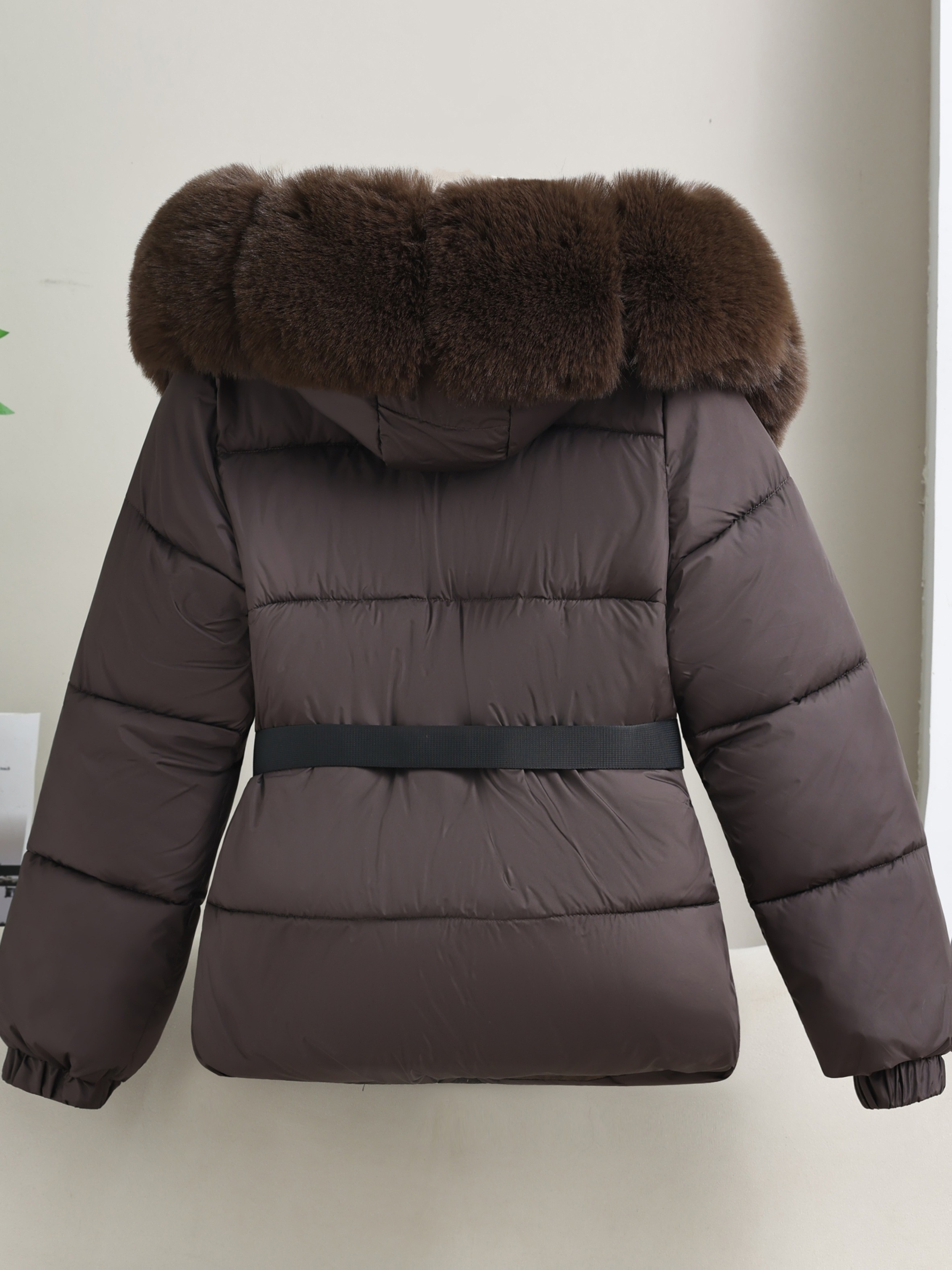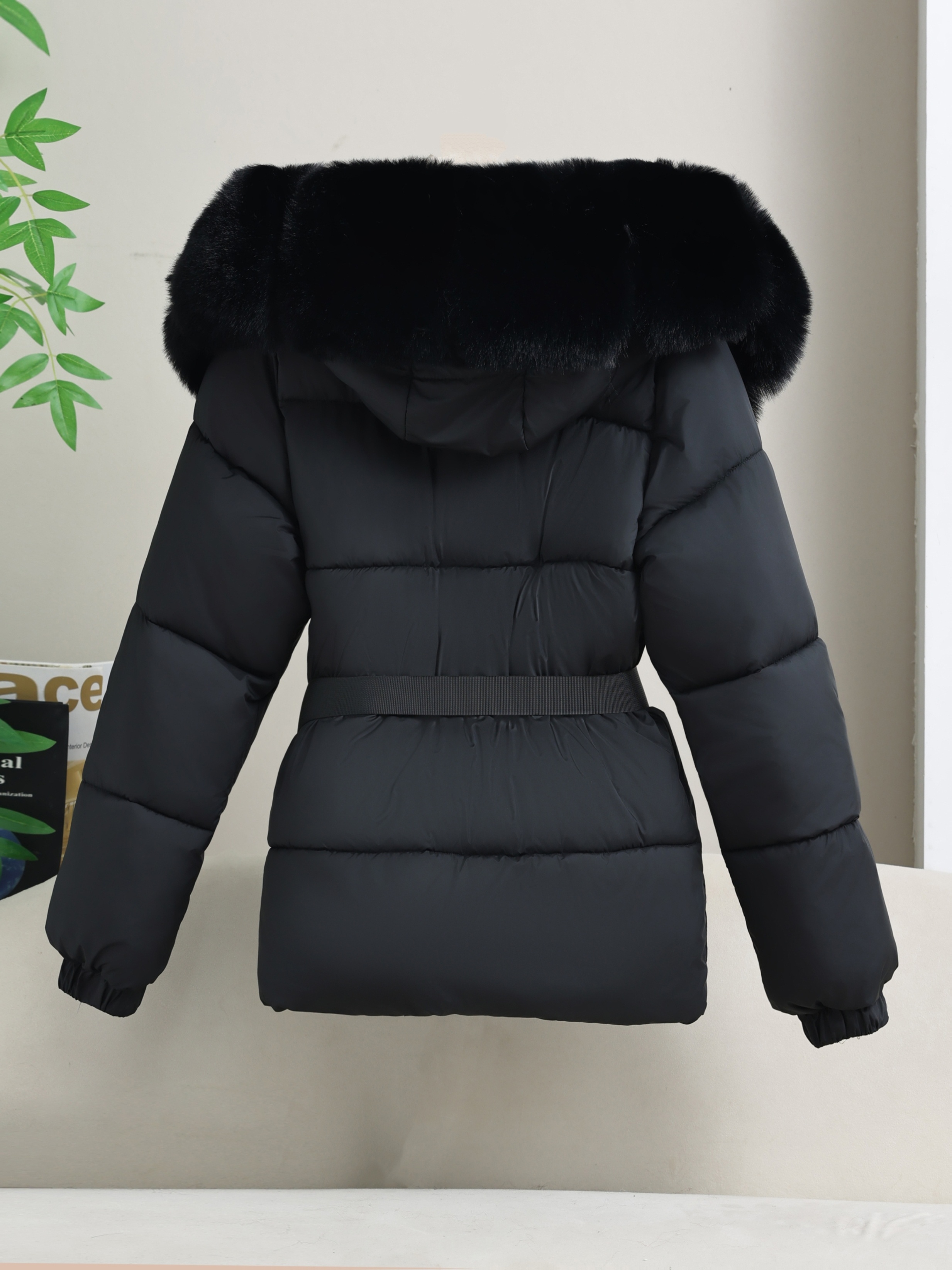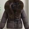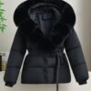 معطف الشتاء النسائي الفاخر: دفء وأناقة لا تضاهى بياقة فرو صناعي مميزة وغطاء رأس قابل للفصل وحزام