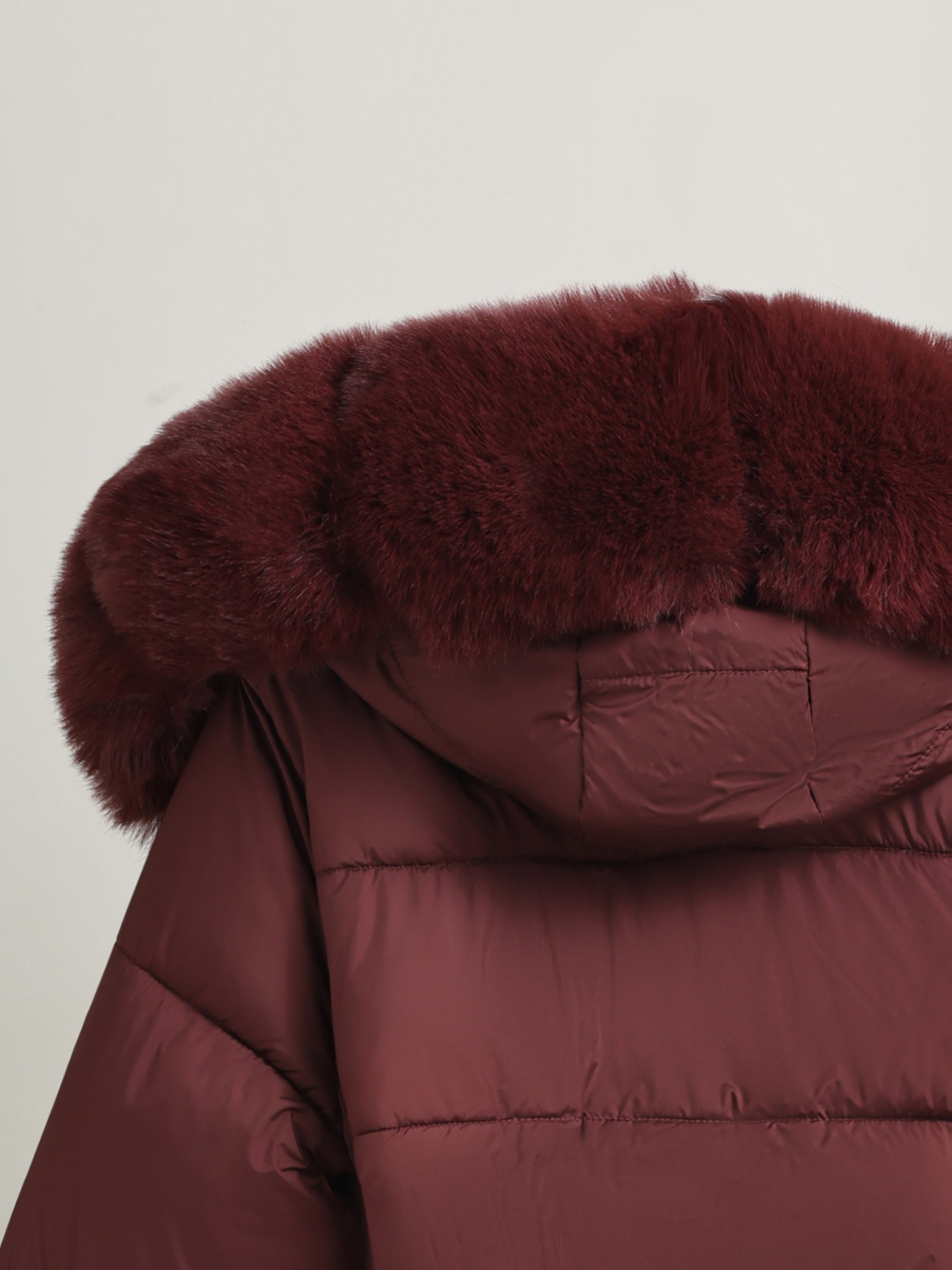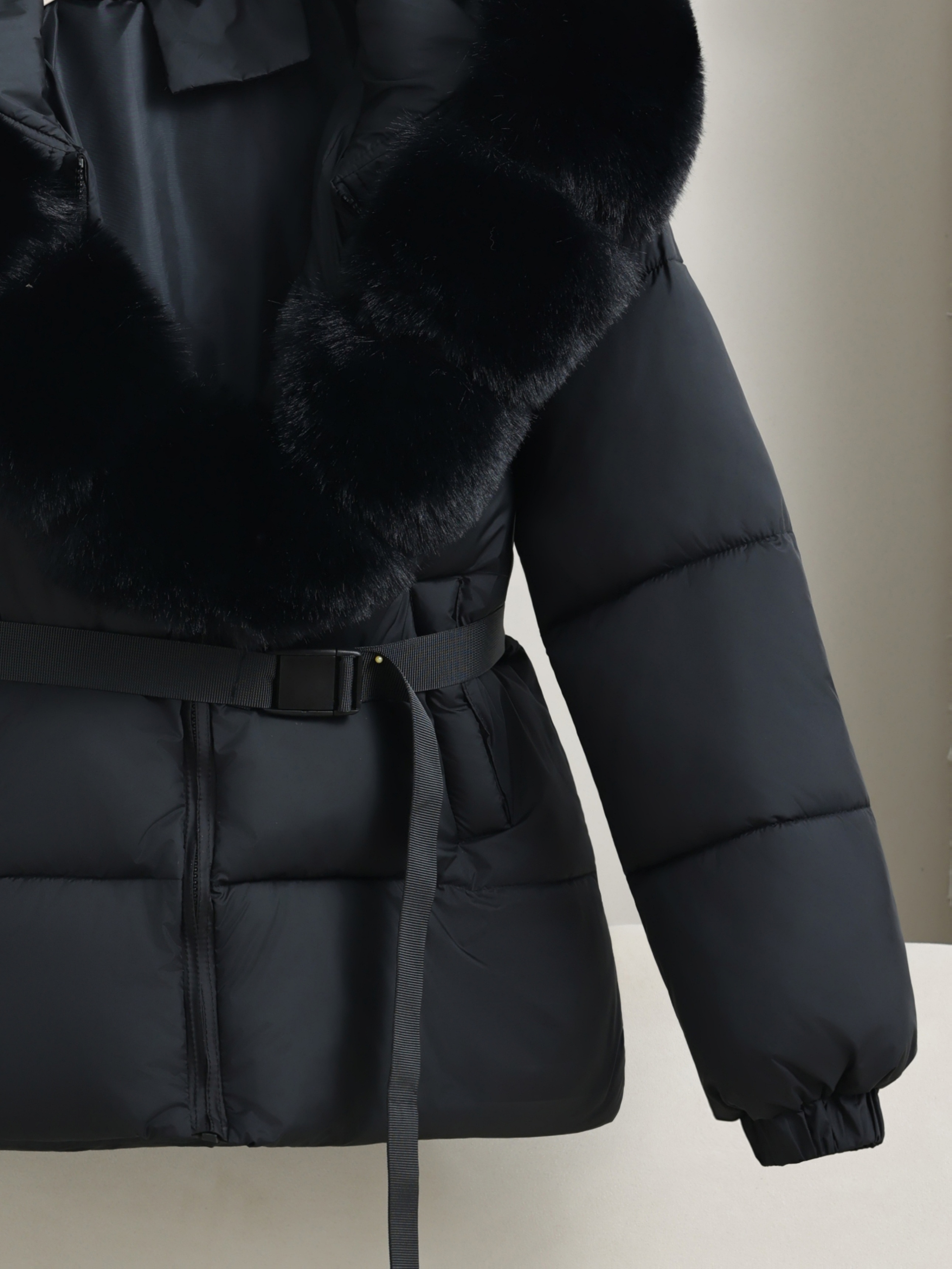 • ياقة الفرو الصناعي الفاخرة: تمتعي بلمسة من الرقي والنعومة مع ياقة فرو صناعي مميزة، تضفي دفئاً جذاباً ومظهراً فخماً دون عناء الصيانة.