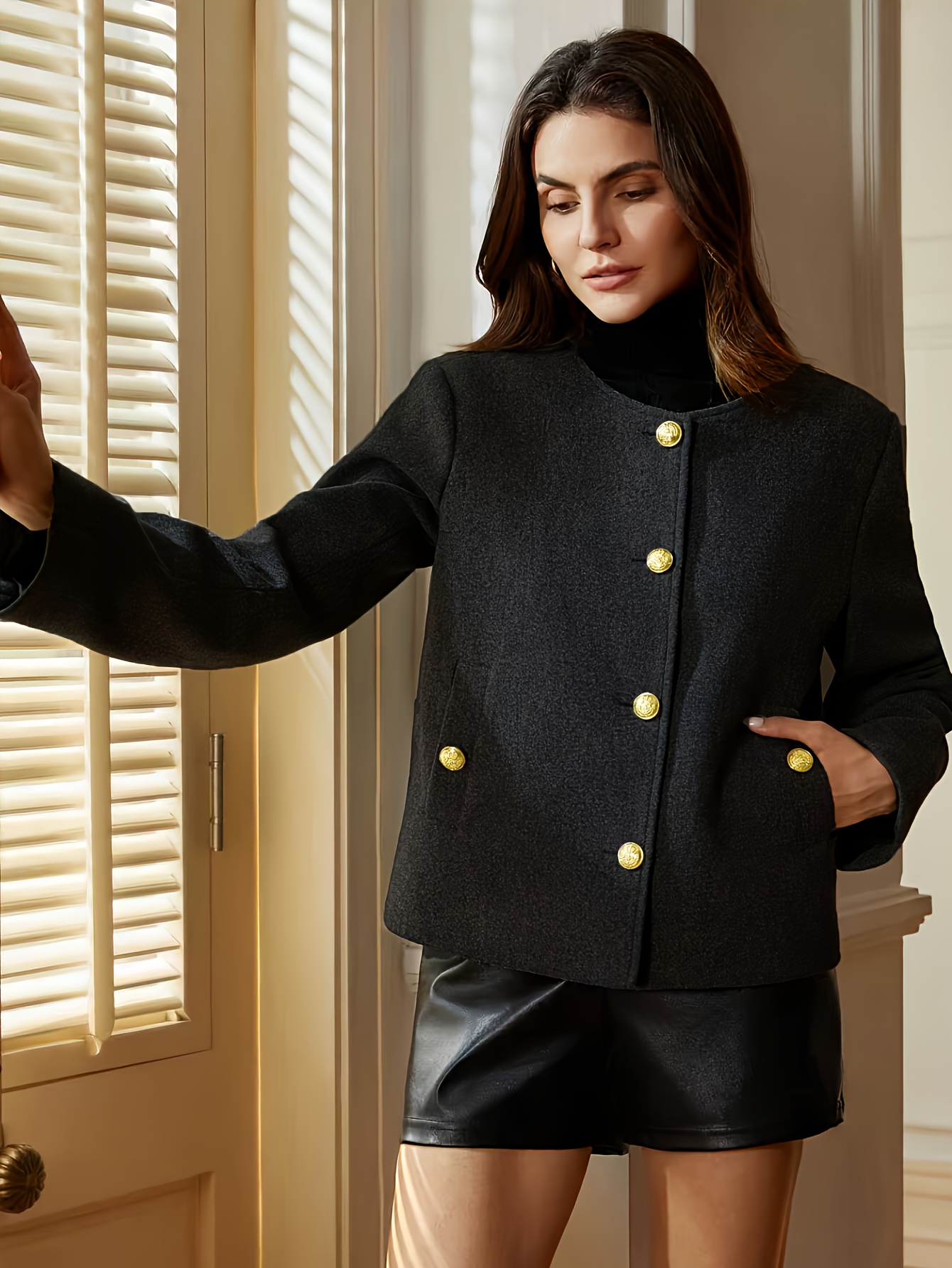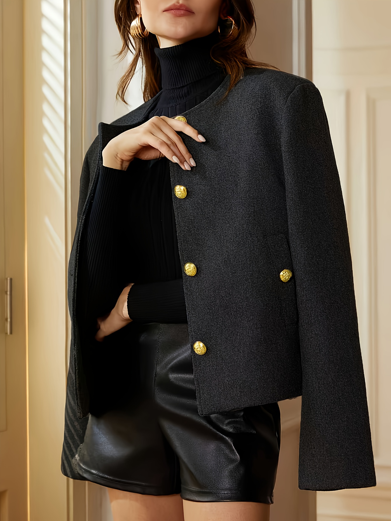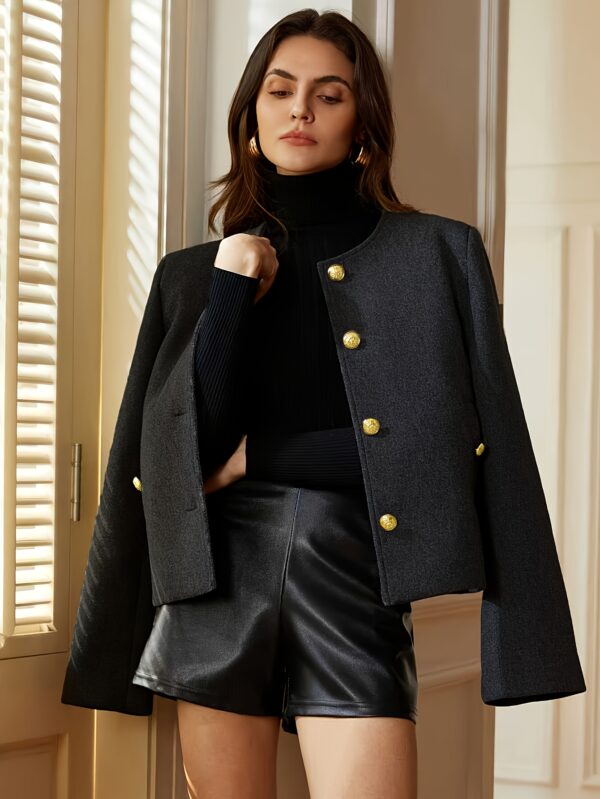 - أزرار ذهبية أنيقة: يتميز بتصميم كلاسيكي بأزرار ذهبية لامعة تضفي لمسة من الفخامة والجاذبية، مما يجعله قطعة مميزة تبرز أناقتكِ.