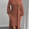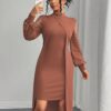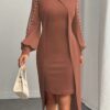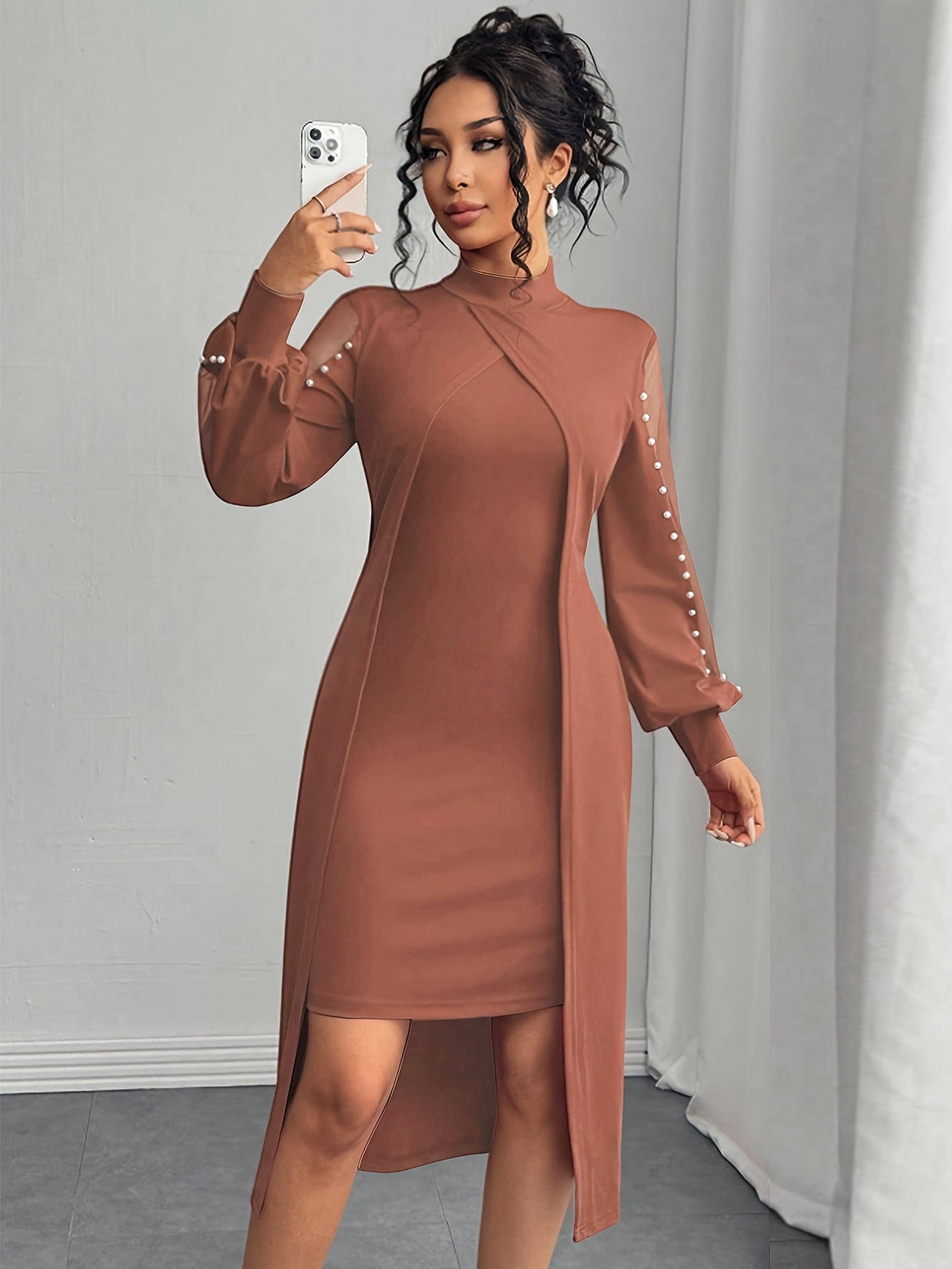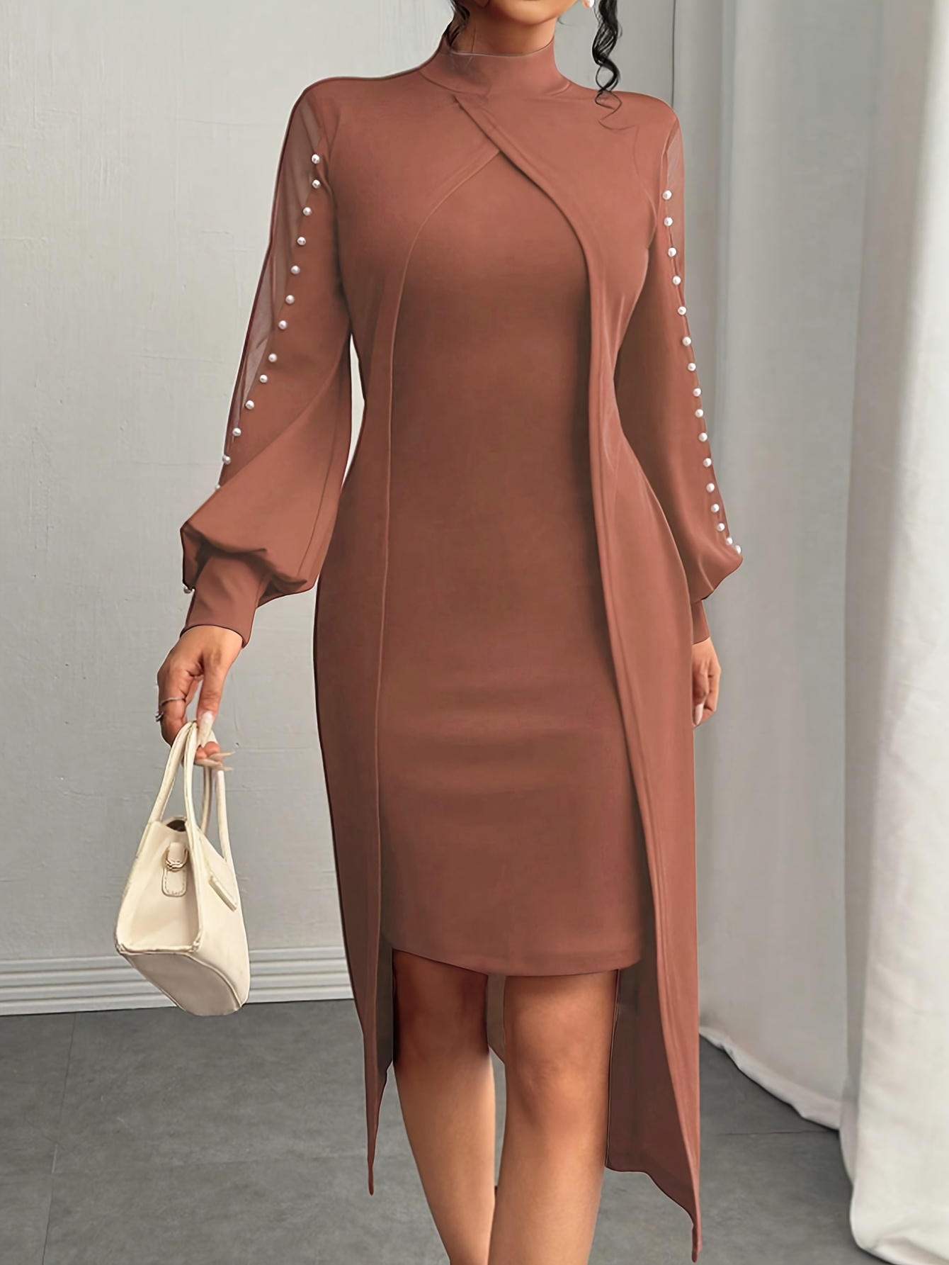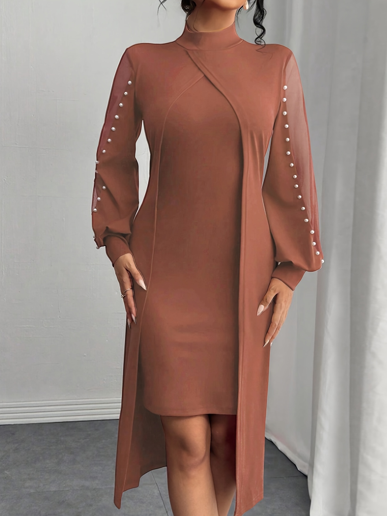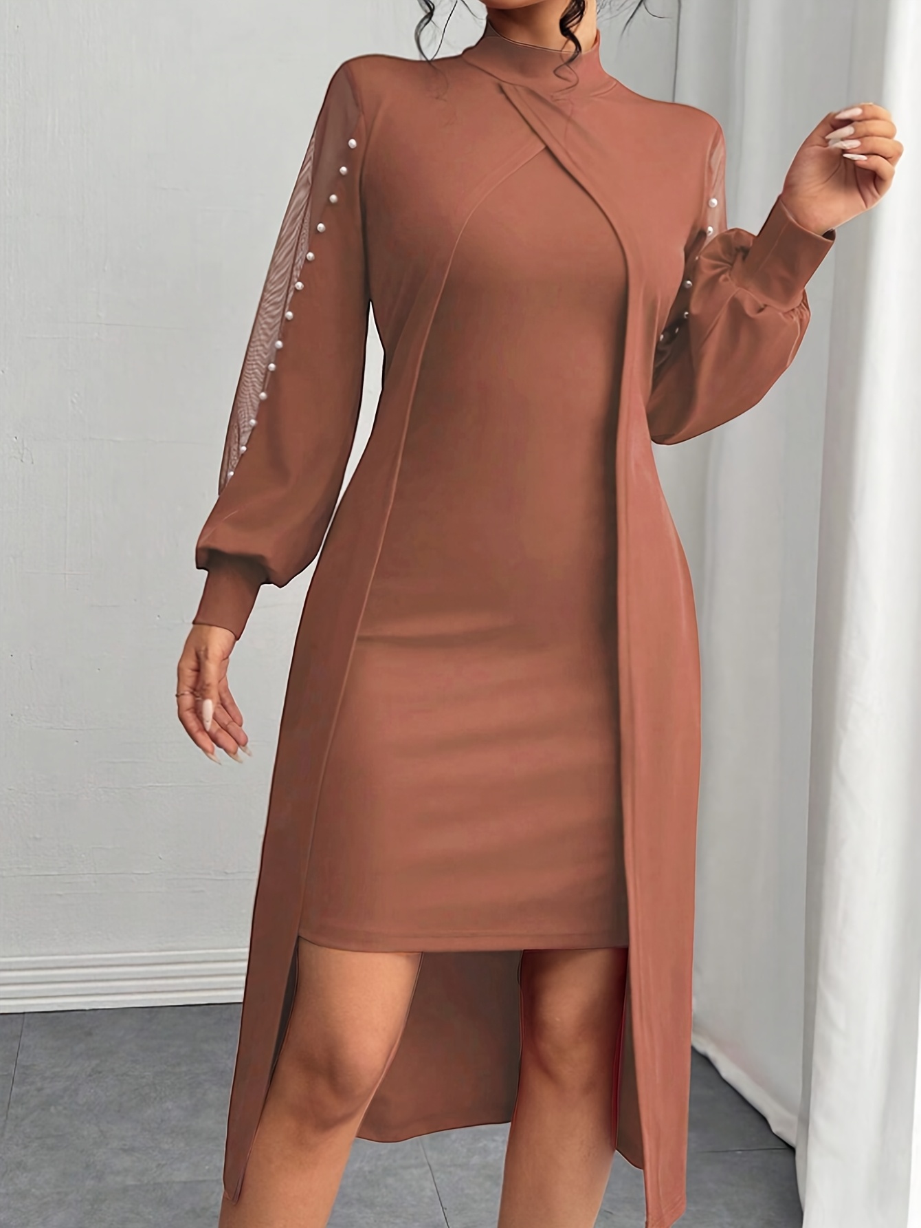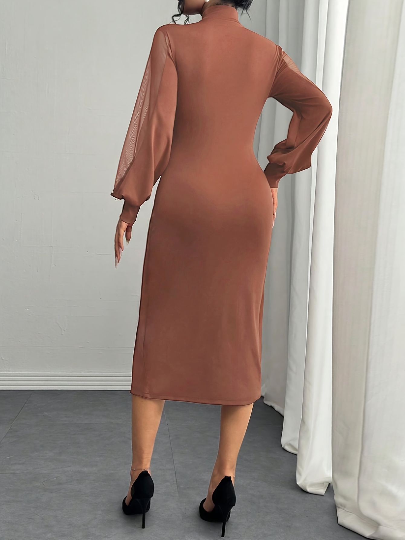 أبهري الجميع بإطلالتك المتألقة مع هذا الفستان النسائي الأنيق ذو الياقة العالية والأكمام الطويلة. مصمم ليجمع بين الرقي والعصرية، يقدم لك هذا الفستان تصميم A-Line الرشيق مع لمسات شبكية متباينة تضيف جرأة وجاذبية لا مثيل لها.