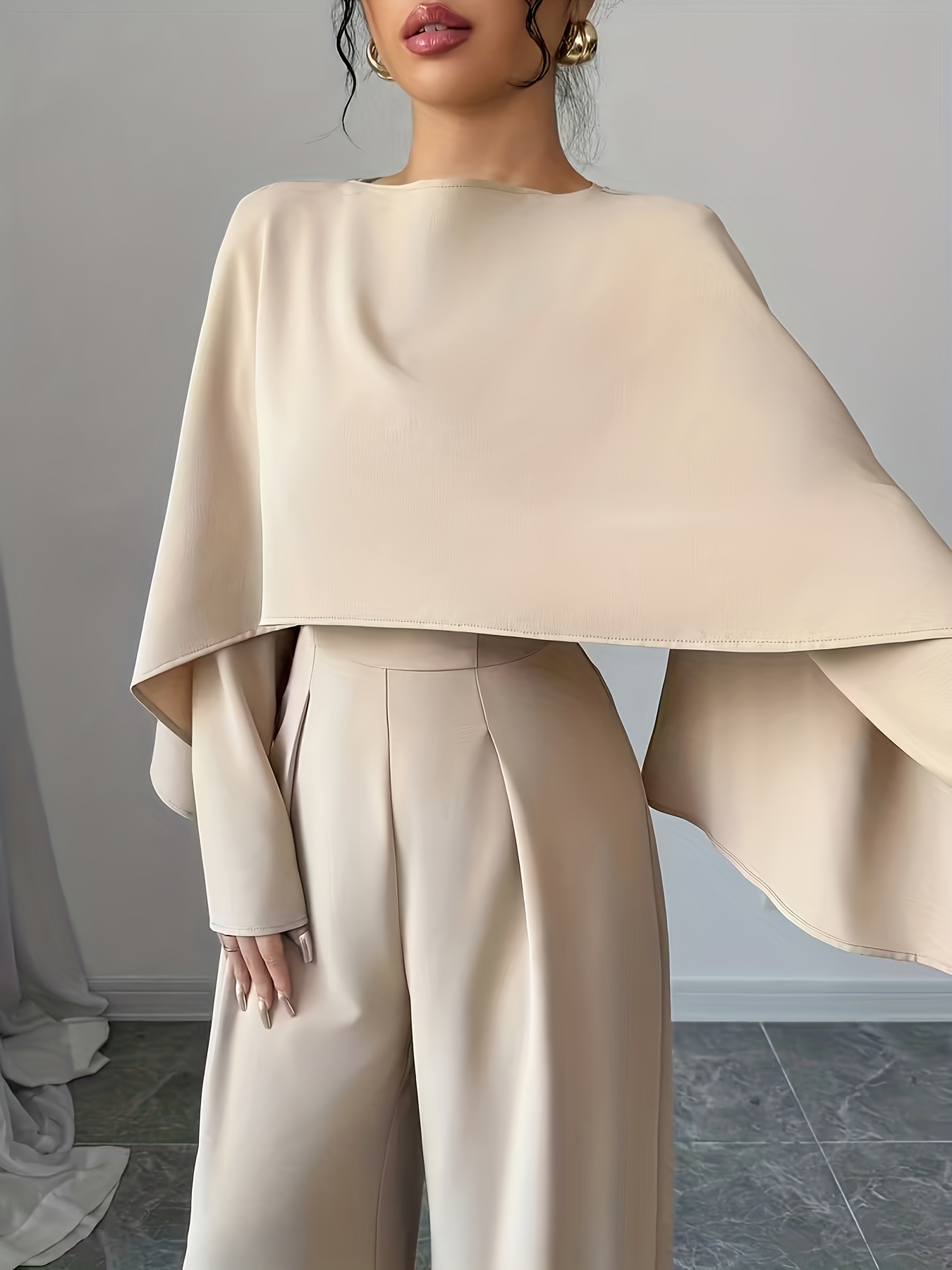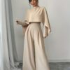 • تصميم أنثوي ساحر: يتميز بخصر عالٍ يبرز جمال قوامك ويمنحك مظهرًا رشيقًا، مع أرجل واسعة (بالازو) تضفي لمسة من الأناقة العصرية والراحة المطلقة في الحركة. تزدان الياقة بتفاصيل كشكشة رقيقة تضفي عليه جاذبية فريدة، وتكتمل أناقته بأكمام طويلة مناسبة لأجواء الخريف والشتاء.