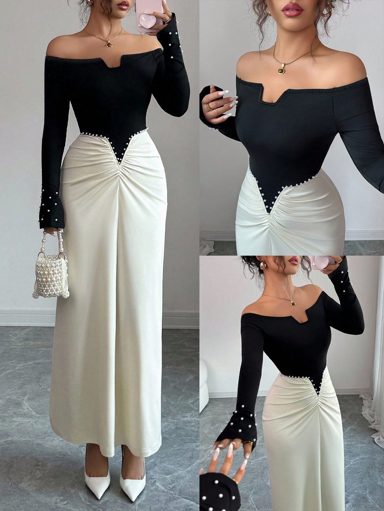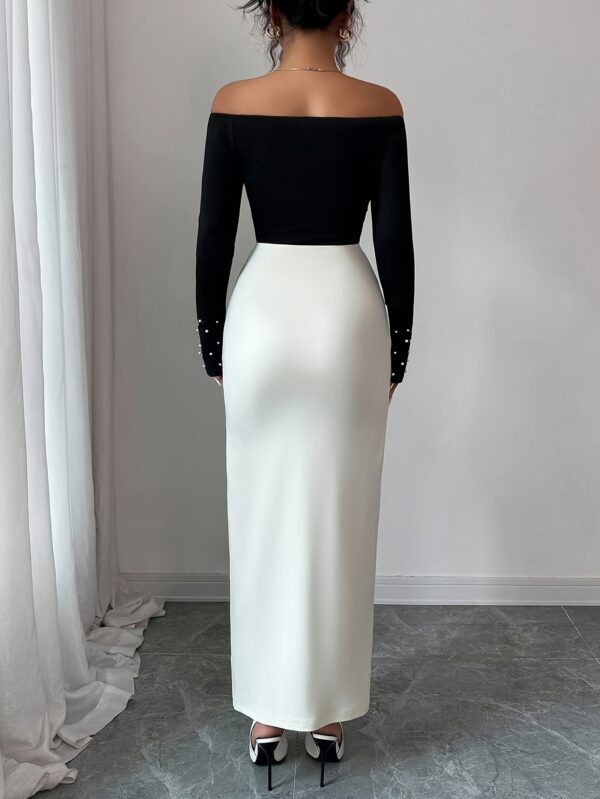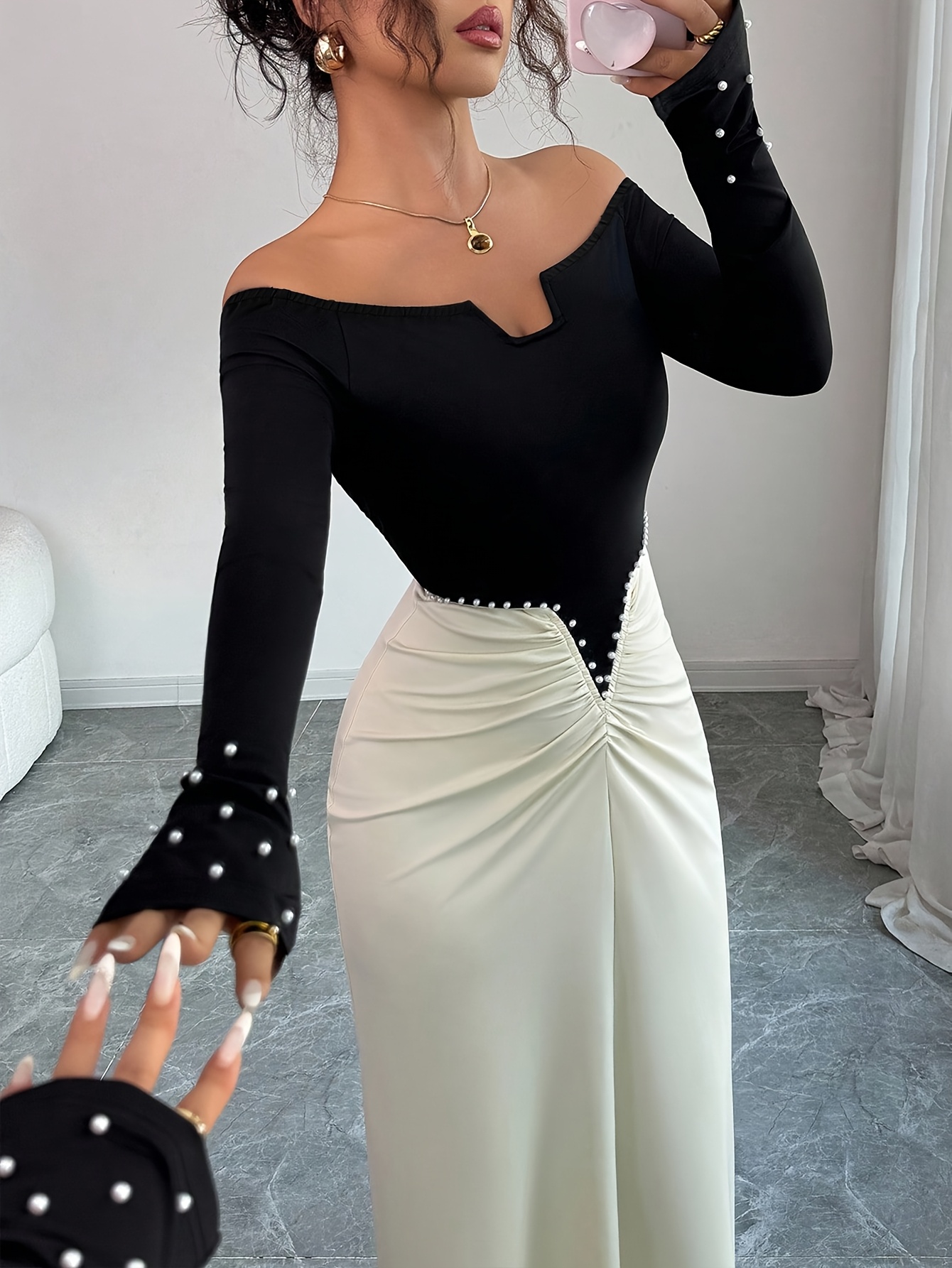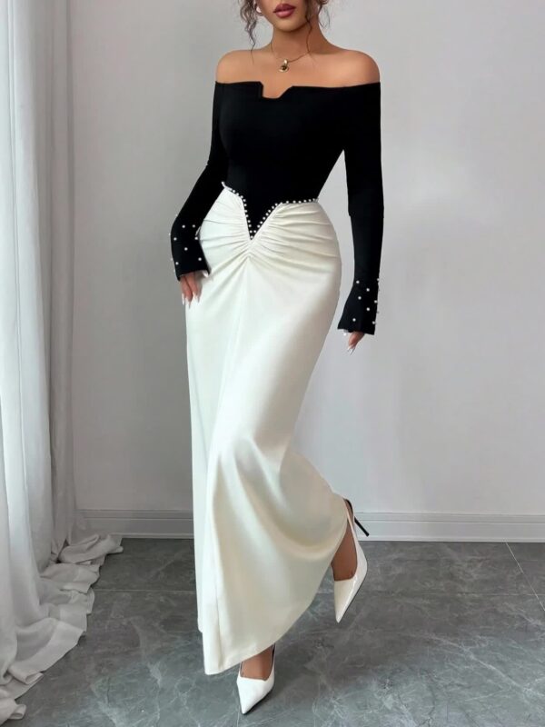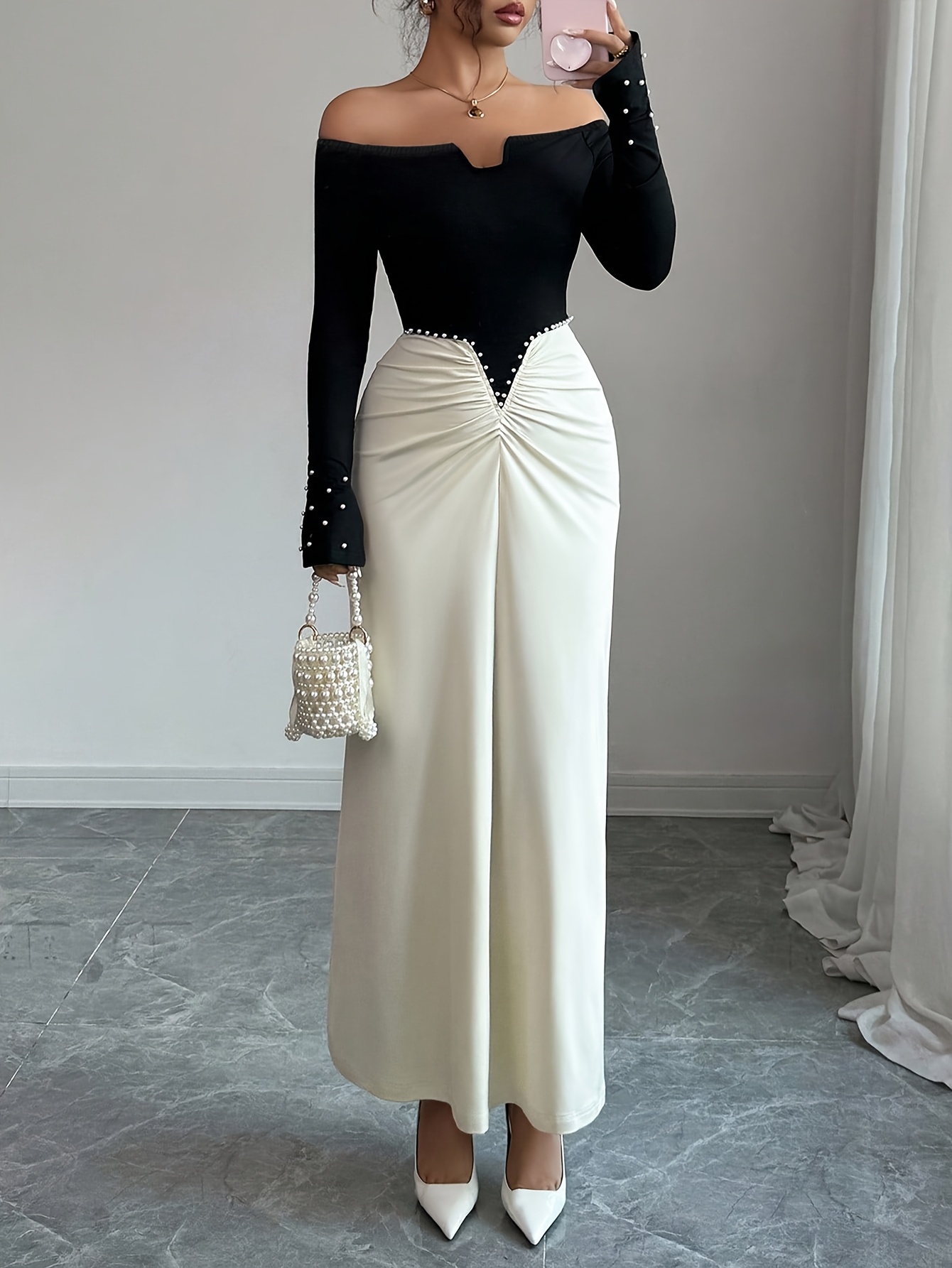 - تطريز لؤلؤي فاخر: تزين حبات اللؤلؤ الفستان بأسلوب متقن، مضيفةً بريقاً خاصاً وفخامة لا تضاهى لتتألقي كالنجمة.