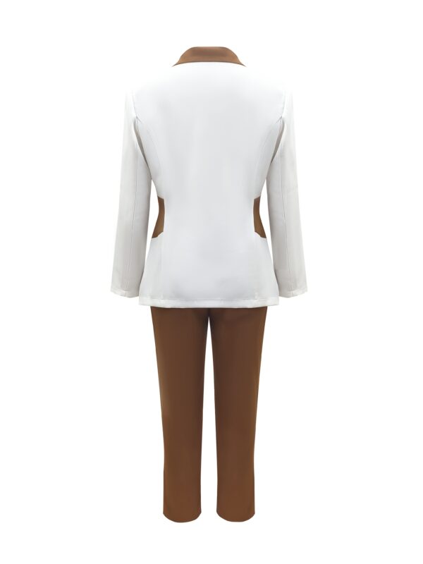 - تصميم الكولور بلوك العصري: يتميز بمزيج أنيق من الألوان يضفي لمسة جريئة ومميزة، مع سترة كلاسيكية بياقة مطوية وسروال مريح، ليضمن لكِ حضورًا لافتًا وملفتًا للأنظار.