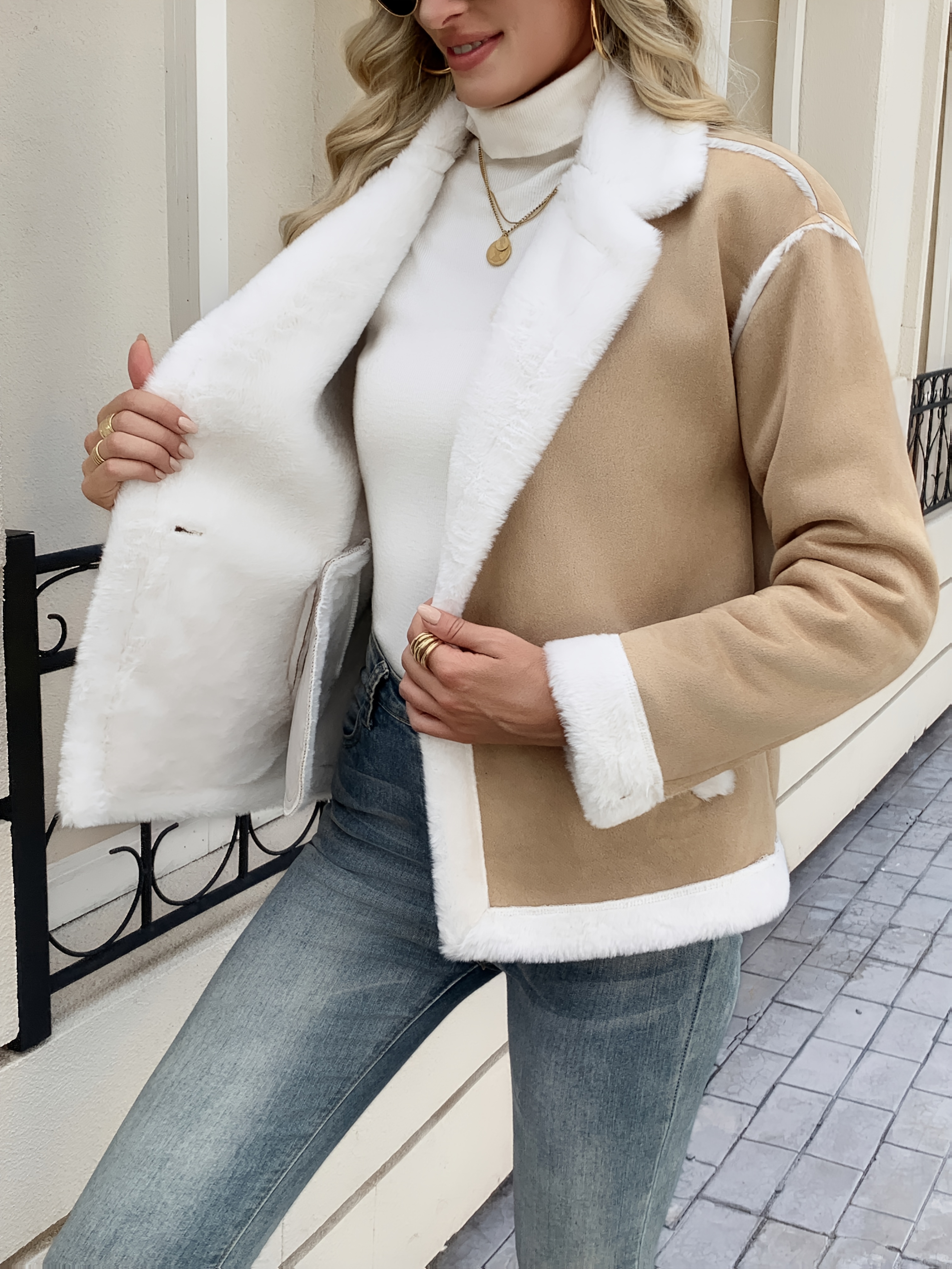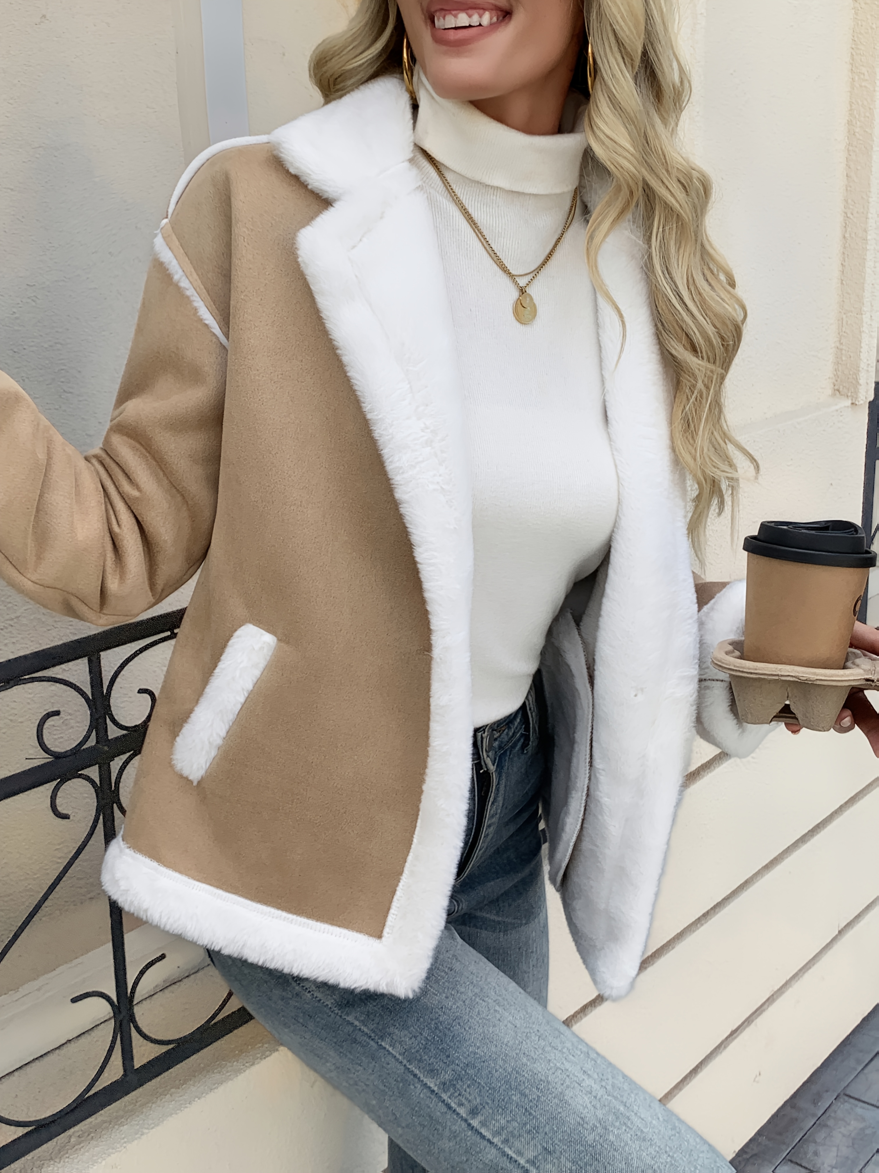 - تصميم يجمع بين الفخامة والعملية: يتميز المعطف بتصميم أنيق ومحدد، مع ياقة مطوية فاخرة وتفاصيل جذابة شبيهة بالفرو باللونين البيج والأبيض، ليمنحك إطلالة راقية في كل مرة ترتدينه.