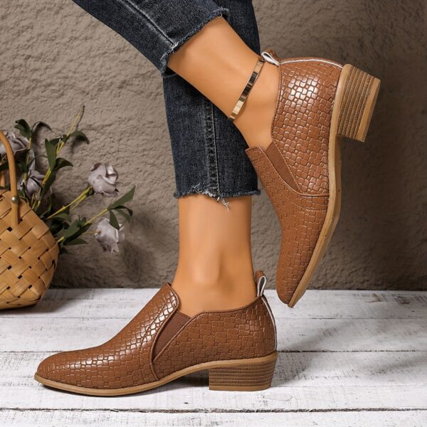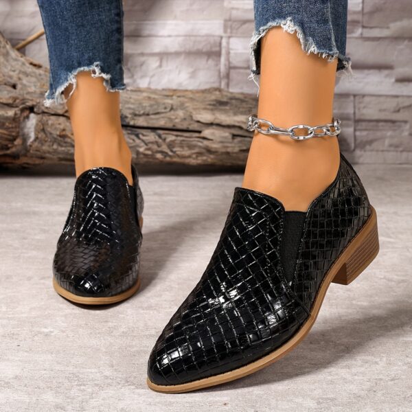 اخطفي الأنظار وتألقي بأناقة لا مثيل لها مع حذاء الكعب المنخفض المدبب المصمم خصيصاً للمرأة العصرية. يجمع هذا الحذاء بين الرقي والراحة المطلقة، ليصبح إضافة لا غنى عنها لخزانة ملابسك، ويناسب كل مناسباتك من اجتماعات العمل إلى اللقاءات الكاجوال.