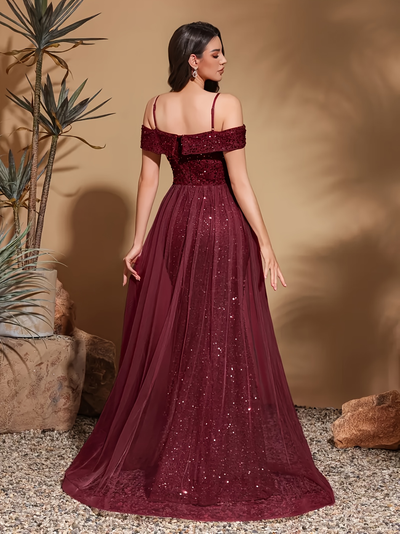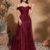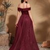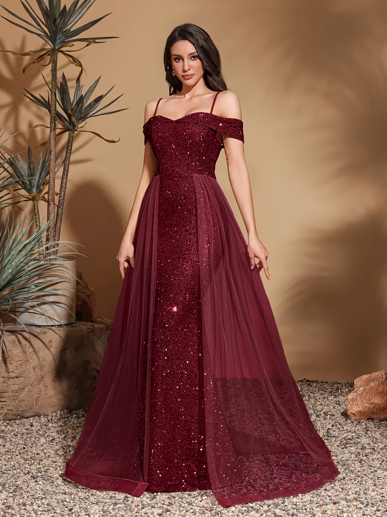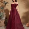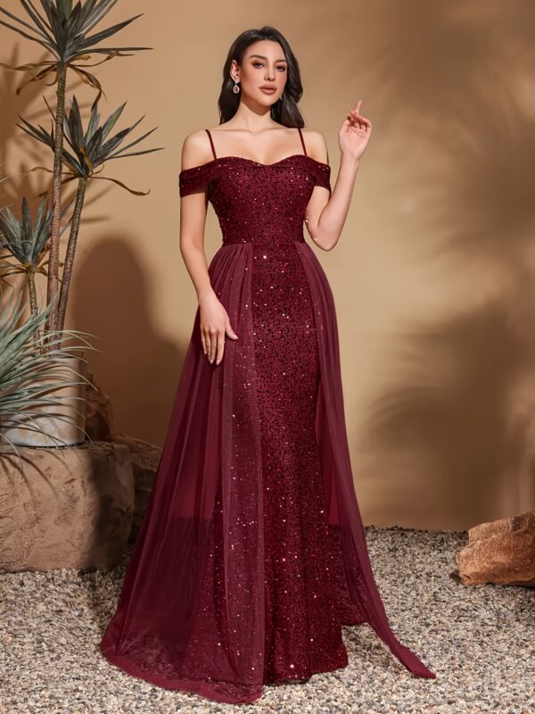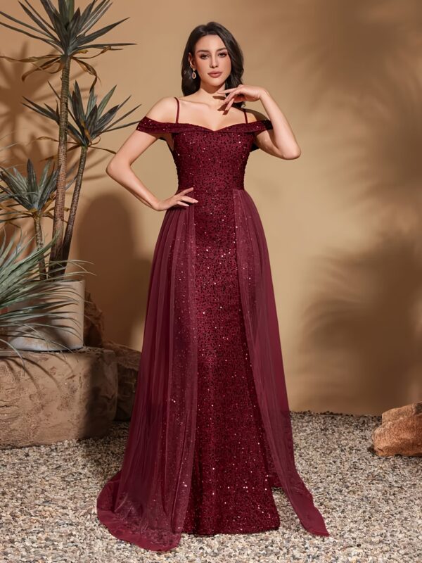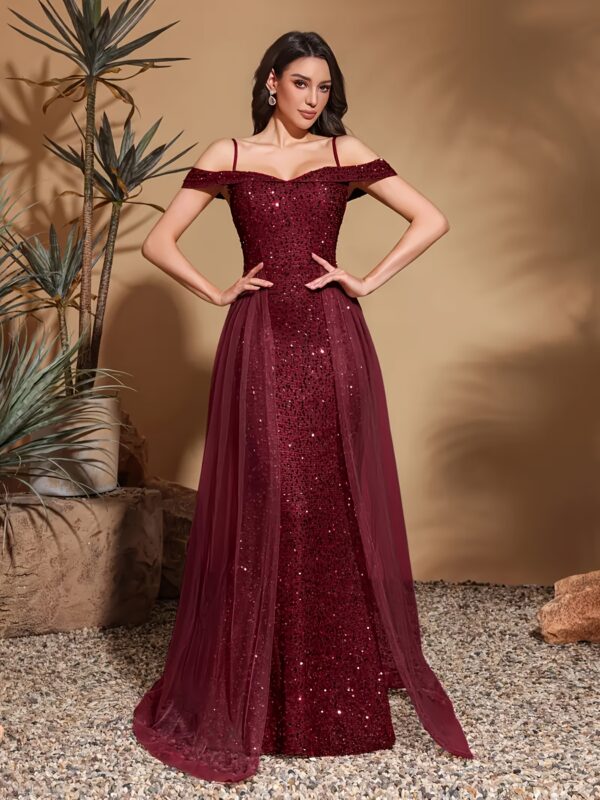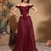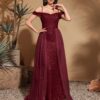 - لمعان ساحر: تزينه تفاصيل الترتر اللامع الذي يتلألأ مع كل حركة، مما يجعلك محط الأنظار في أي حفل زفاف، سهرة، حفل تخرج أو مناسبة خاصة. اللون البورغندي العميق يزيد من فخامة الإطلالة.