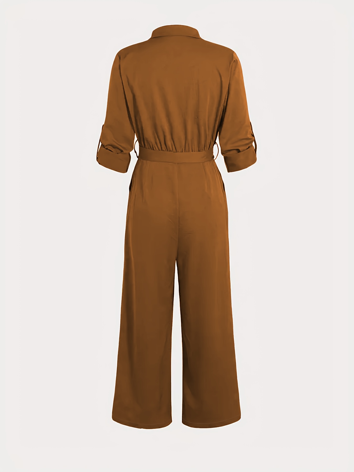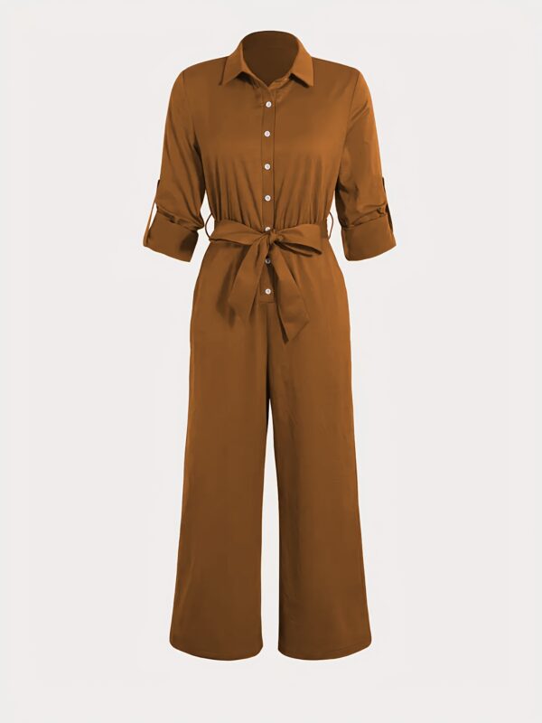 - تصميم عصري وأنيق: بقصة واسعة للأرجل وياقة مدببة أنيقة، وأكمام منفوخة تضفي لمسة من الرقي والتميز. اللون البني السادة يضمن لكِ إطلالة كلاسيكية فاخرة لا تخطئها العين.
