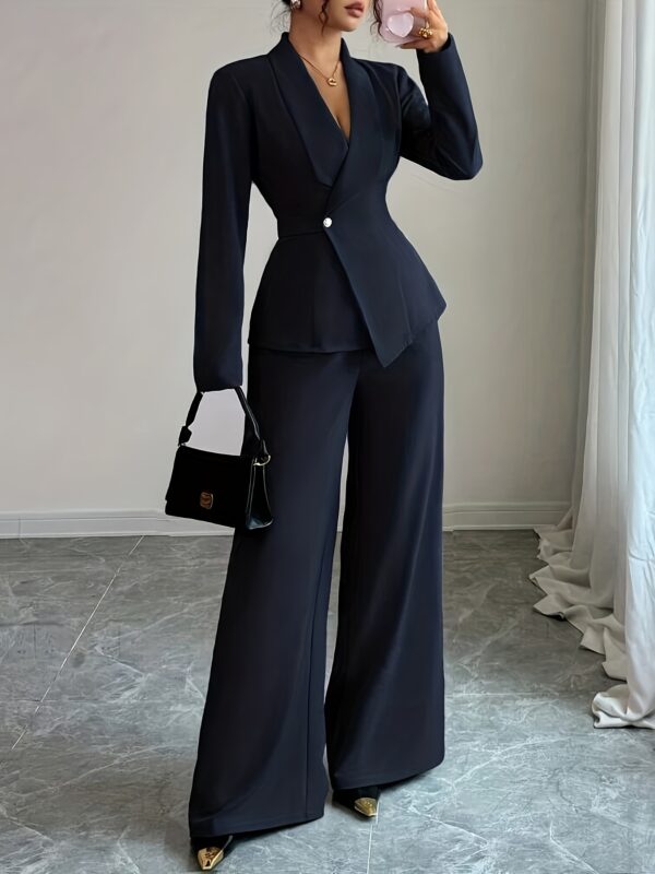 - تصميم راقٍ ومميز: يتميز البليزر بياقة كلاسيكية عريضة وقصة V-Neck أنيقة، مع أكمام طويلة وأزرار تفصيلية تضفي لمسة من الفخامة. الحزام المرفق يحدد الخصر برشاقة ليمنحكِ قوامًا جذابًا ومصقولًا.