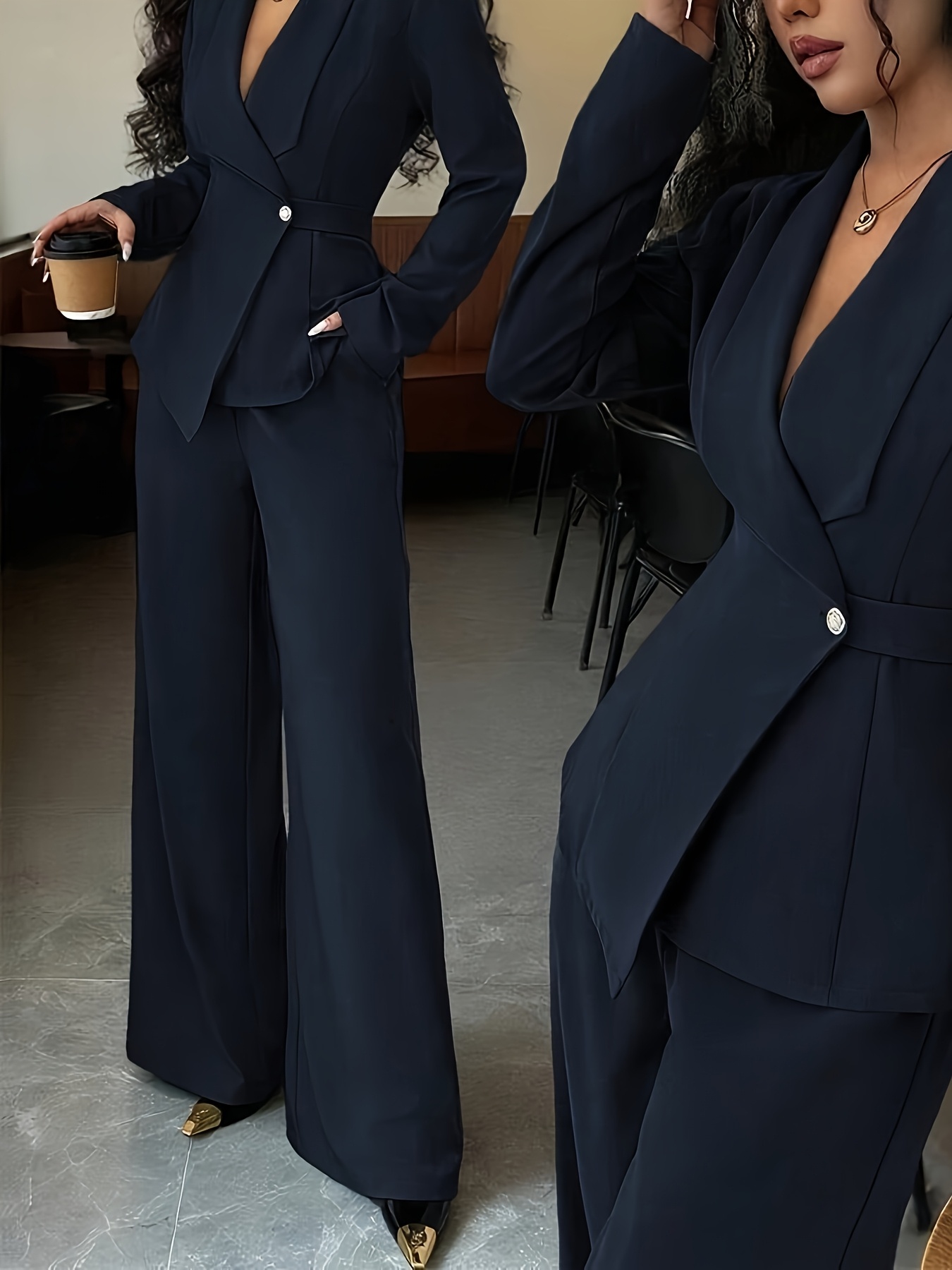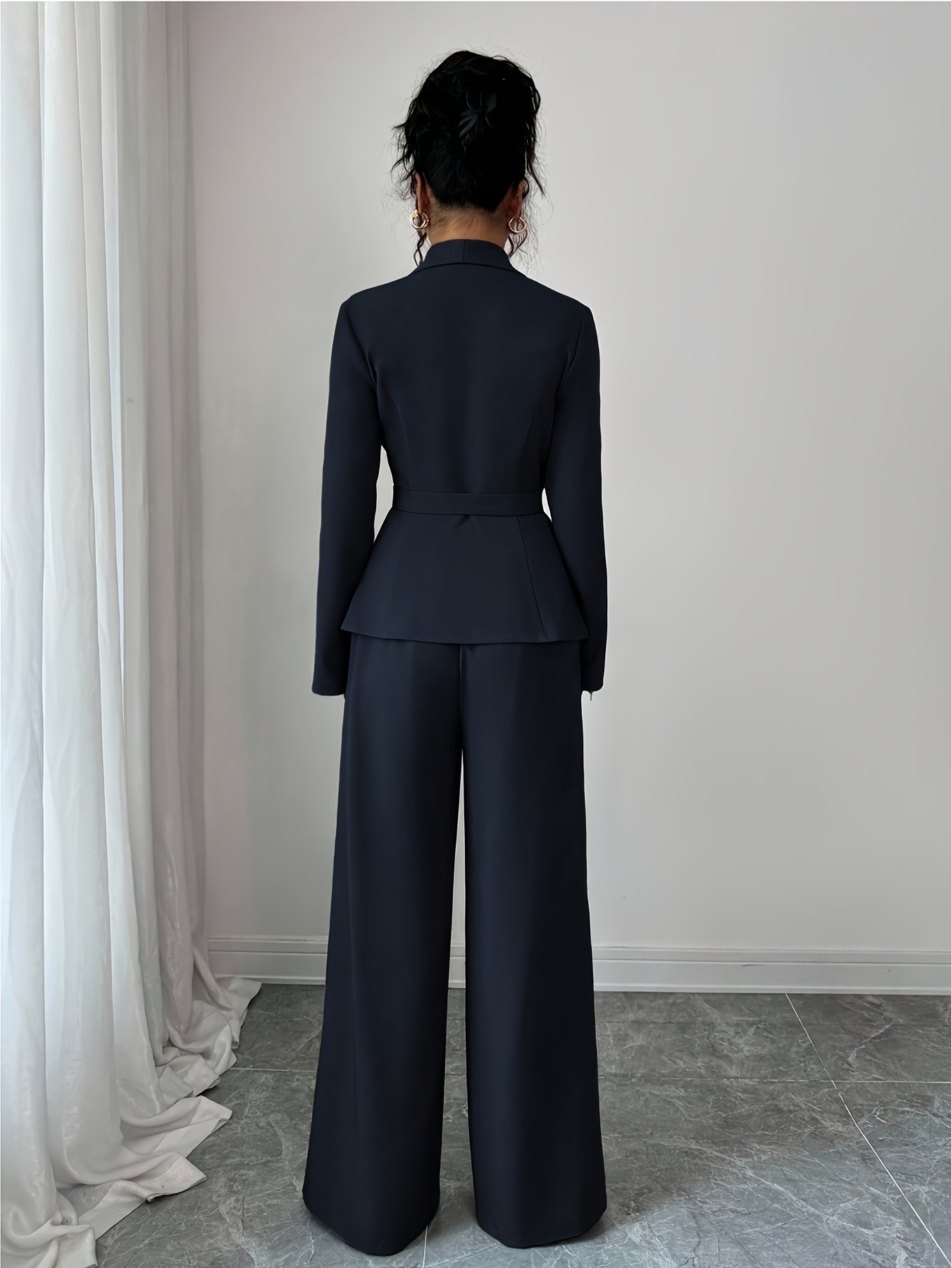 - تصميم راقٍ ومميز: يتميز البليزر بياقة كلاسيكية عريضة وقصة V-Neck أنيقة، مع أكمام طويلة وأزرار تفصيلية تضفي لمسة من الفخامة. الحزام المرفق يحدد الخصر برشاقة ليمنحكِ قوامًا جذابًا ومصقولًا.