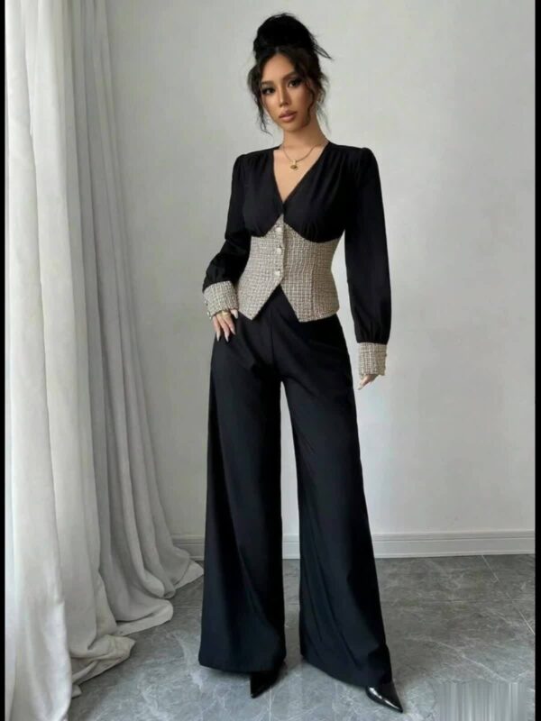 - تصميم كلاسيكي وعصري: يتميز الجاكيت بقصة أنيقة وياقة V جذابة، وأكمام منفوخة طويلة تضفي لمسة أنثوية ساحرة، بالإضافة إلى تفاصيل أزرار راقية. يكتمل الطقم ببنطال واسع الساق يوفر حركة مريحة وأناقة لا مثيل لها، مع نقشة Houndstooth التي تضفي لمسة فاخرة لا تخطئها العين.
