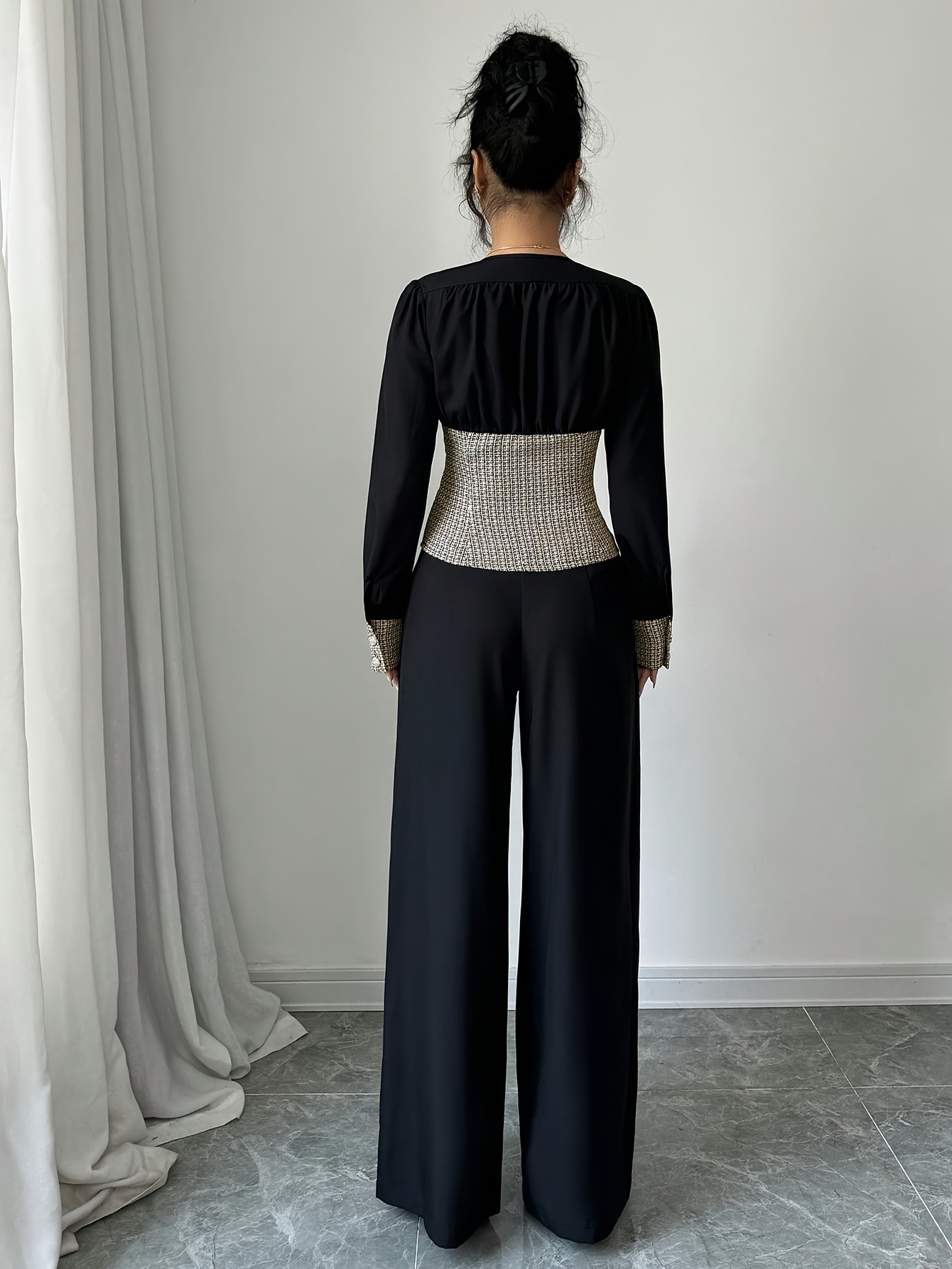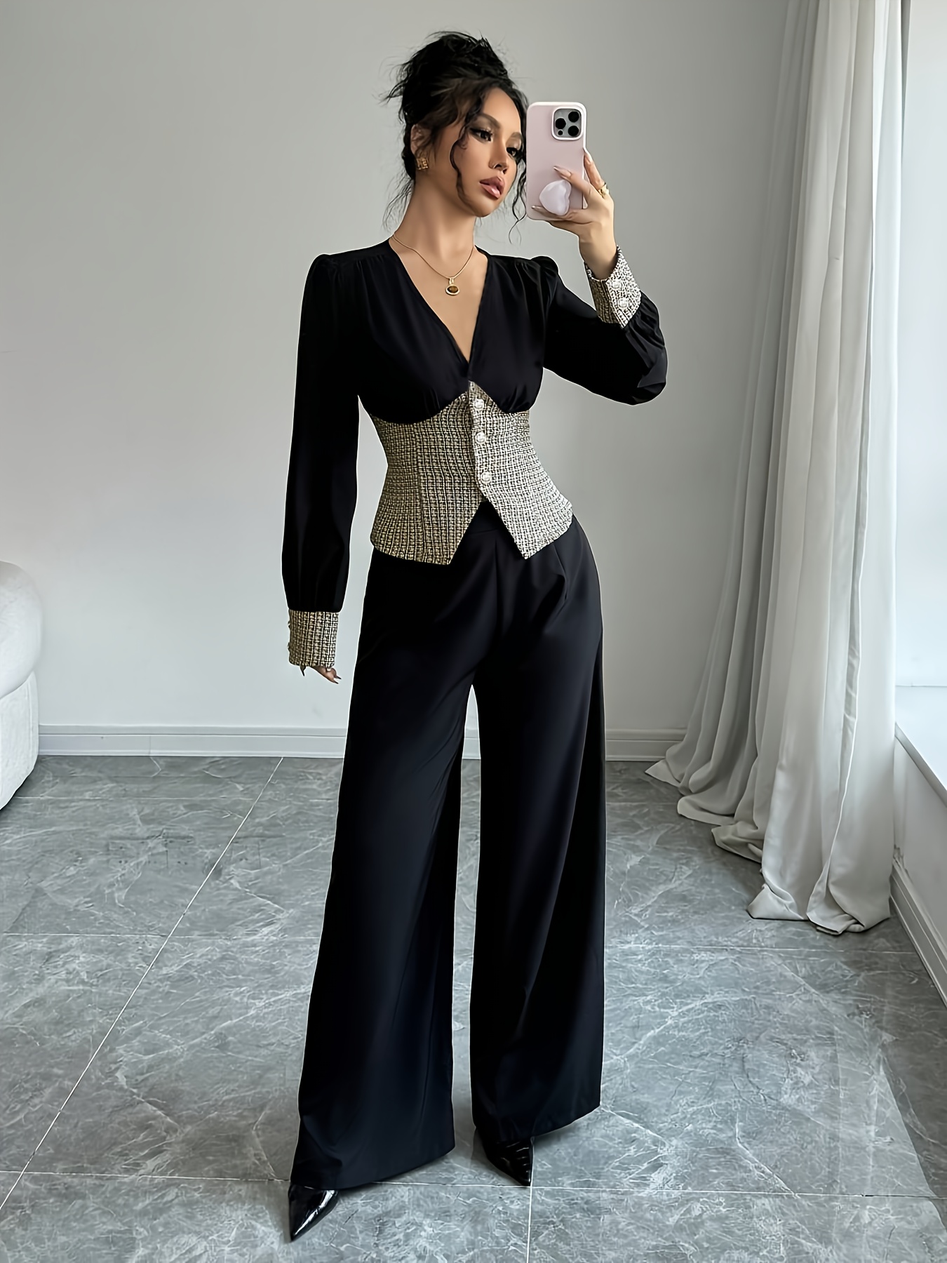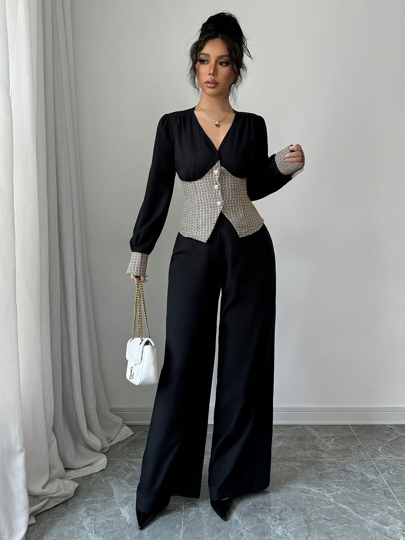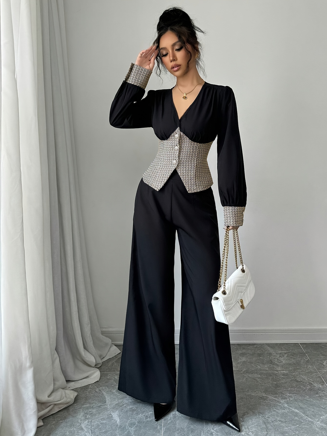 - تصميم كلاسيكي وعصري: يتميز الجاكيت بقصة أنيقة وياقة V جذابة، وأكمام منفوخة طويلة تضفي لمسة أنثوية ساحرة، بالإضافة إلى تفاصيل أزرار راقية. يكتمل الطقم ببنطال واسع الساق يوفر حركة مريحة وأناقة لا مثيل لها، مع نقشة Houndstooth التي تضفي لمسة فاخرة لا تخطئها العين.